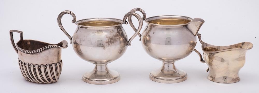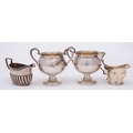 A Sterling silver pedestal cream jug and matching sugar basin, stamped marks: a Victorian silver cream jug with half reeded decoration together with another small silver cream jug, total weight of silver 262gms, 8.43ozs. (4).