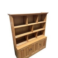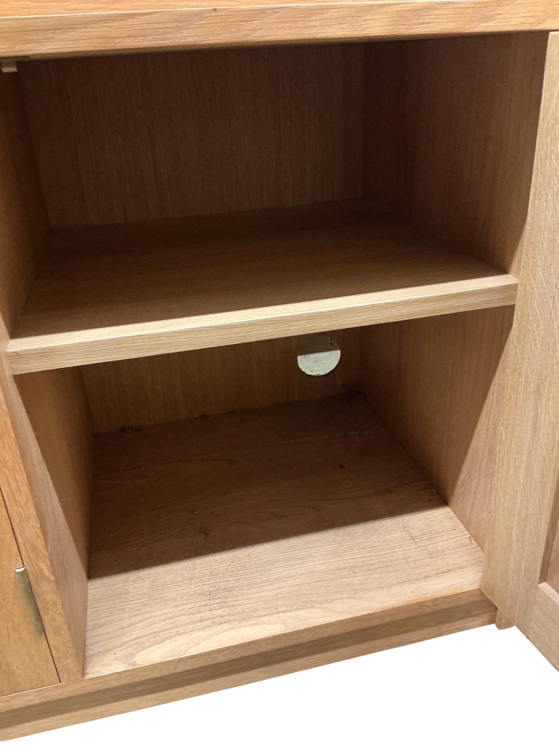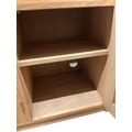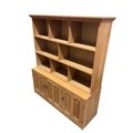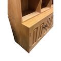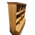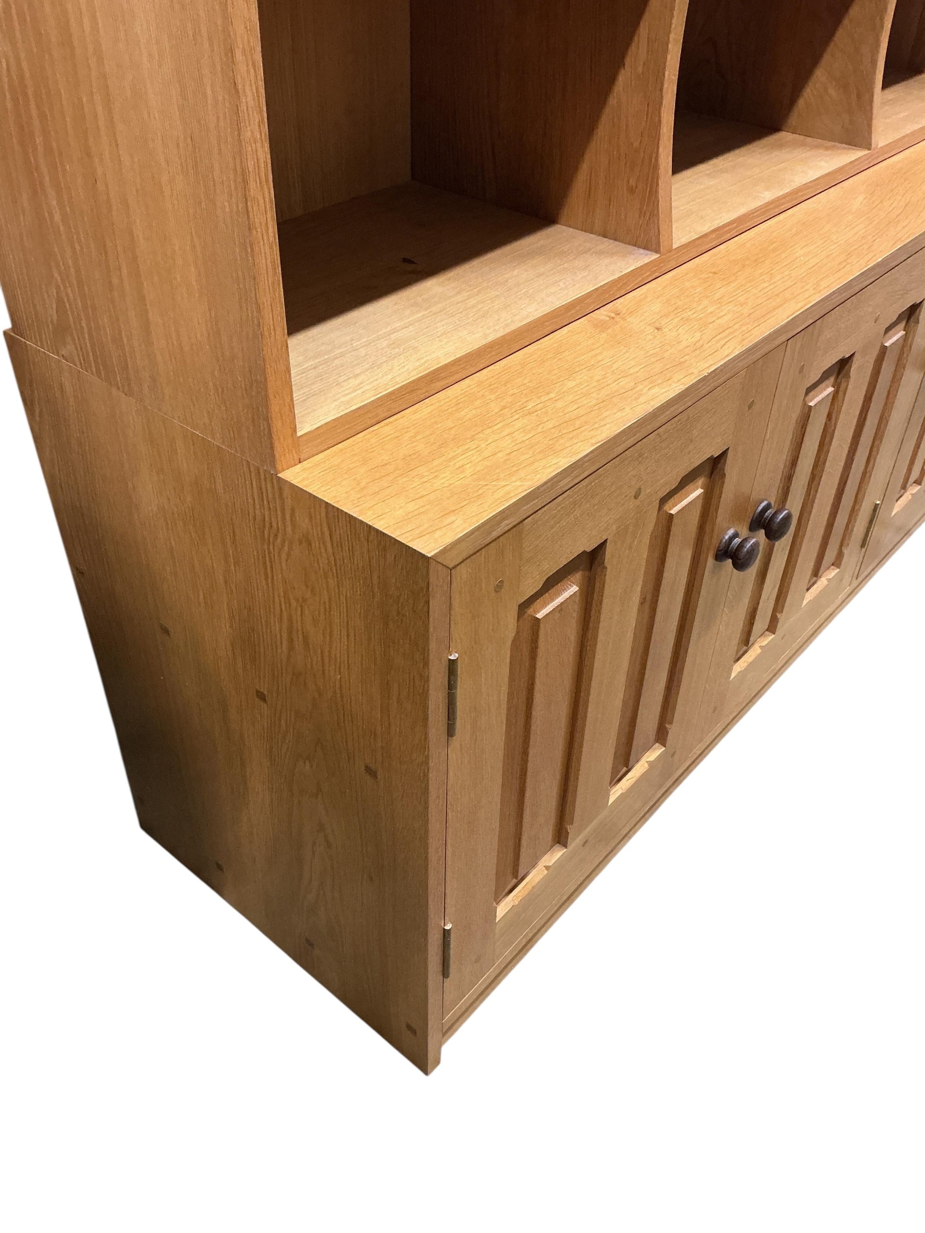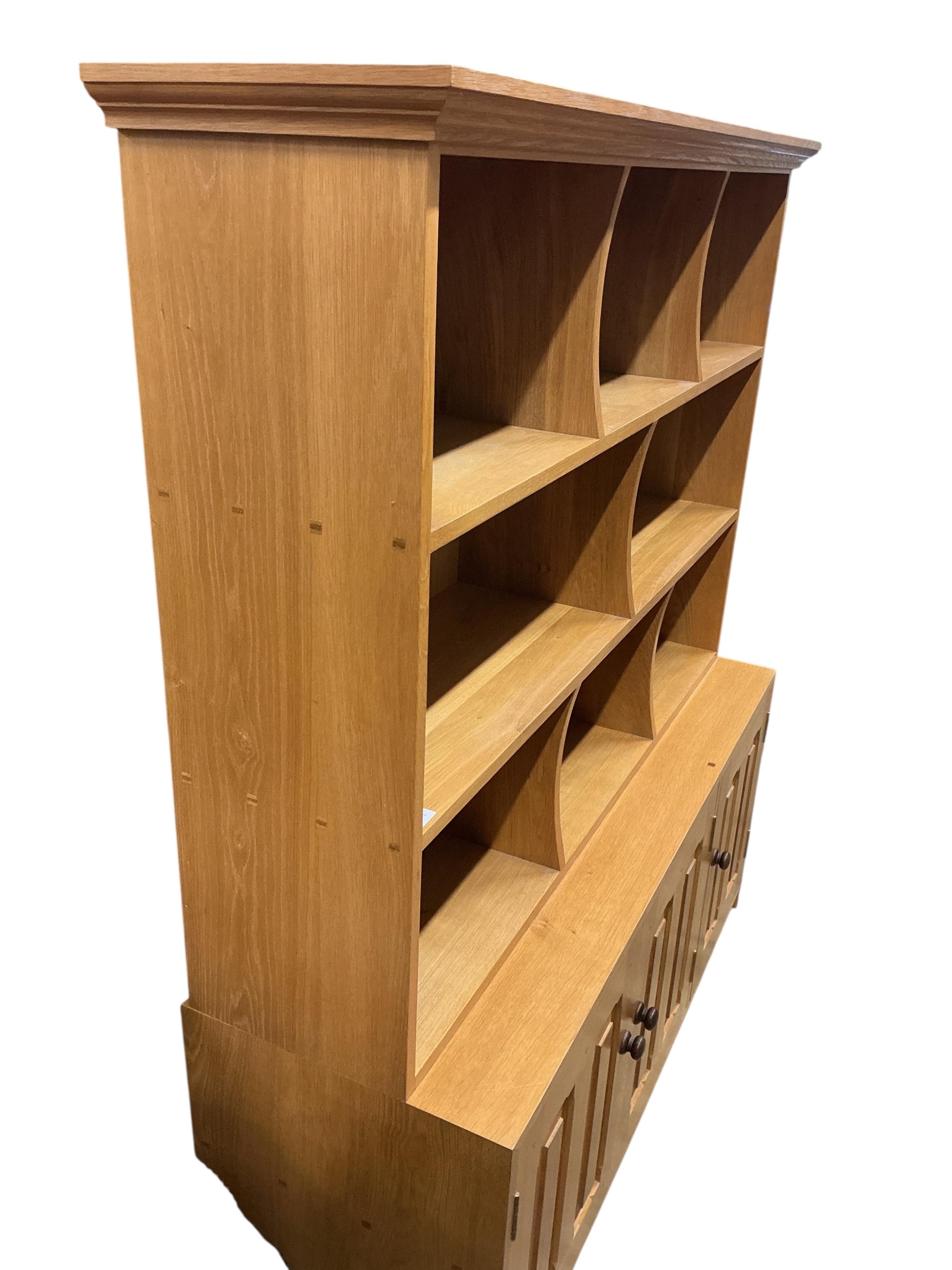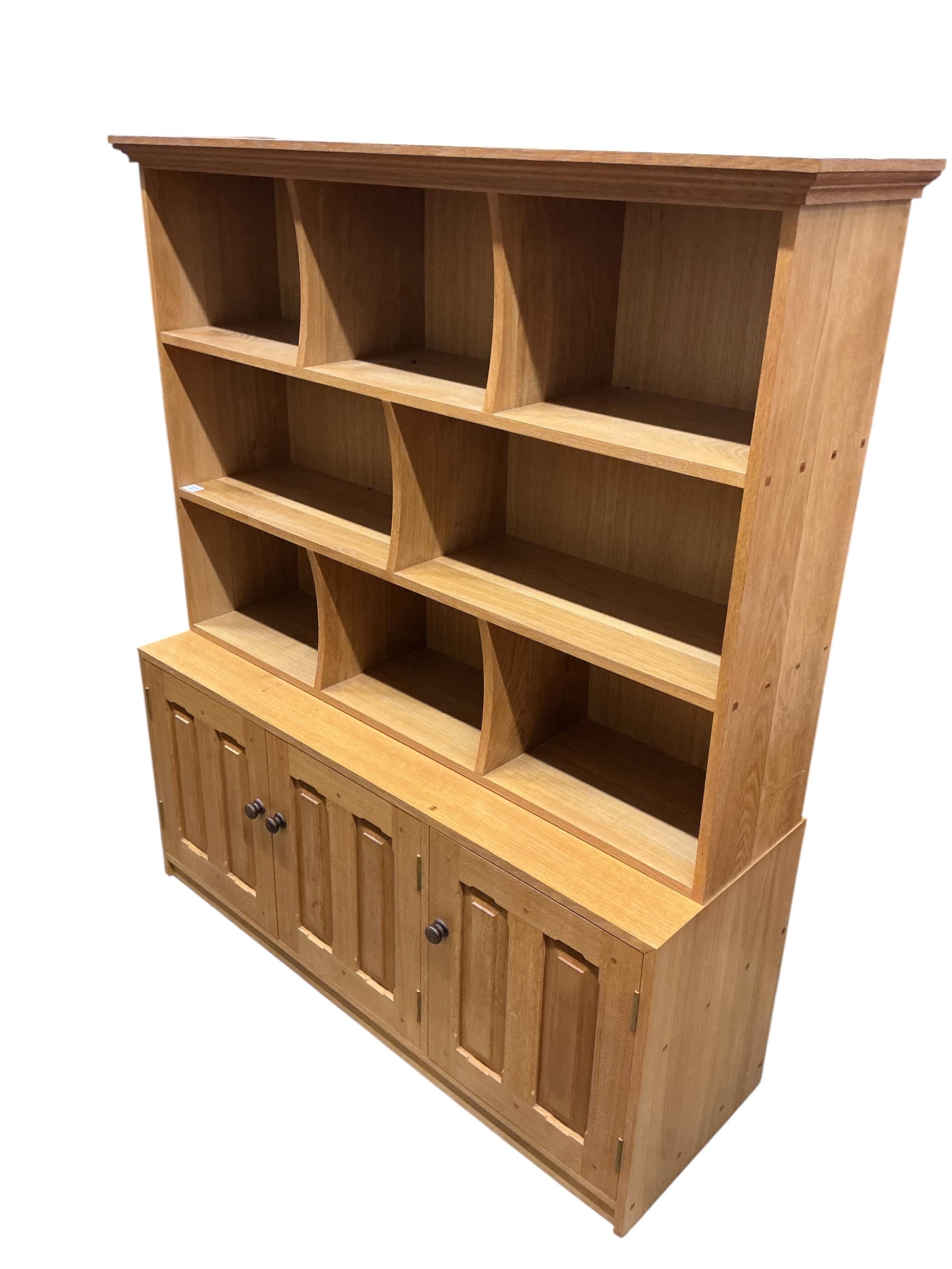 A Contemporary bespoke oak open bookcase, cupboards below, width 141cm, depth 46cm, height 169cm