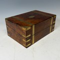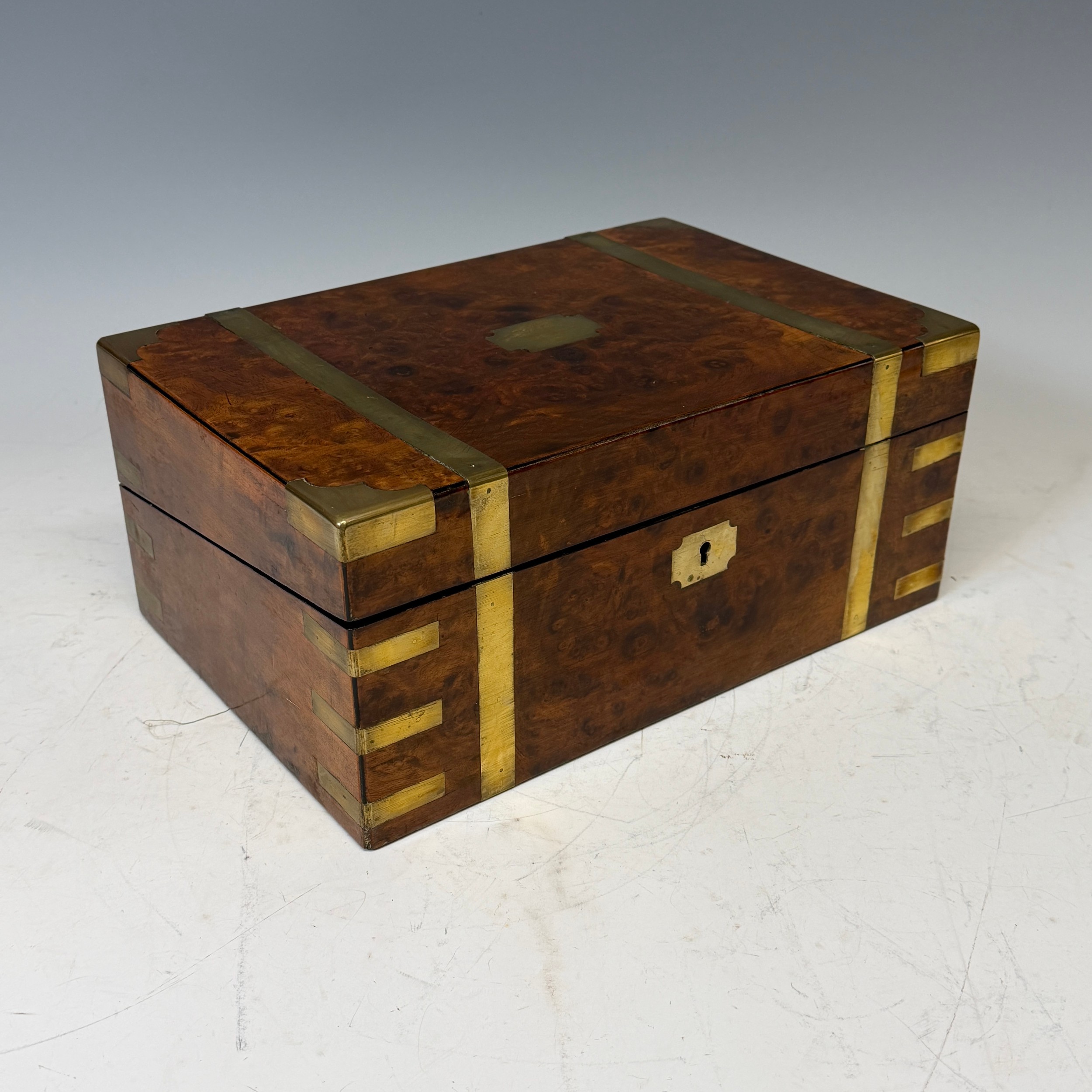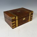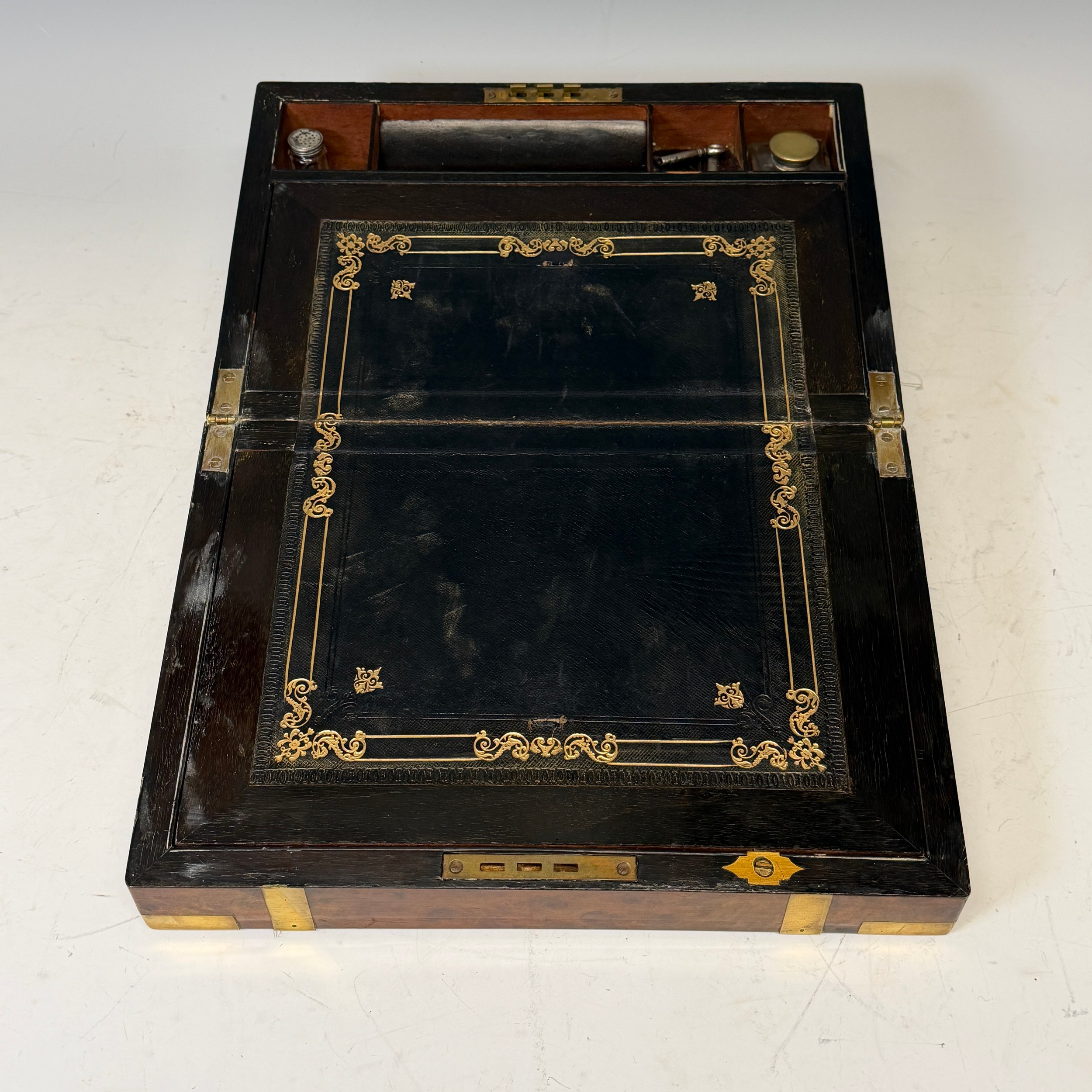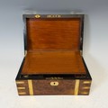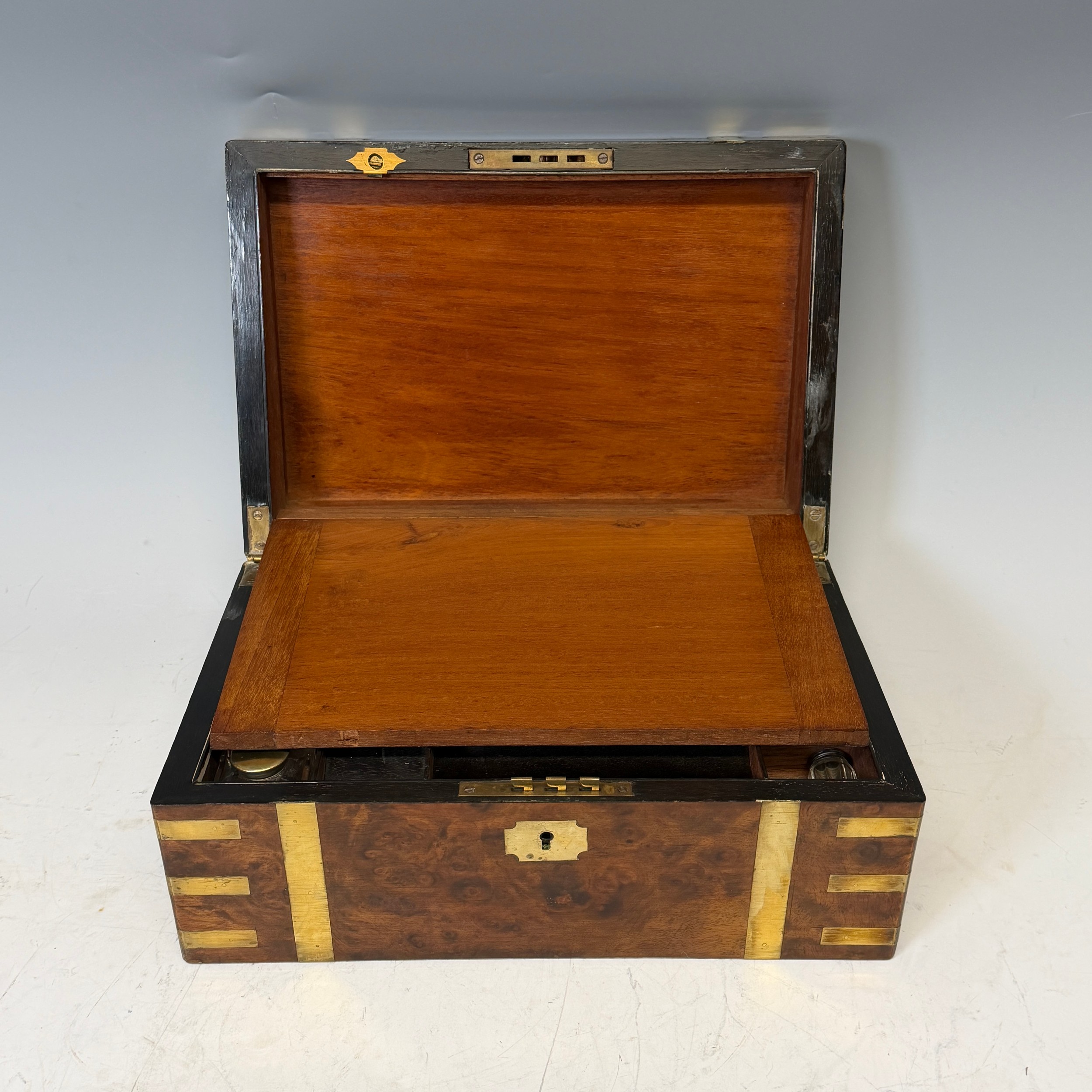 A 19th century burr walnut and brass bound writing Slope, complete with fitted interior and black leather writing skiver, with key, W 35 cm x H 15 cm x D 24 cm.