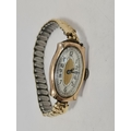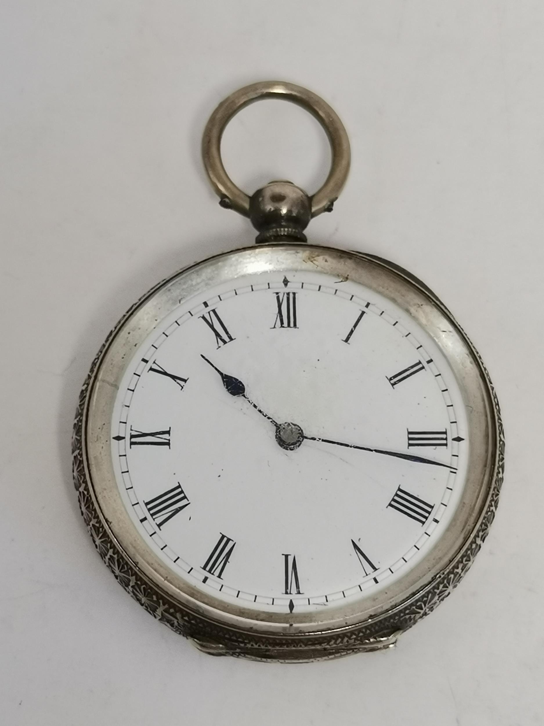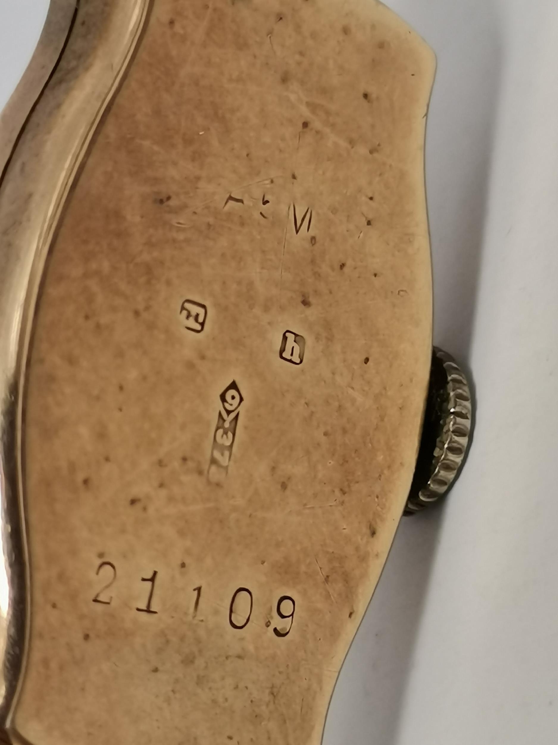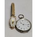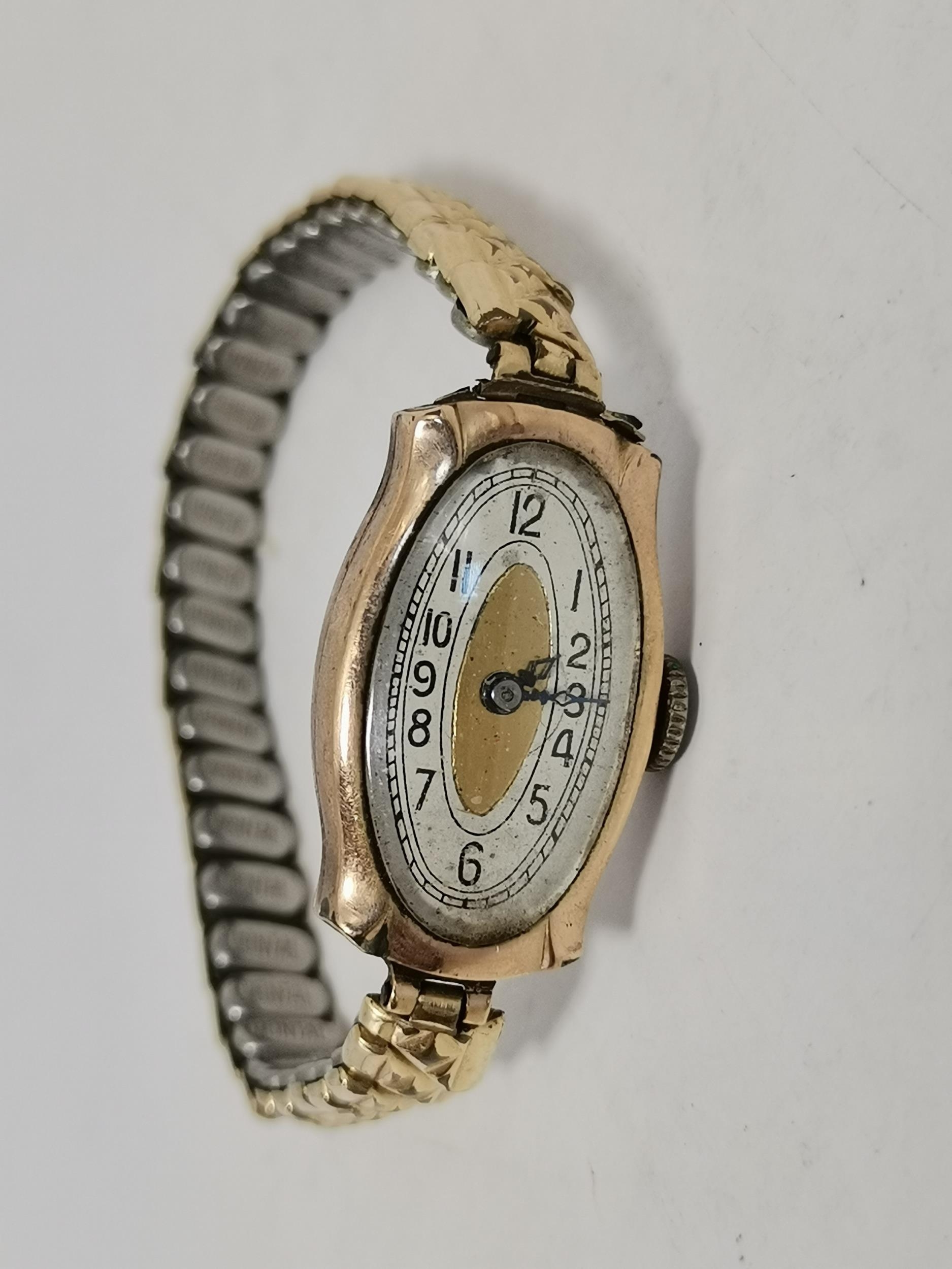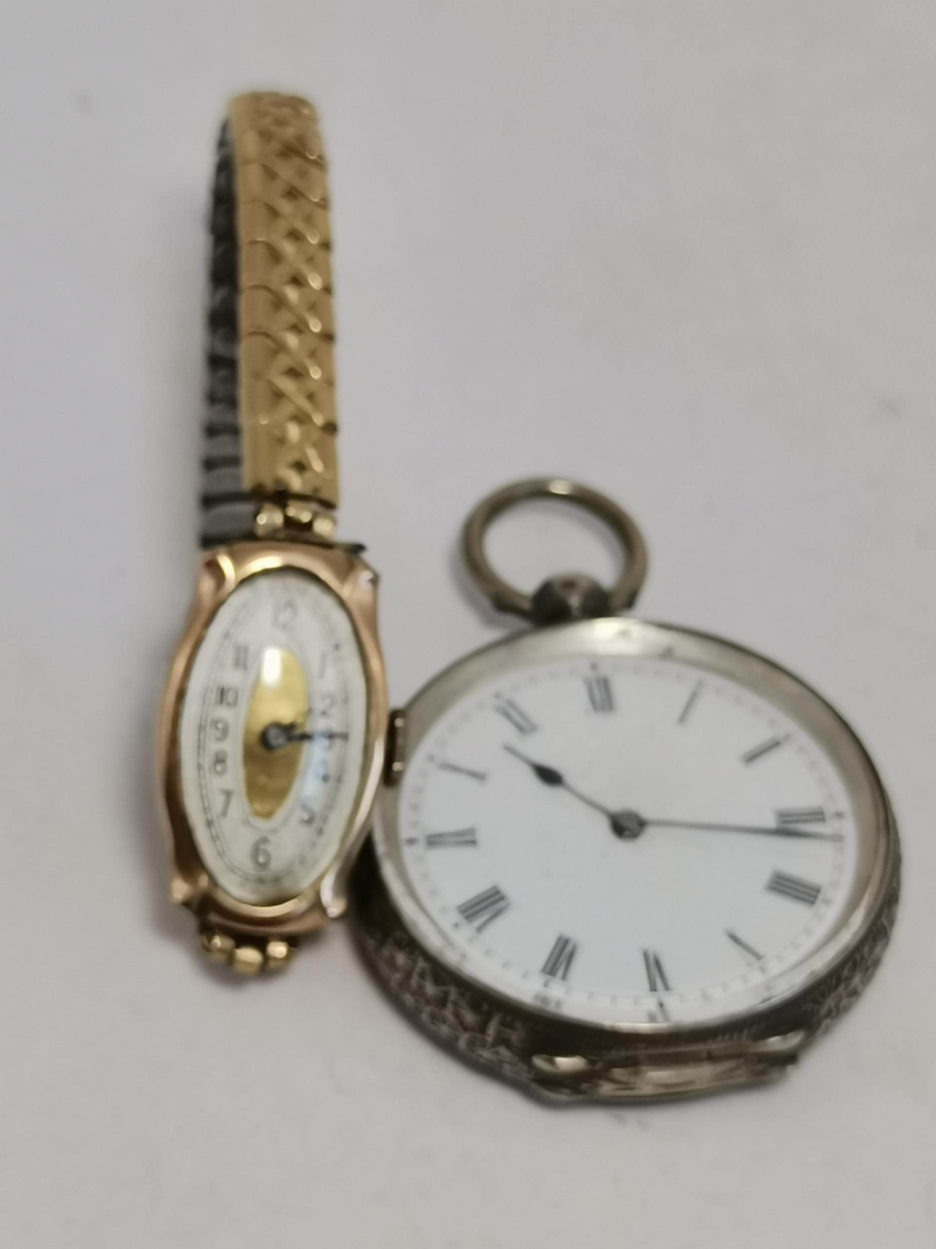 A lady's Art Deco 9 carat gold wristwatch, the white oval dial with a gilded centre, black Arabic numerals and blued steel hands, to an expanding rolled gold bracelet strap, the movement marked 15 Jewels, the case back hallmarked .375 and numbered 21109, case 26mm by 15mm; together with a silver open-face pocket watch, the white dial with Roman numerals and blued steel hands, the case-back and sides profusely engraved with scrolling foliage, 38mm diameter. (2)