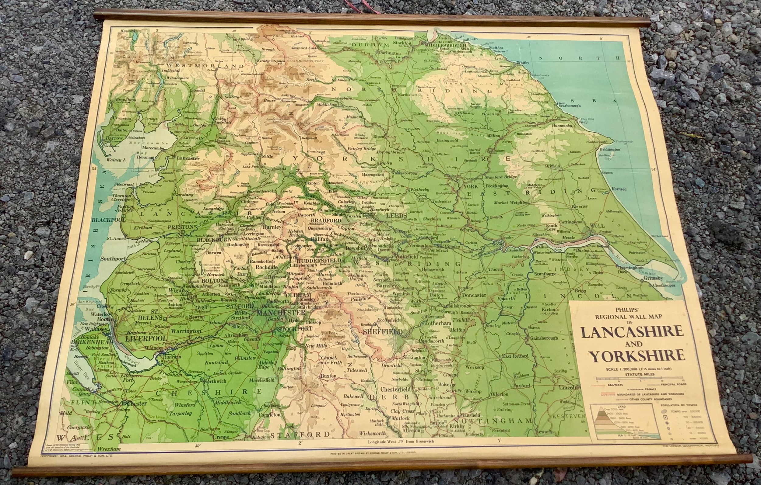 Large Vintage George Phillip & Son. School classroom Regional Wall Map of Lancashire and Yorkshire