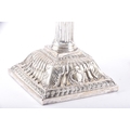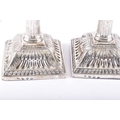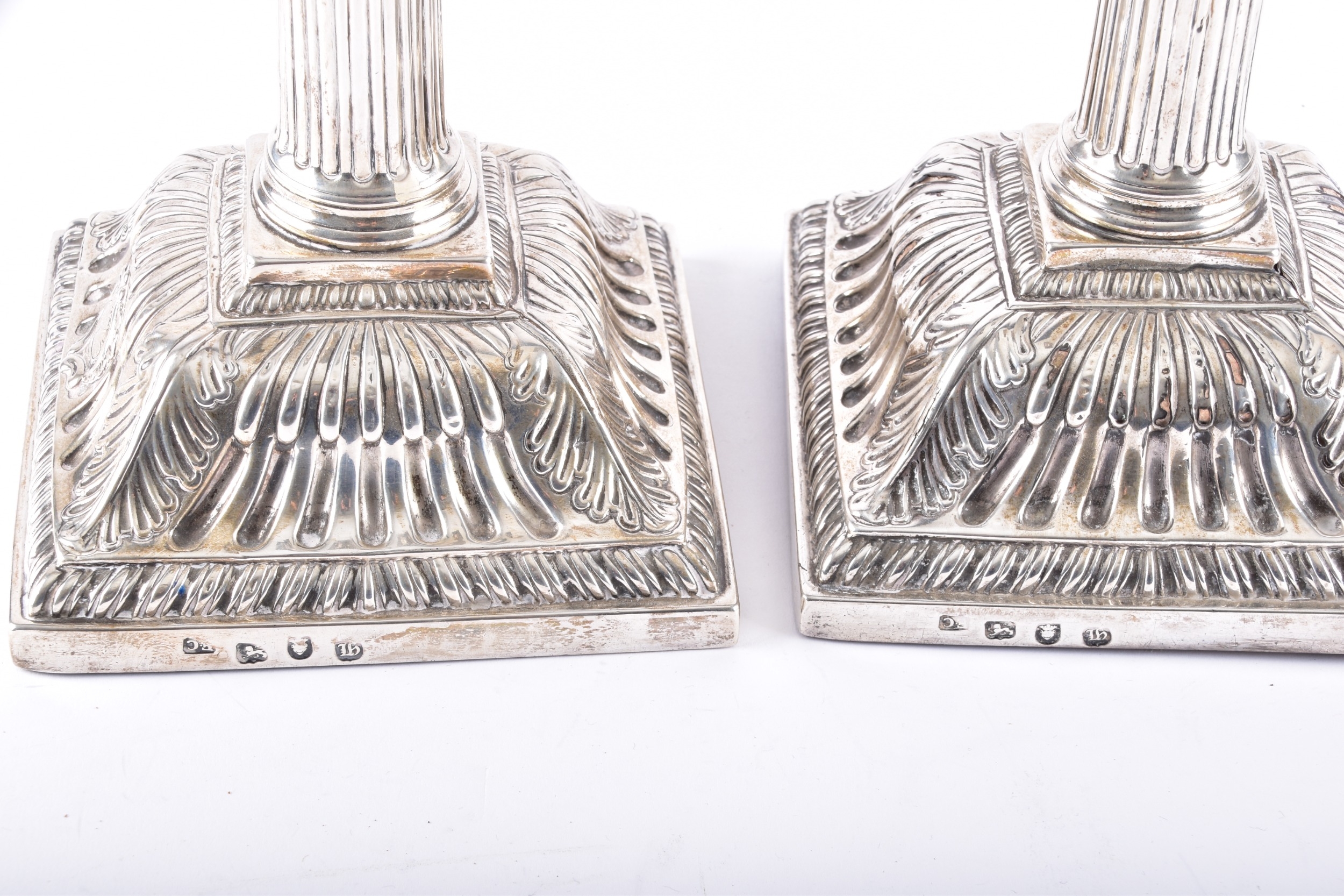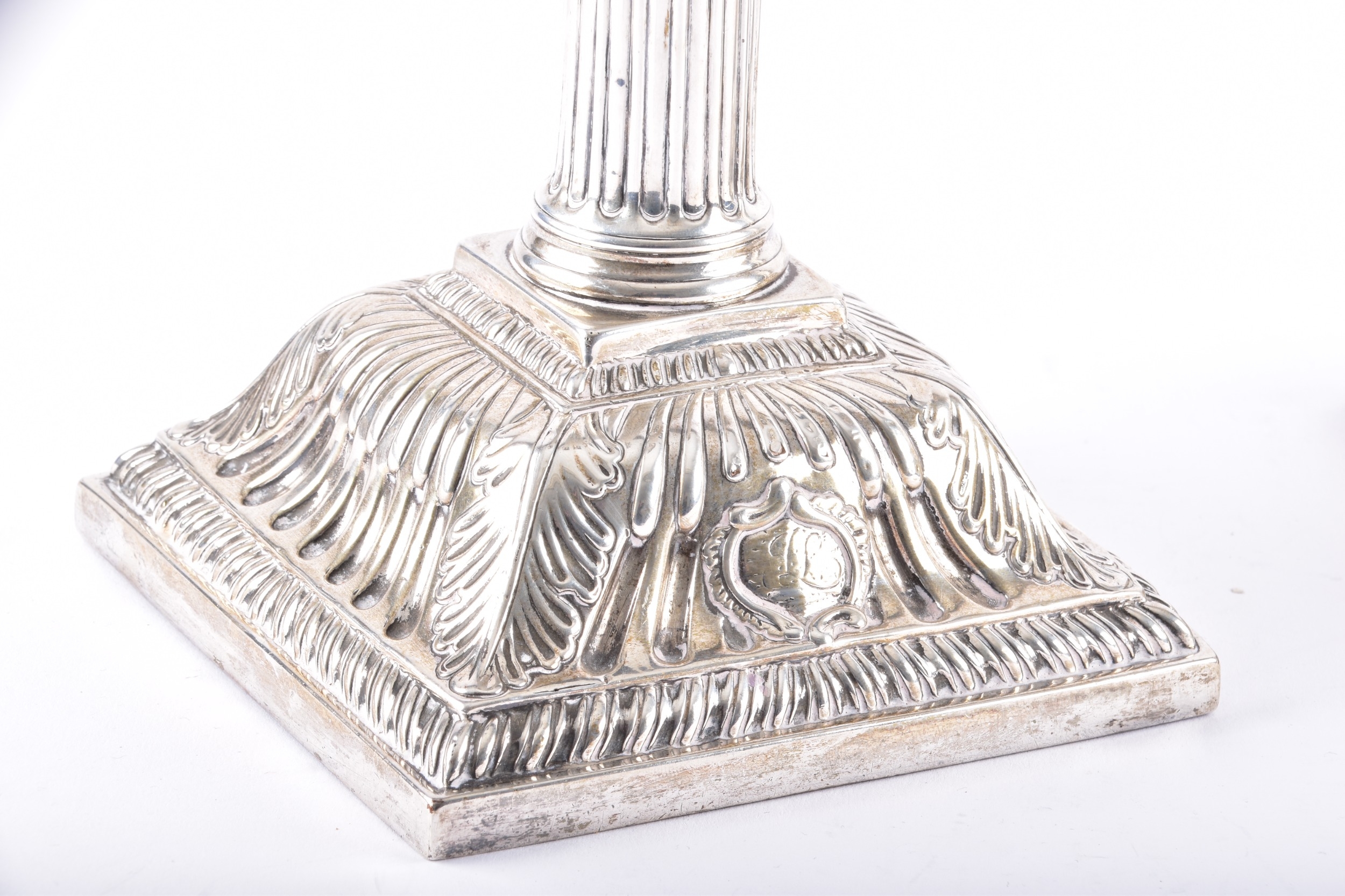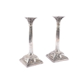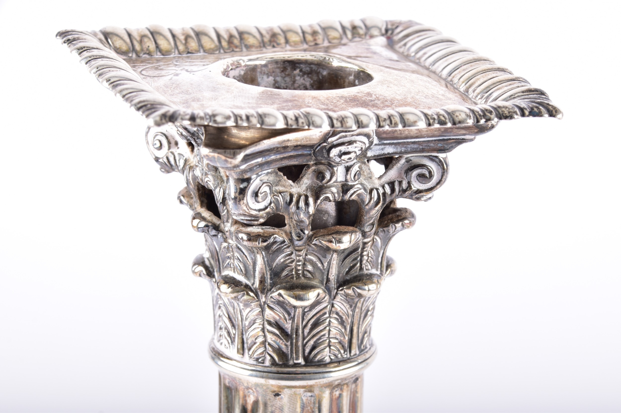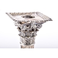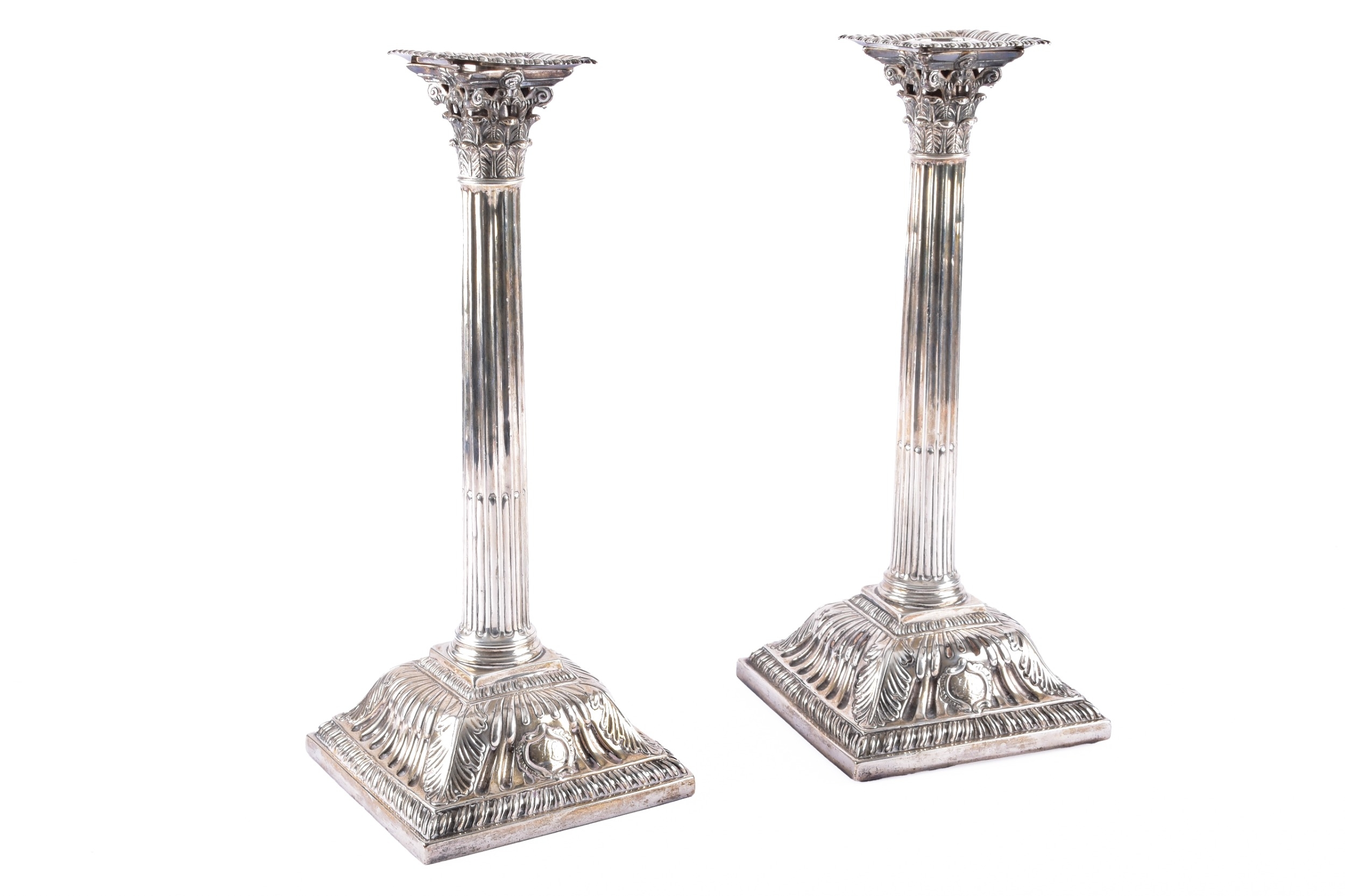 A fine pair of mid-18th century George II silver candlesticks, by Ebenezer Coker, London 1757, each raised on a stepped square base richly cast with shells, scrolls and acanthus ornament, the bases rising to tapering fluted columns, surmounted by openwork Corinthian capitals with foliate detailing, and detachable sconces with gadrooned rims, the bases and sconces engraved with a initials, 31.5 cm high. (2)