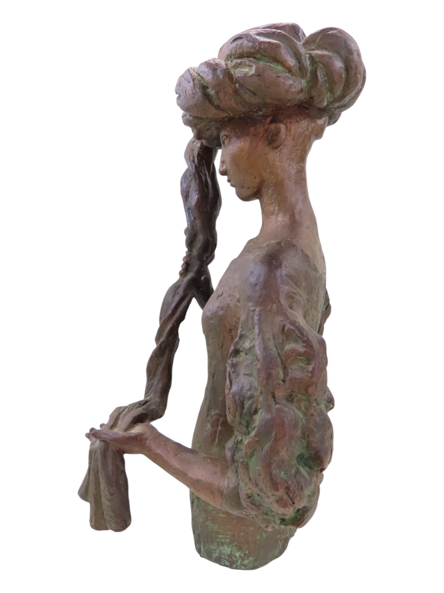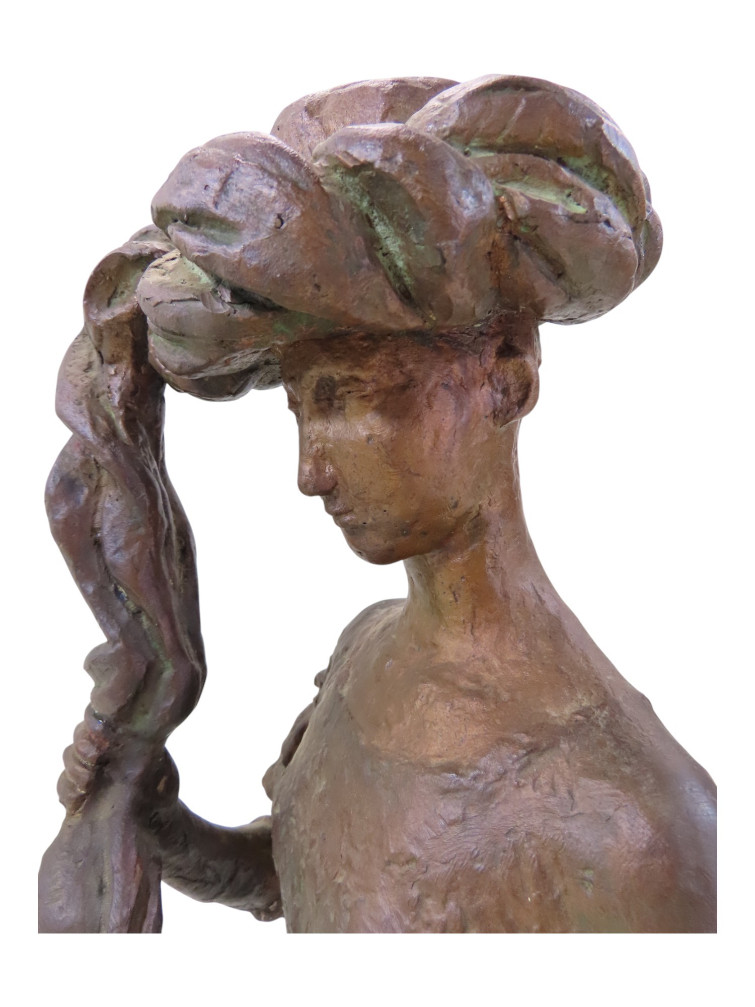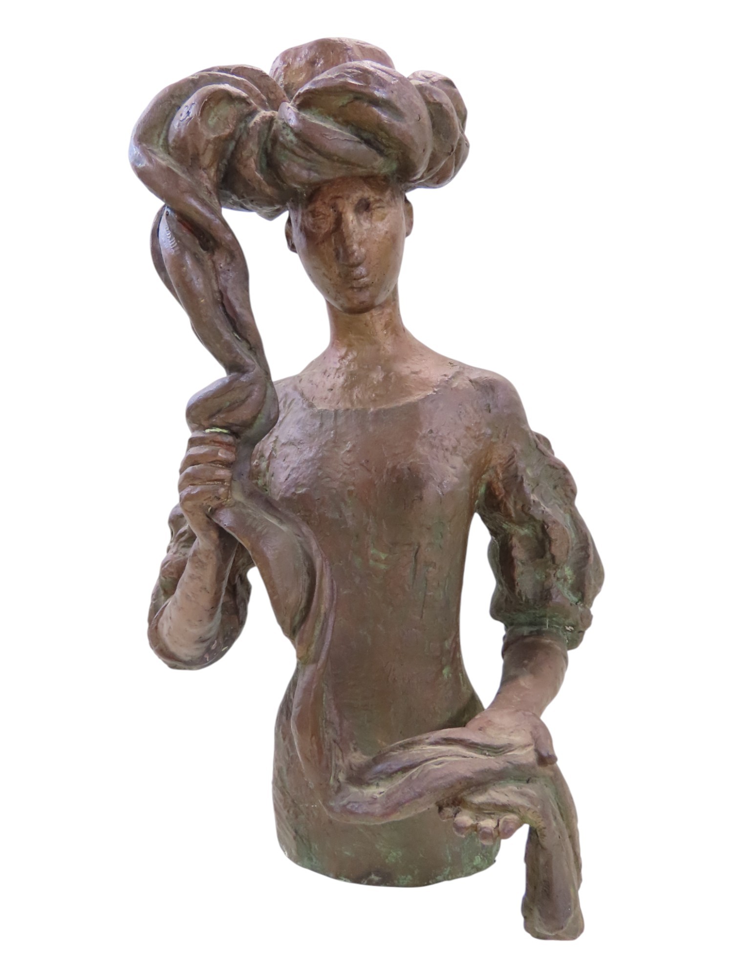 A bronze statue by Tone Thiis Schjetne 1928-2015, female with turban hat, 42cm high