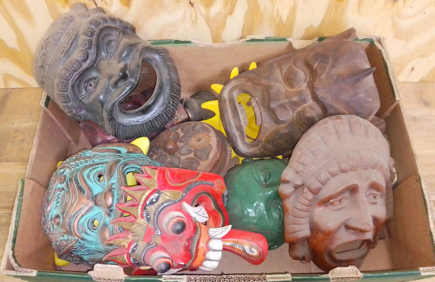 A box of assorted pottery, wooden and metal masks.