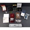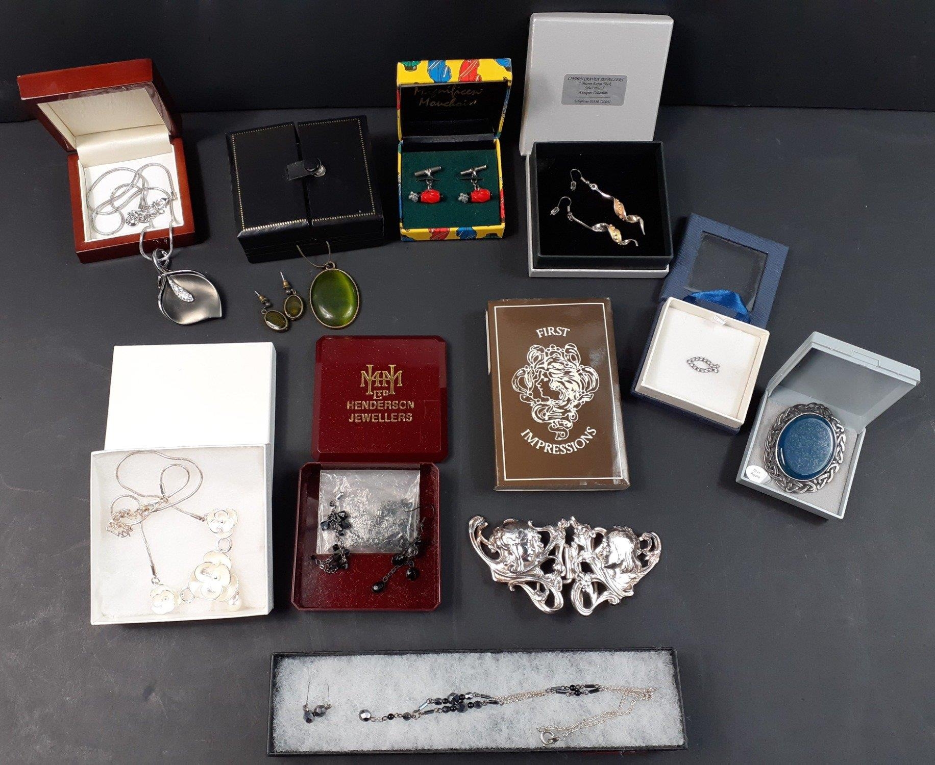 A selection of quality boxed costume jewellery to include necklaces, earrings, brooches, gold club cuff links, belt-buckle, etc