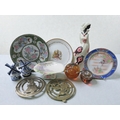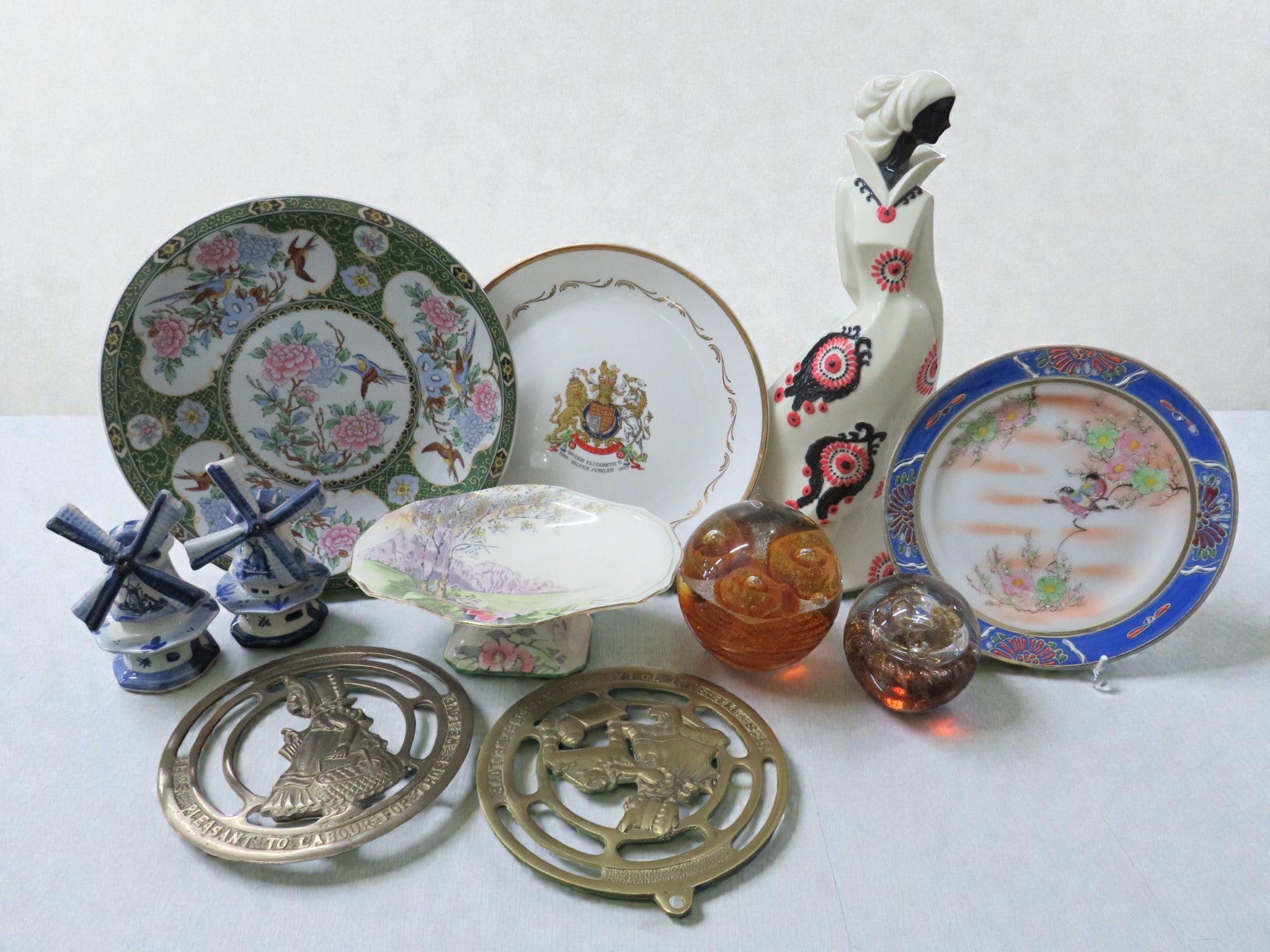 Mixed lot: Chinese famille rose charger with birds and peonies, Queen Elizabeth II Silver Jubilee plate, pair Delft windmills, floral footed dish, art glass paperweights, brass trivets and Japanese plate