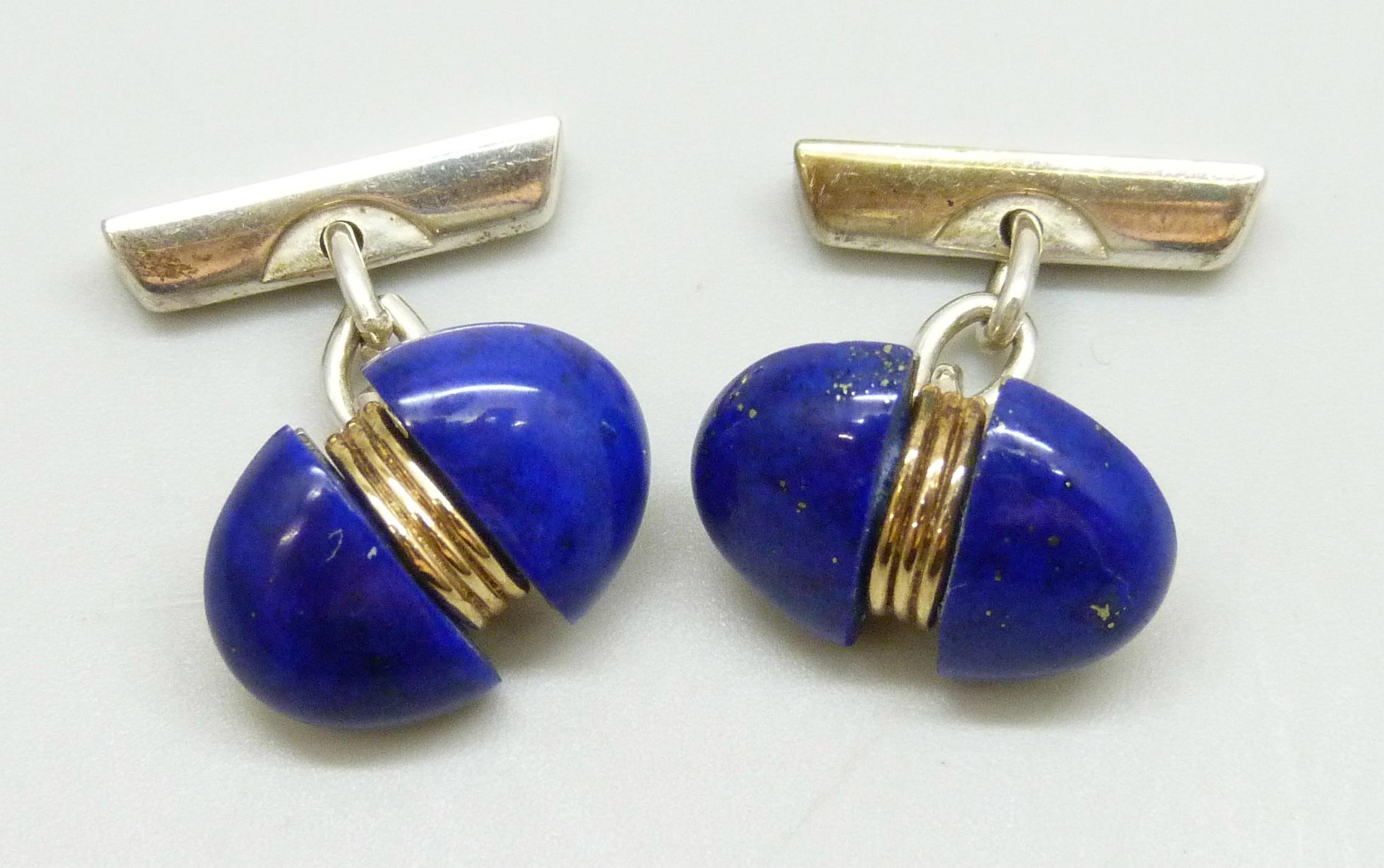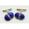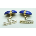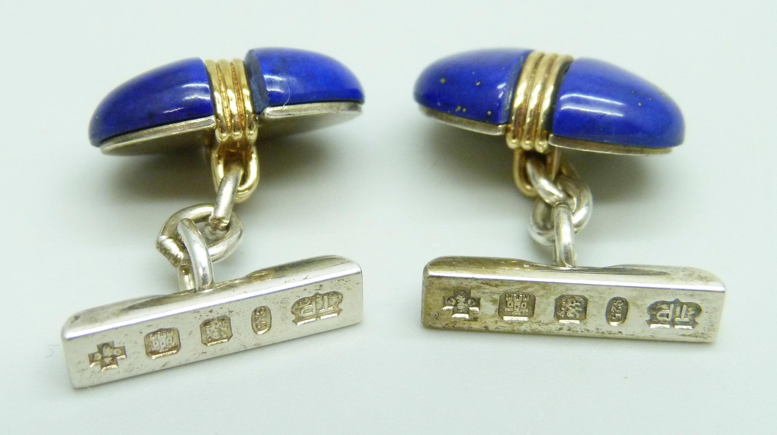 A pair of Thomas Penrose Edinburgh gold and silver lapis lazuli set cufflinks, central section test as 9ct gold, 11g, 1.7cm