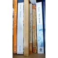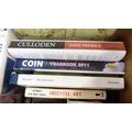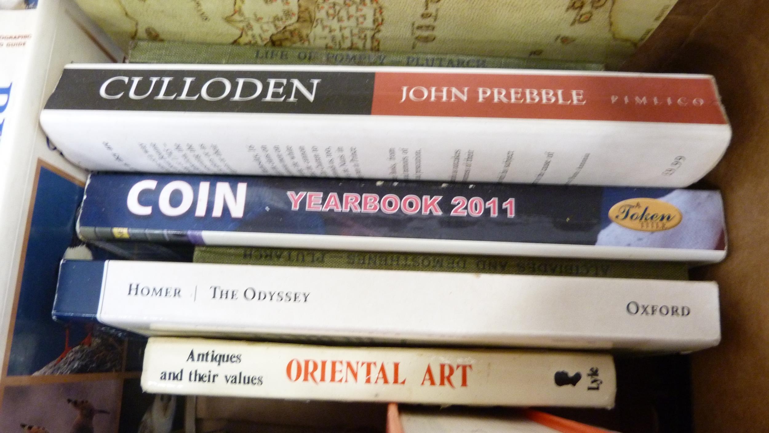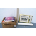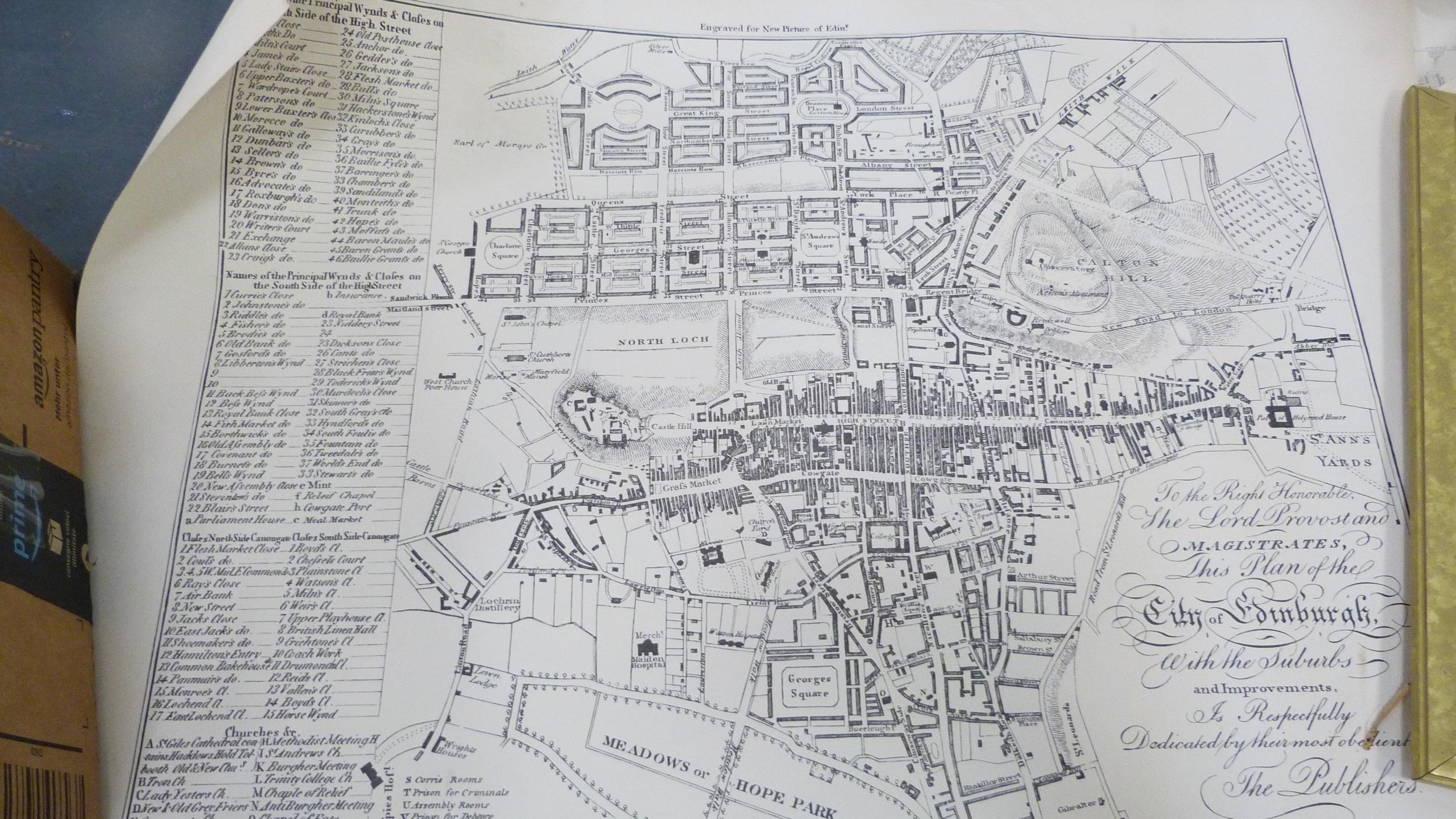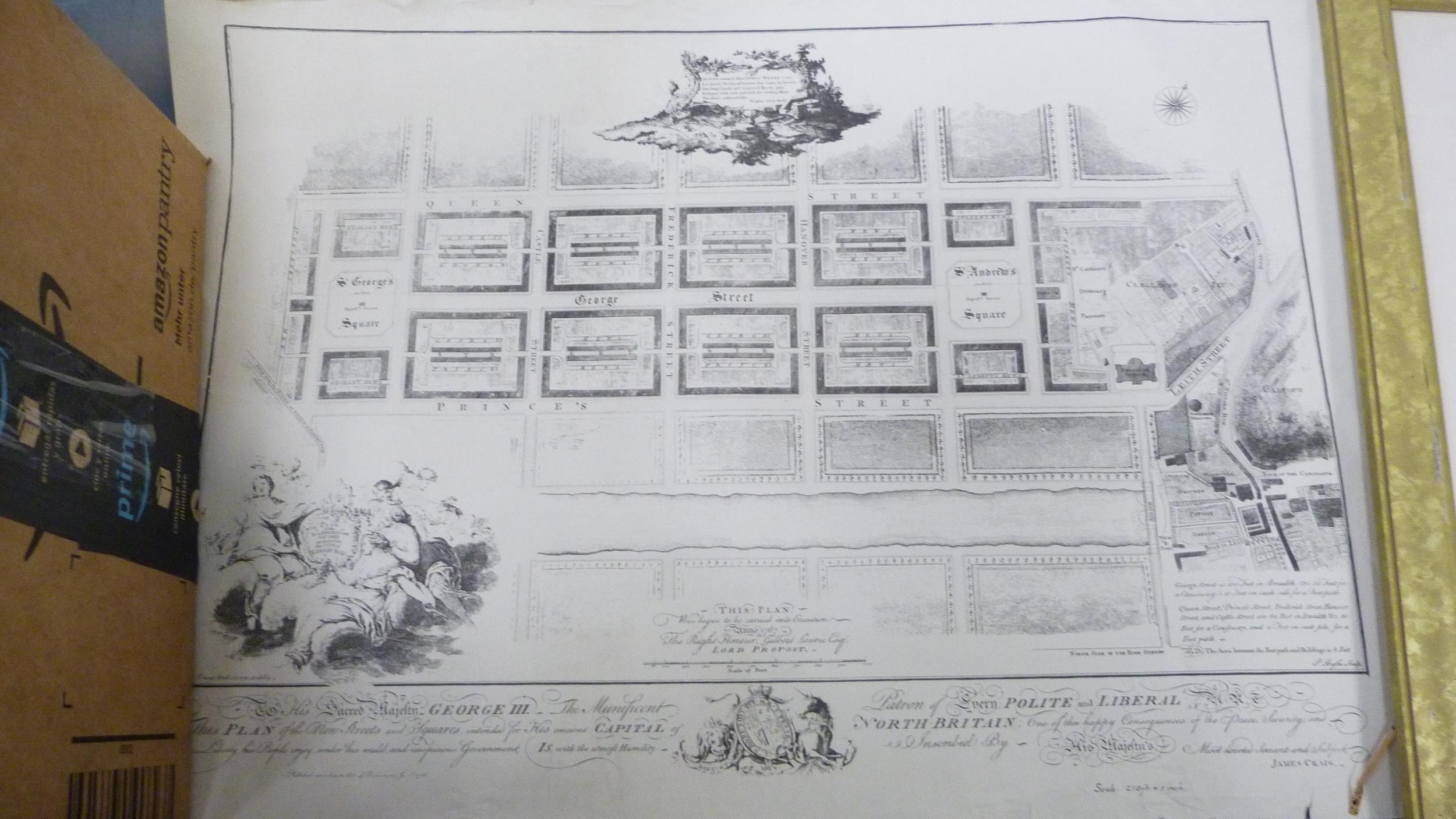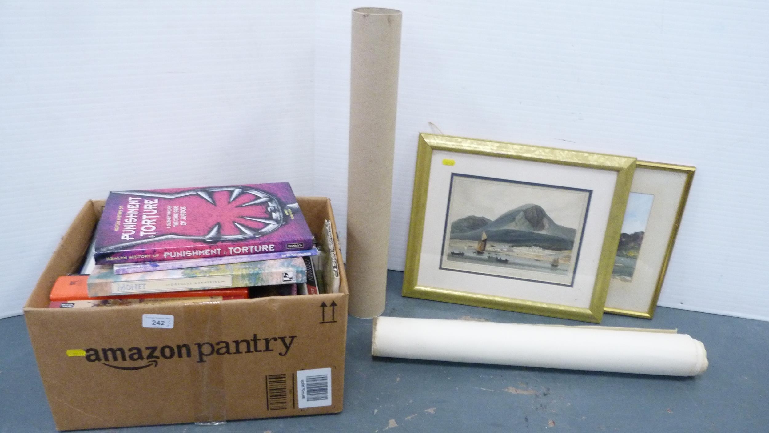 Carton containing books to include collectors' books, print of Skye, a watercolour by W Donaldson of a coastal scene, later engravings of plans of Edinburgh in a scroll.