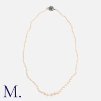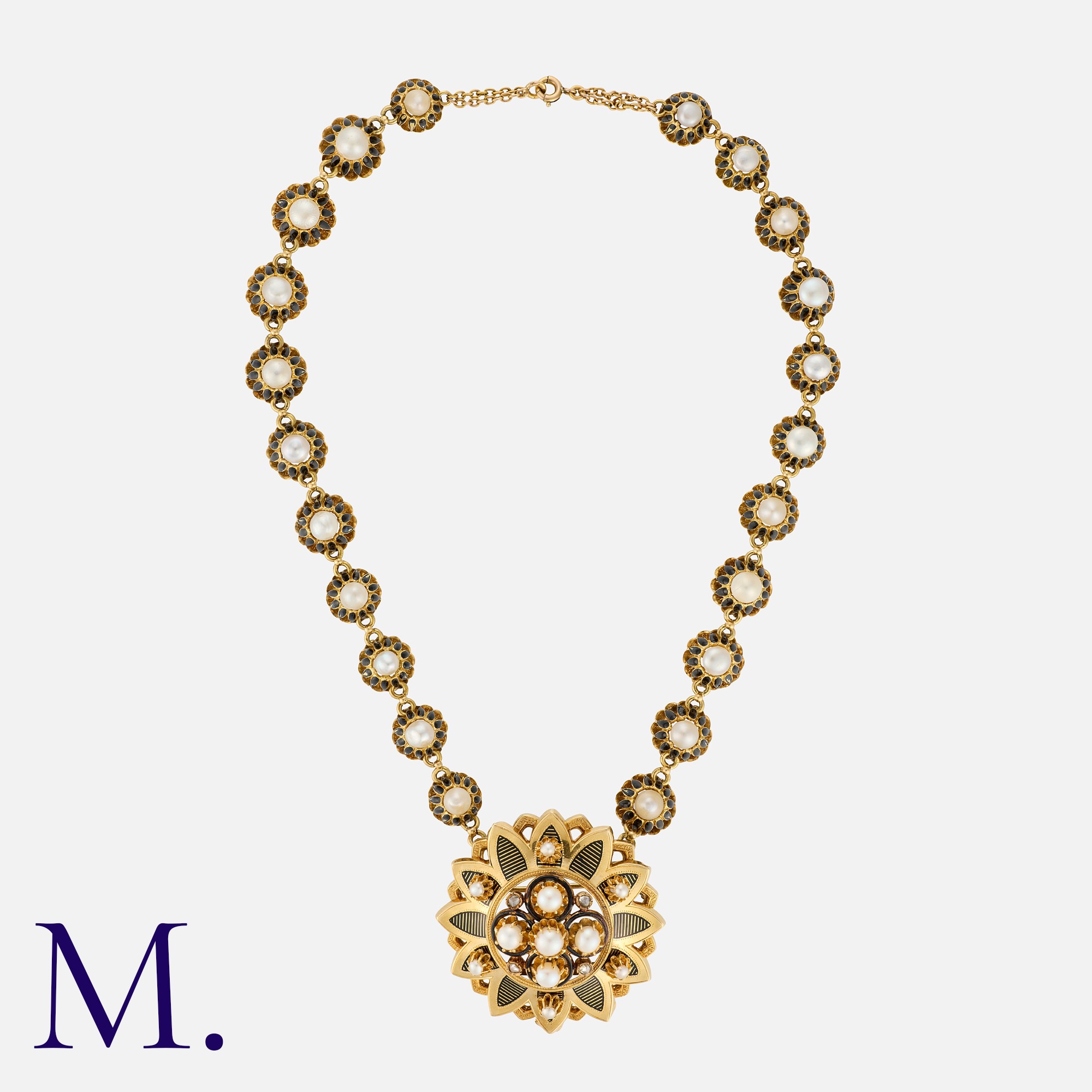 An Antique Pearl, Enamel and Diamond Collar in 18K yellow gold, formed of a central floral pendant with pearl and diamond accents and black enamel detailing (also with brooch fitting so may be worn separately) suspended from a gold chain with pearl and black enamel stations along the length. French marks for 18ct gold.