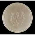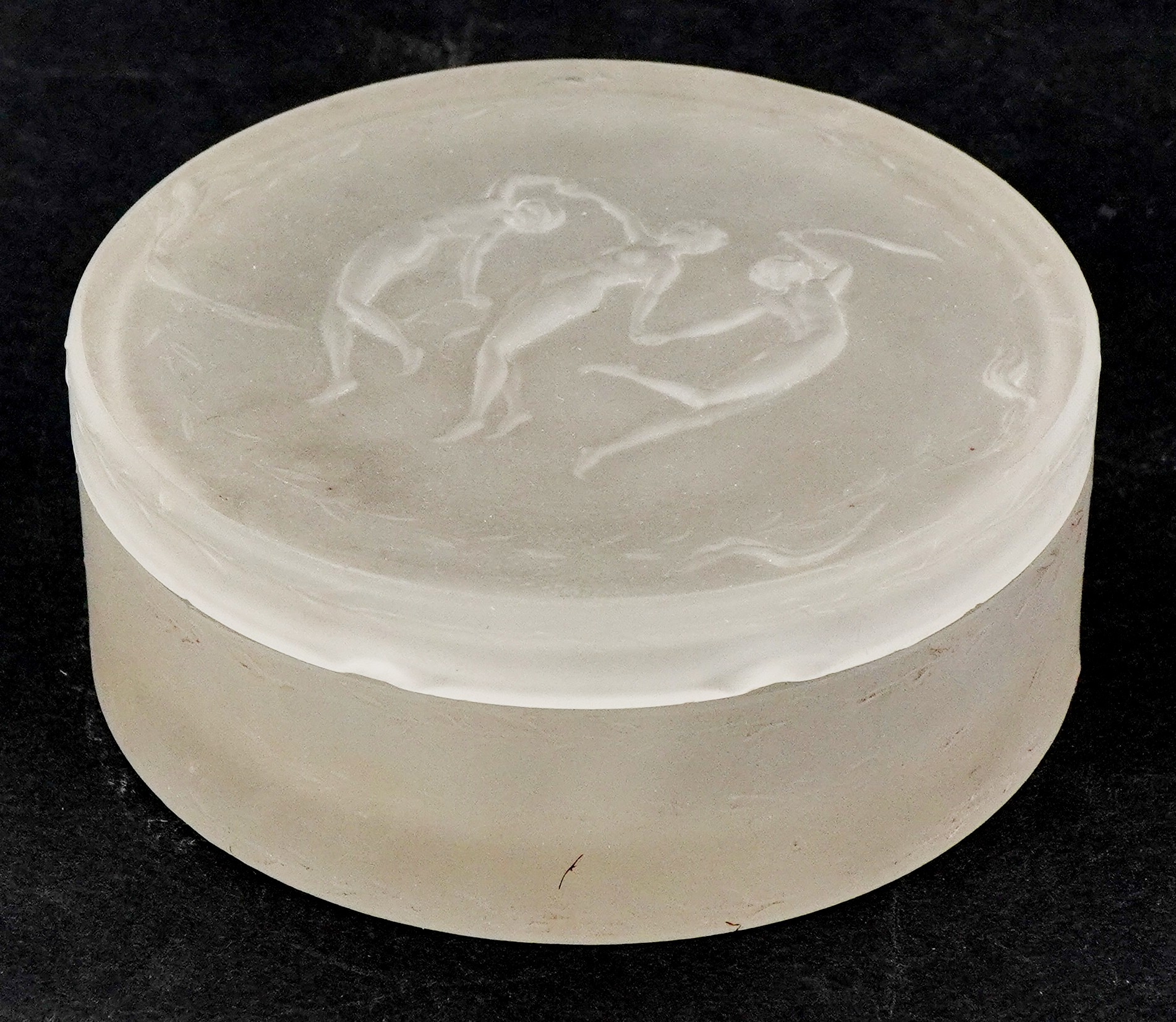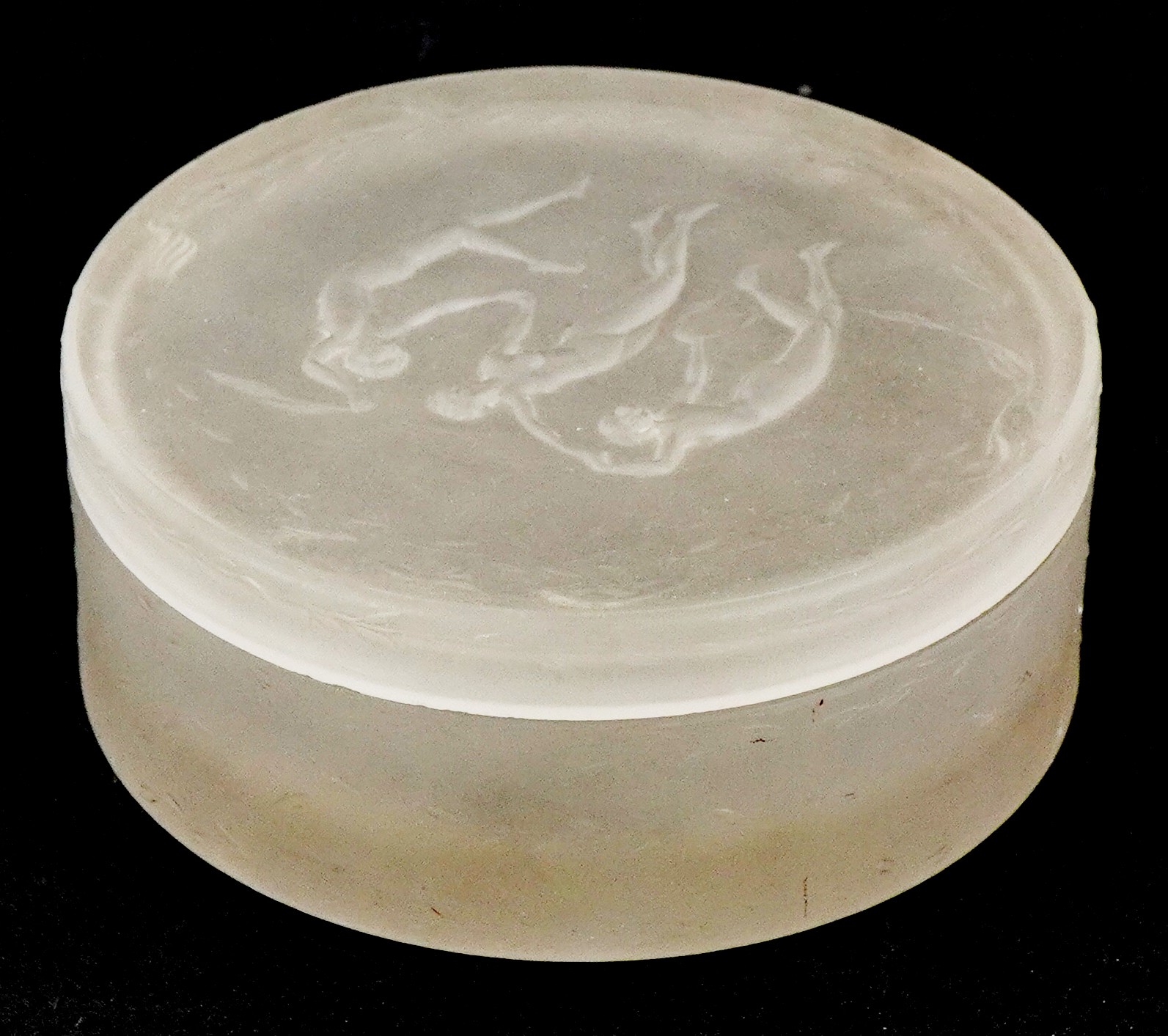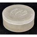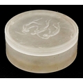 R Lalique, a frosted glass Les Trois Figurines pot and cover, moulded R Lalique to the base, 9.5cm in diameter.