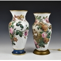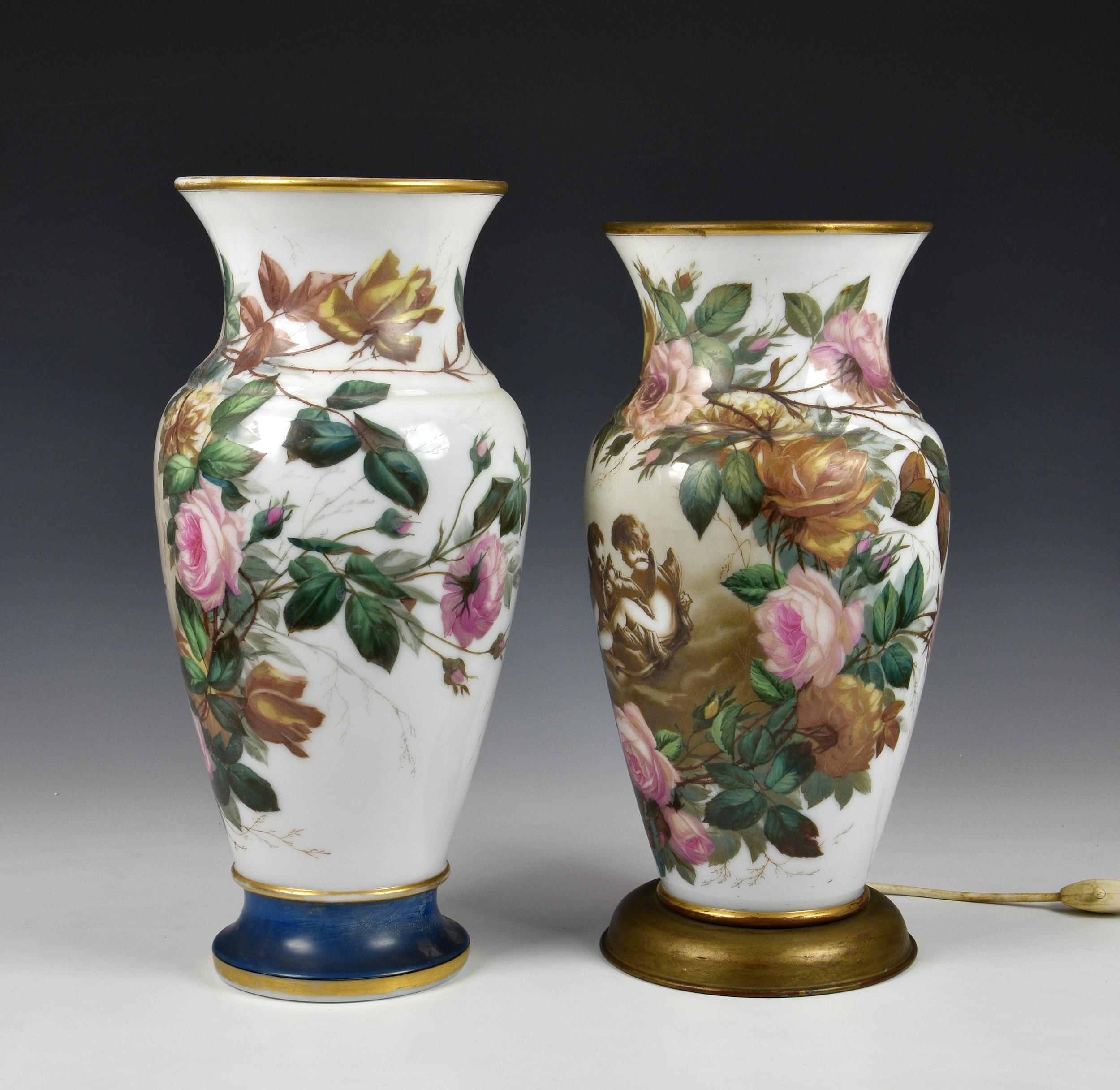 Two floral decorated Bohemian opaline glass vases with cherubs, one converted to a lamp (drilled) , of baluster form, decorated with cherubs amidst roses, the tallest 17 ¾in. (45cm.) high Gilt rims etc rubbed, some small surface scratches, lamp version with large crack towards base area.