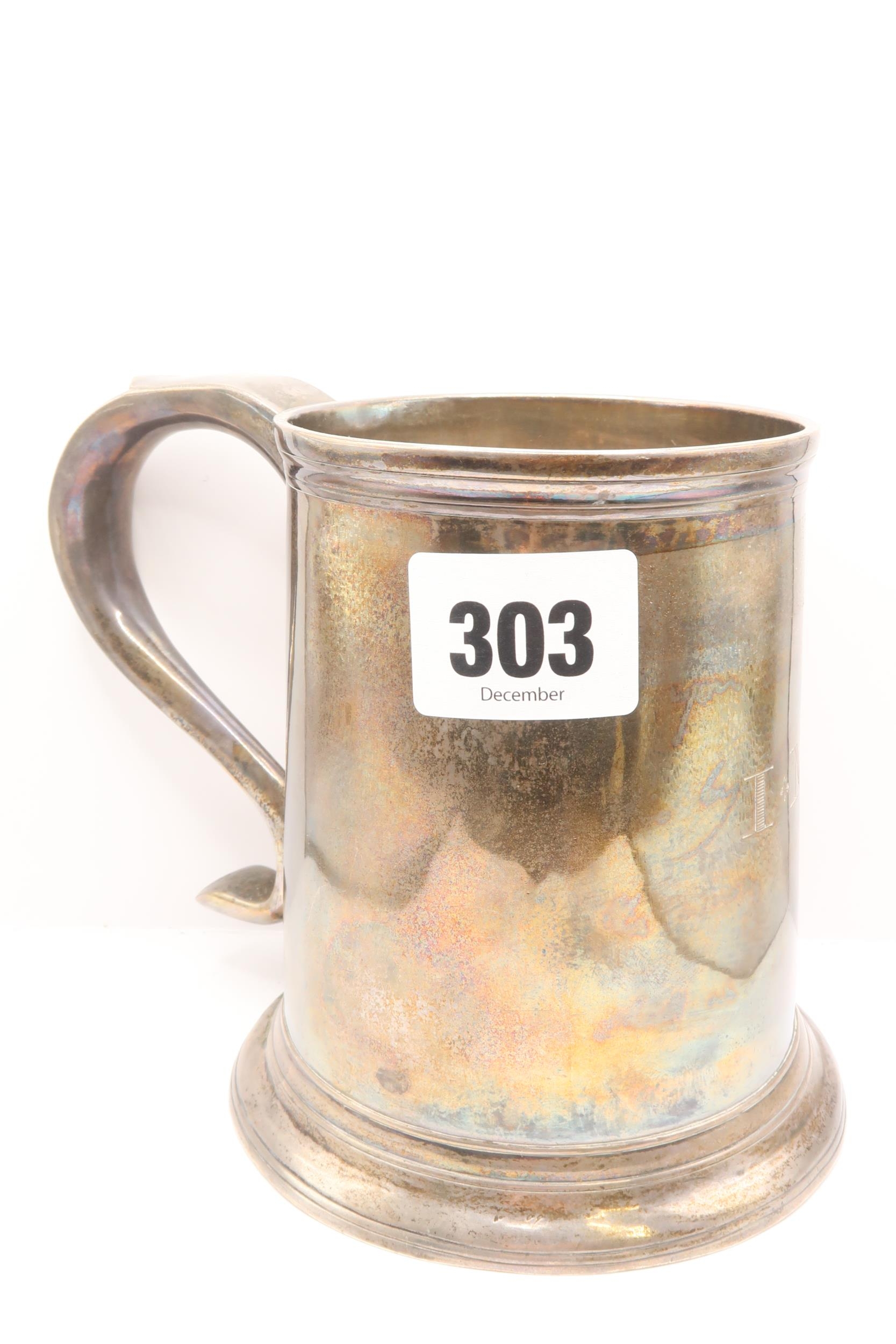 A George II Sterling Silver Tankard. Assayed New Castle, 1759 by Issac Cookson. Engraved 'I M', rim diameter 8cm, internal height 10.3cm