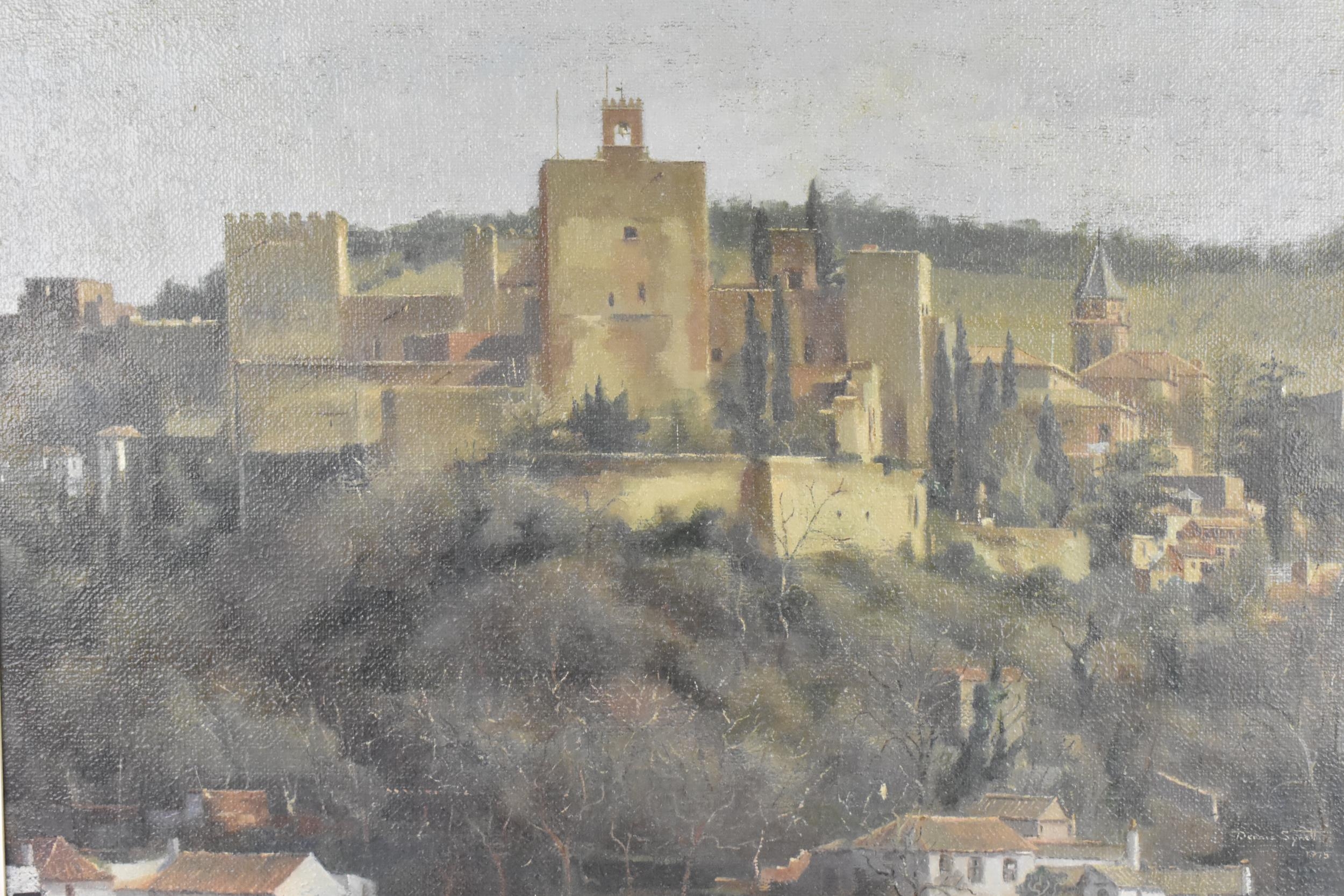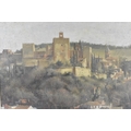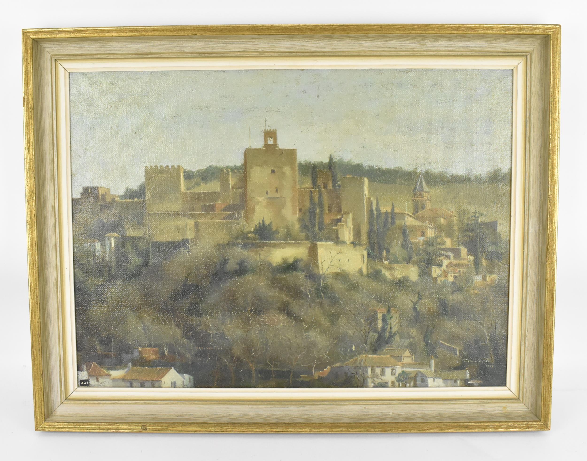 'The Alahambra Palace', oil on canvas, signed and dated 1975 bottom right, 39 cm x 54.5 cm, within a painted frame, the back with exhibition label