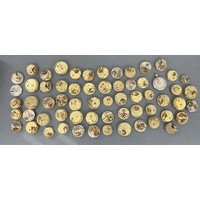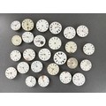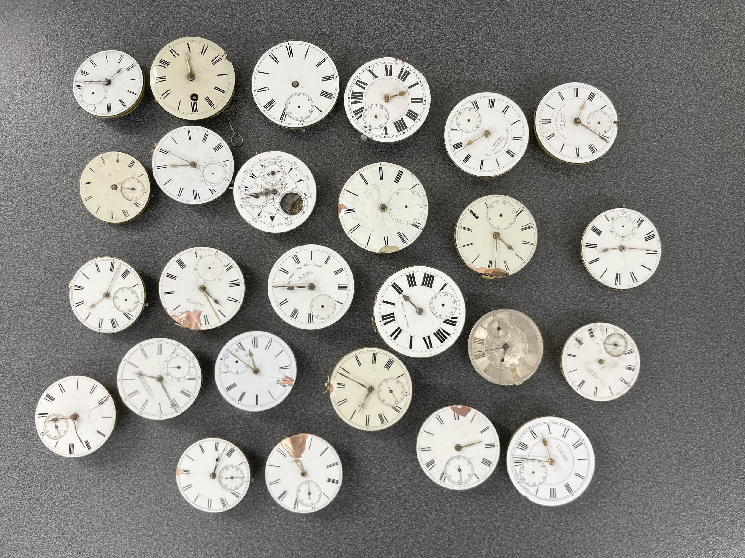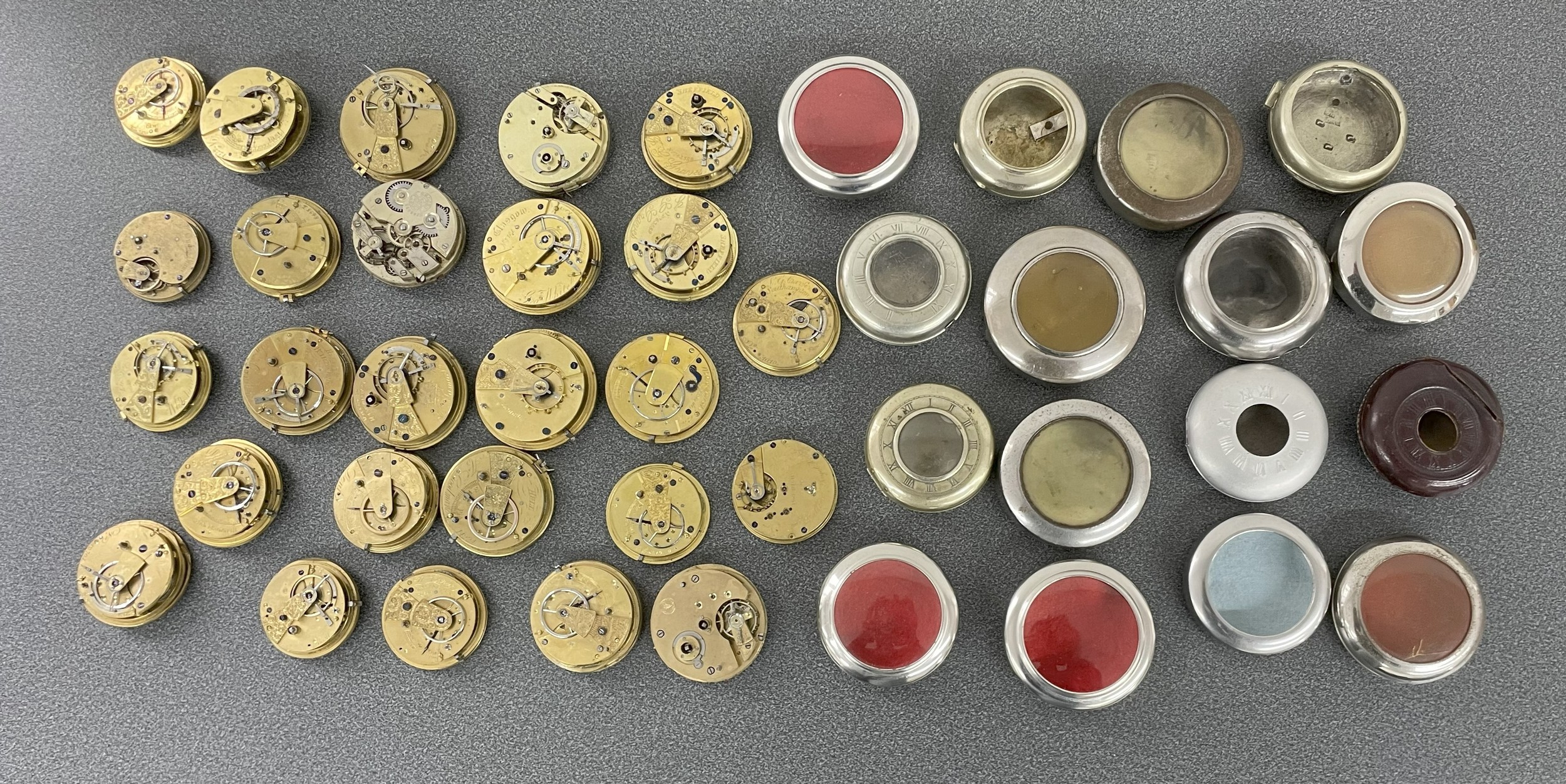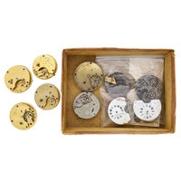Quantity of assorted pocket watch movements principally for repair to primarily include fusee lever and lever; also an unsigned fusee verge movement; contained within a wooden hinged box (25 approx); together with a quantity of pocket watch protective cases (2)