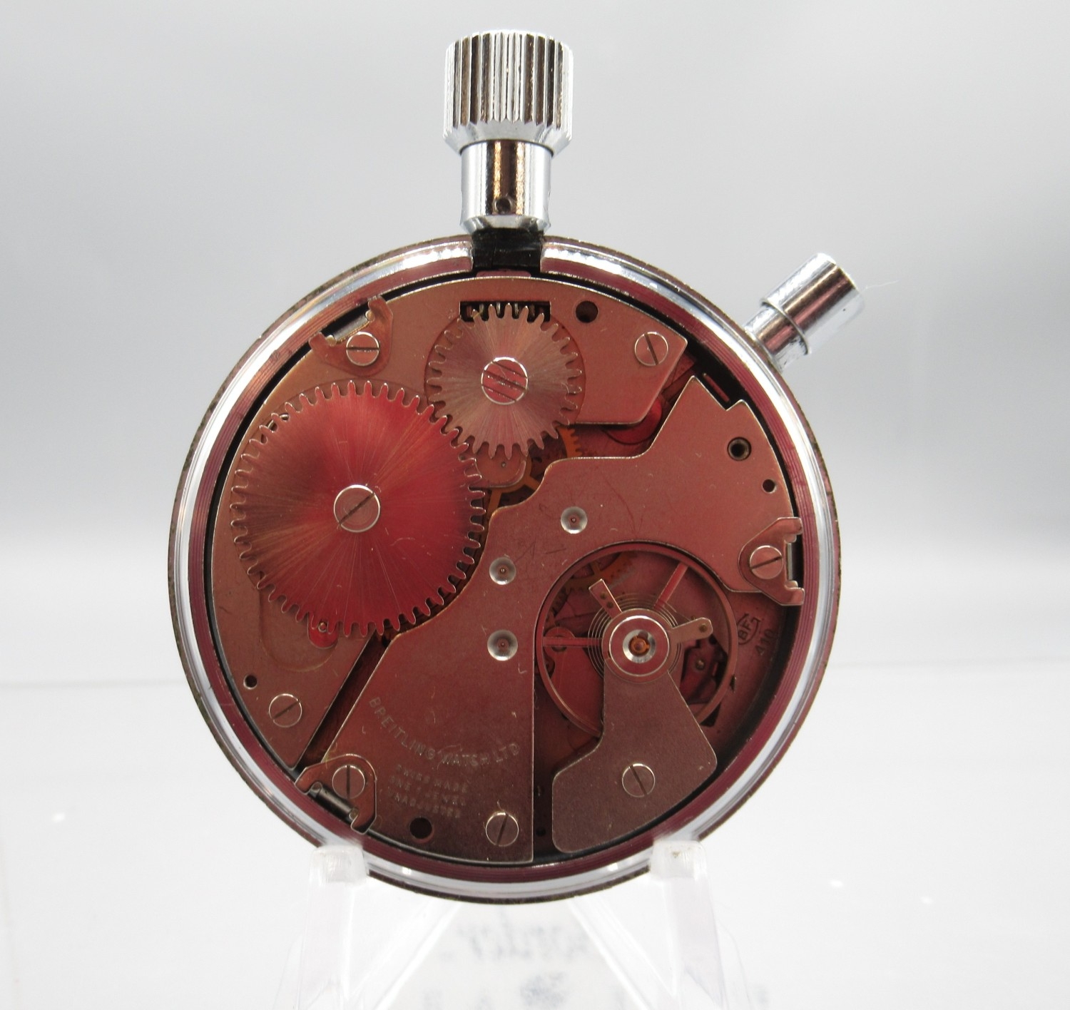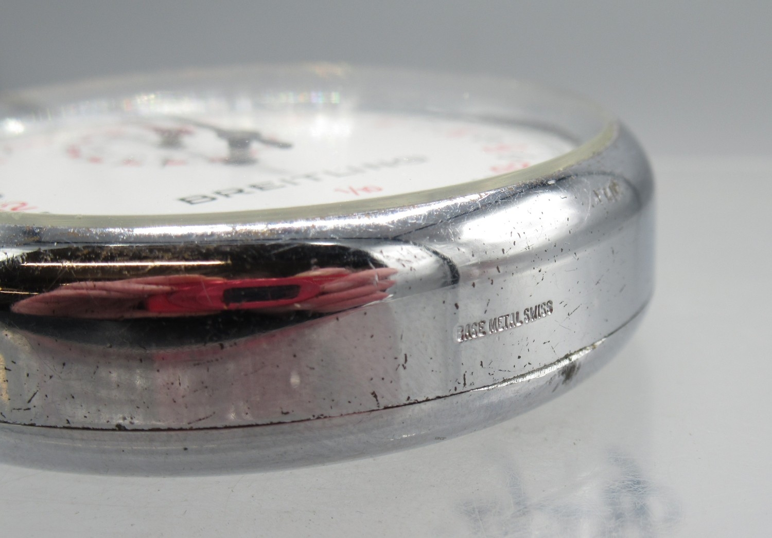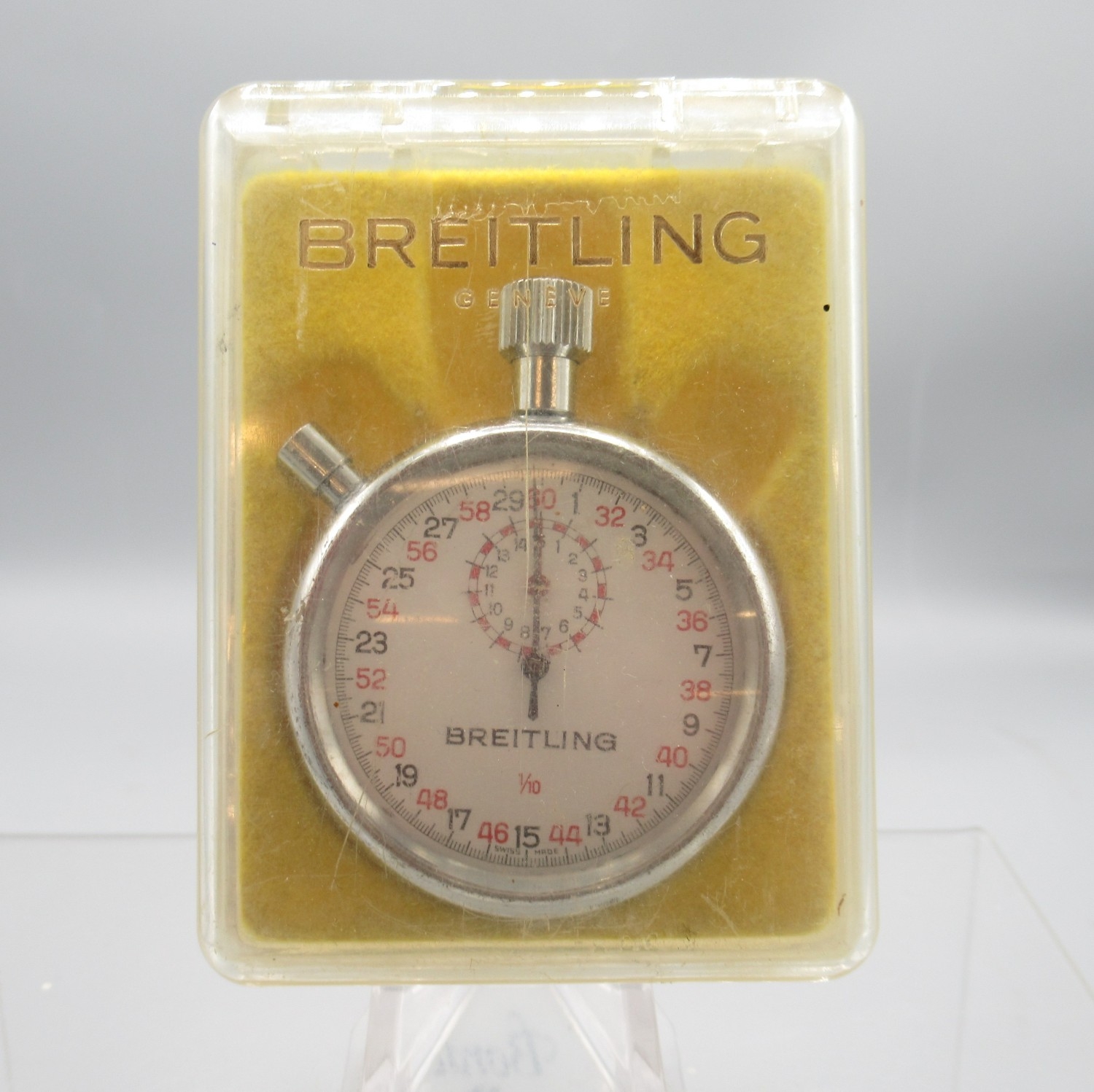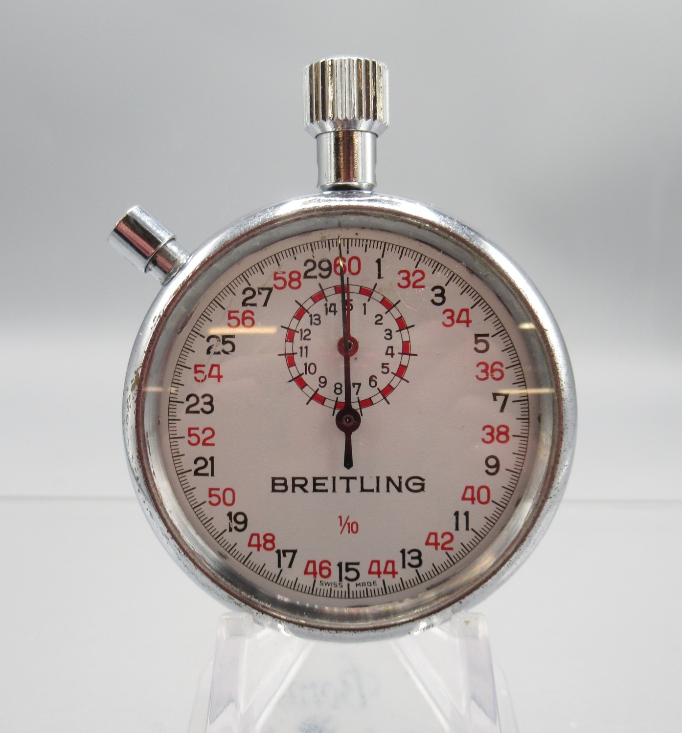 Breitling 1/10 chrome stopwatch, signed white dial with 15 minute subsidiary dial, signed snap on case back, Breitling/Baumgartner 410 calibre 1 jewel unadjusted movement, D52mm