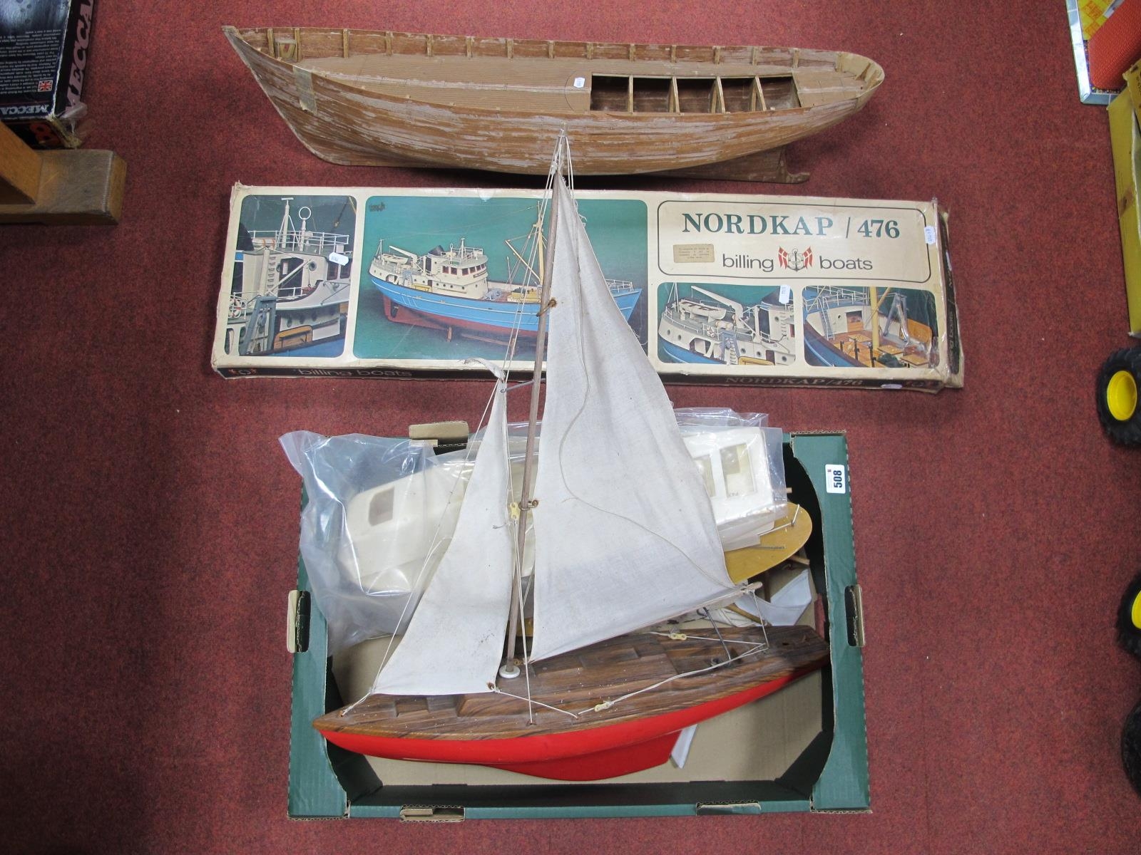 Model Boat Interest, to include two pond yachts, rigging, billing boats, Nordkap/476 balsa wood kit (unchecked for completeness - some parts cut from template), part built plastic/vacform model boat, a wooden construction ships hull, measuring 81cm long.