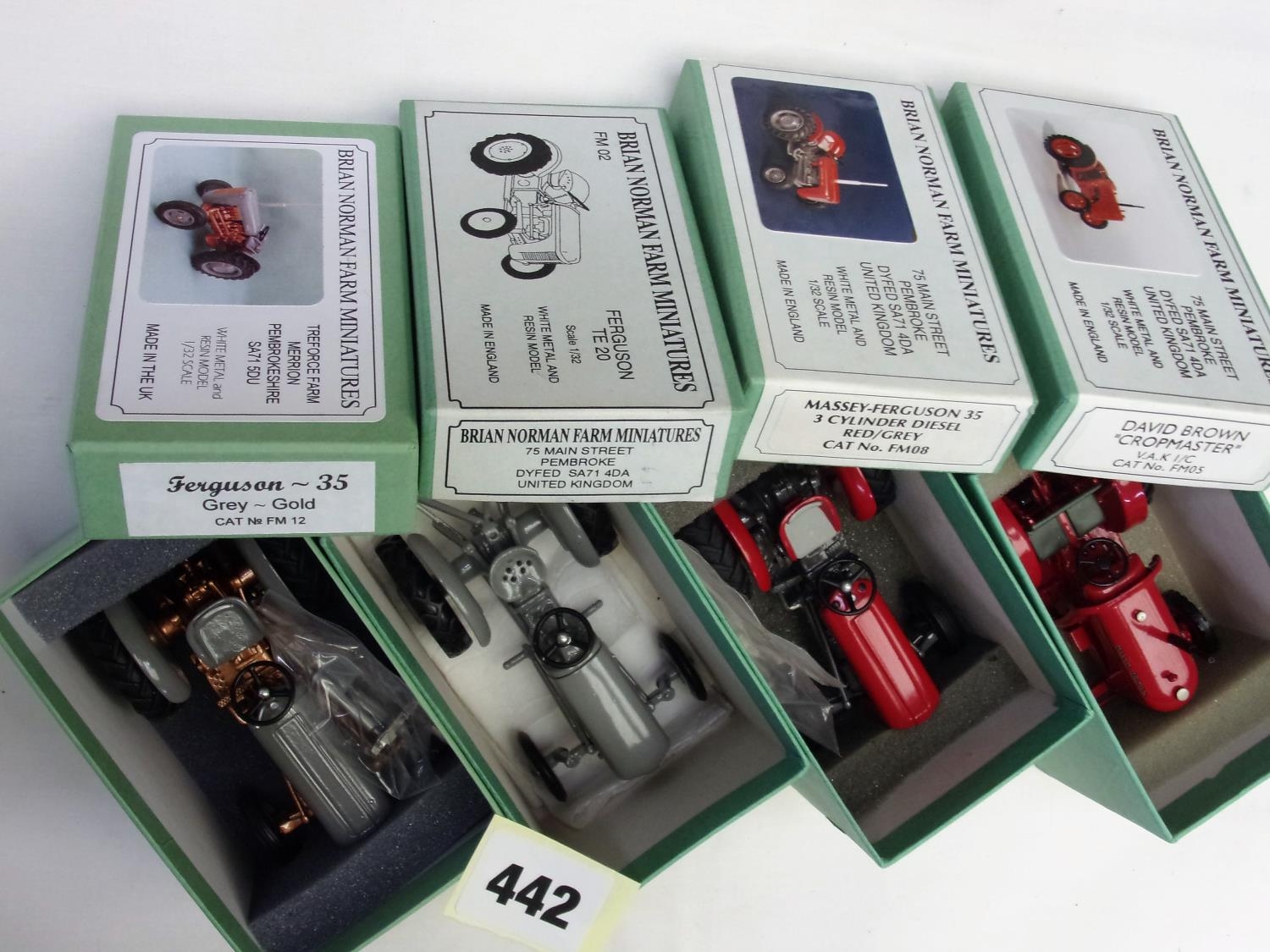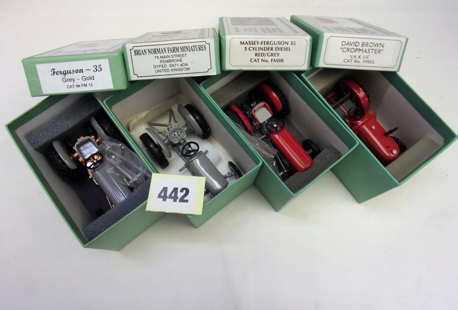 4 BRIAN NORMAN FARM MINIATURES : MASSEY FERGUSON 35 3 CYL RED / GREY, DAVID BROWN CROPMASTER, FERGUSON TE20, FERGUSON 35