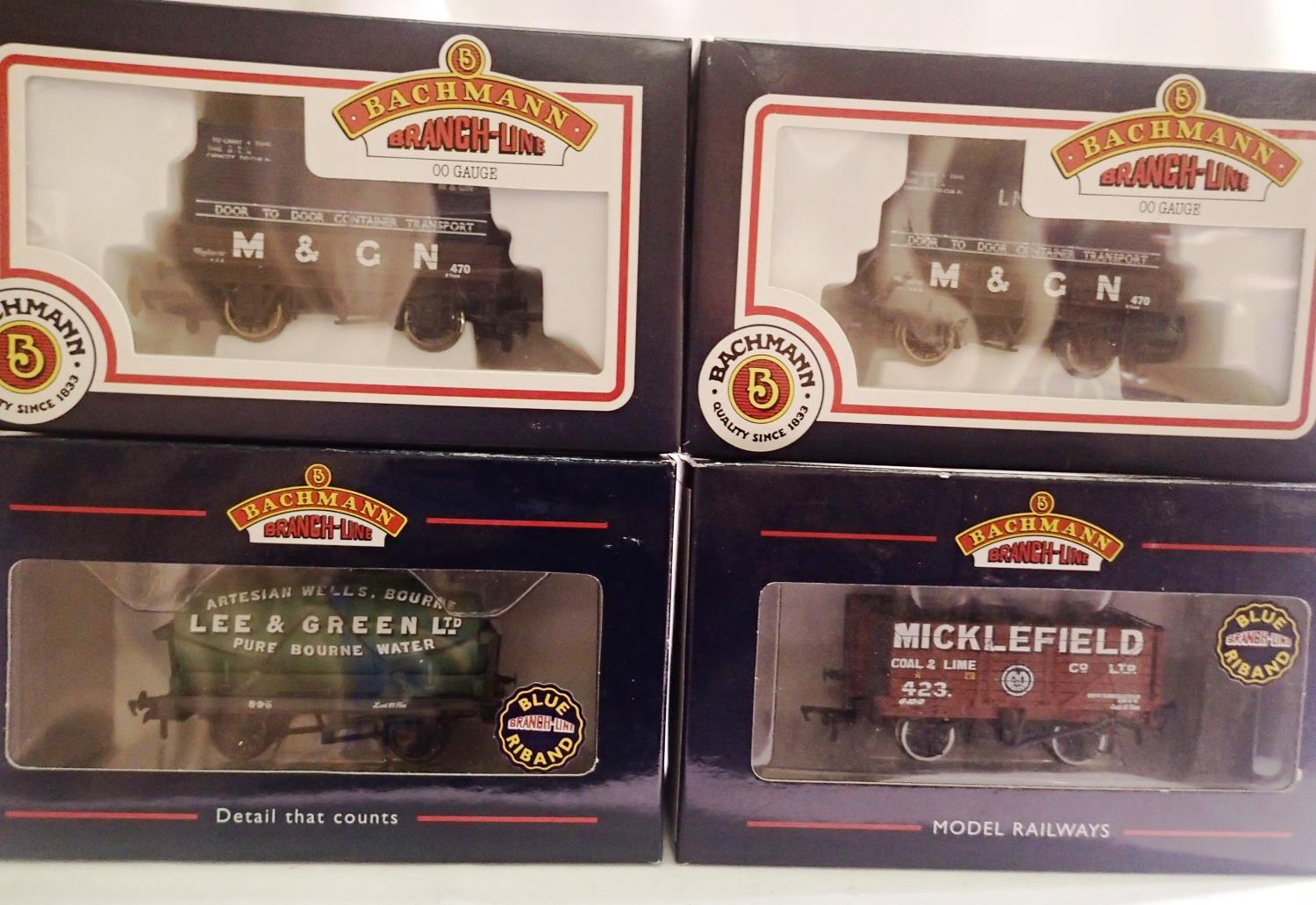 Four Bachmann OO scale wagons comprising: M & GN three plank with container x2, seven plank Micklefield plus Lee & Greenwood tanker, BRM Exclusive, mostly in excellent - near mint condition, boxes with wear. P&P Group 1 (£14+VAT for the first lot and £1+VAT for subsequent lots)