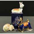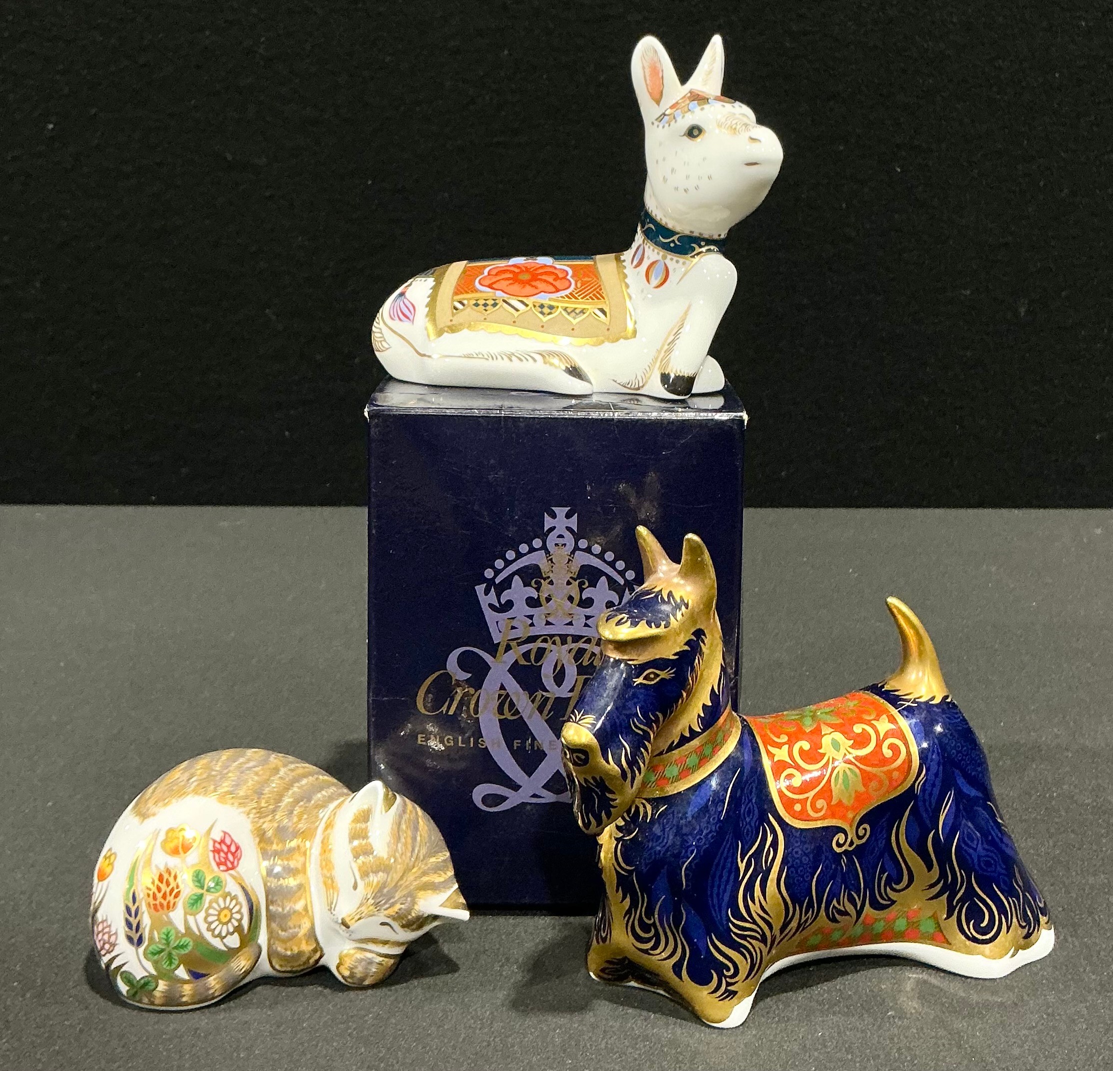 A Royal Crown Derby paperweight, Donkey Foal, gold stopper, 8.5cm high, printed mark in red, boxed; others, Scottish Terrier, silver stopper, 12cm long; Cottage Garden Kitten gold stopper, printed mark in red (3)