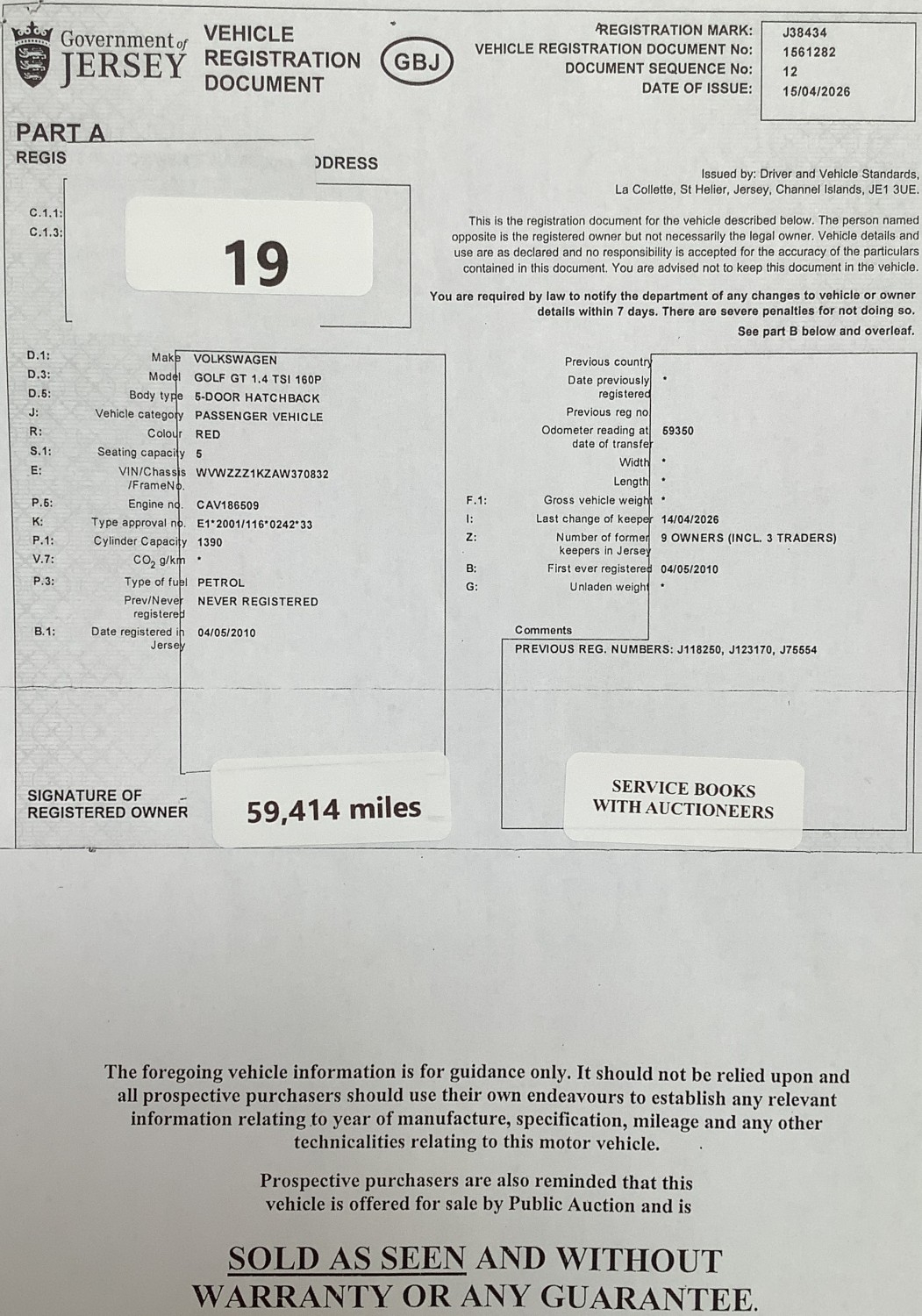 A 2010 Volkswagen Golf GT TSi 1.4 five door hatchback J38434 (petrol/automatic), odometer reading 59,414 miles