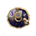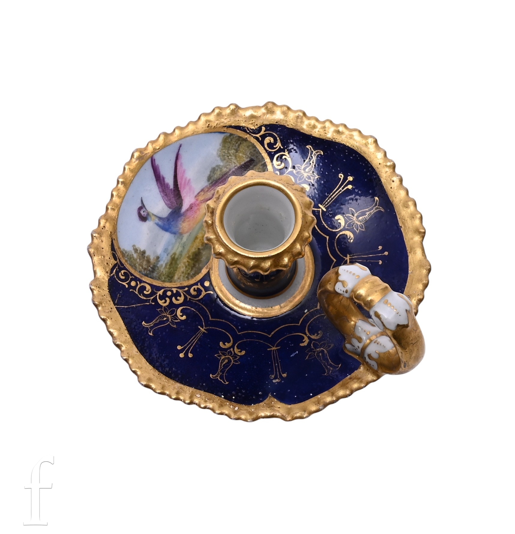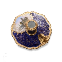 A Flight Barr & Barr Worcester miniature chamberstick, painted with a fabulous bird within oval cartouche over blue ground with gilded detail, painted red marks to reverse, diameter 7.5cm.