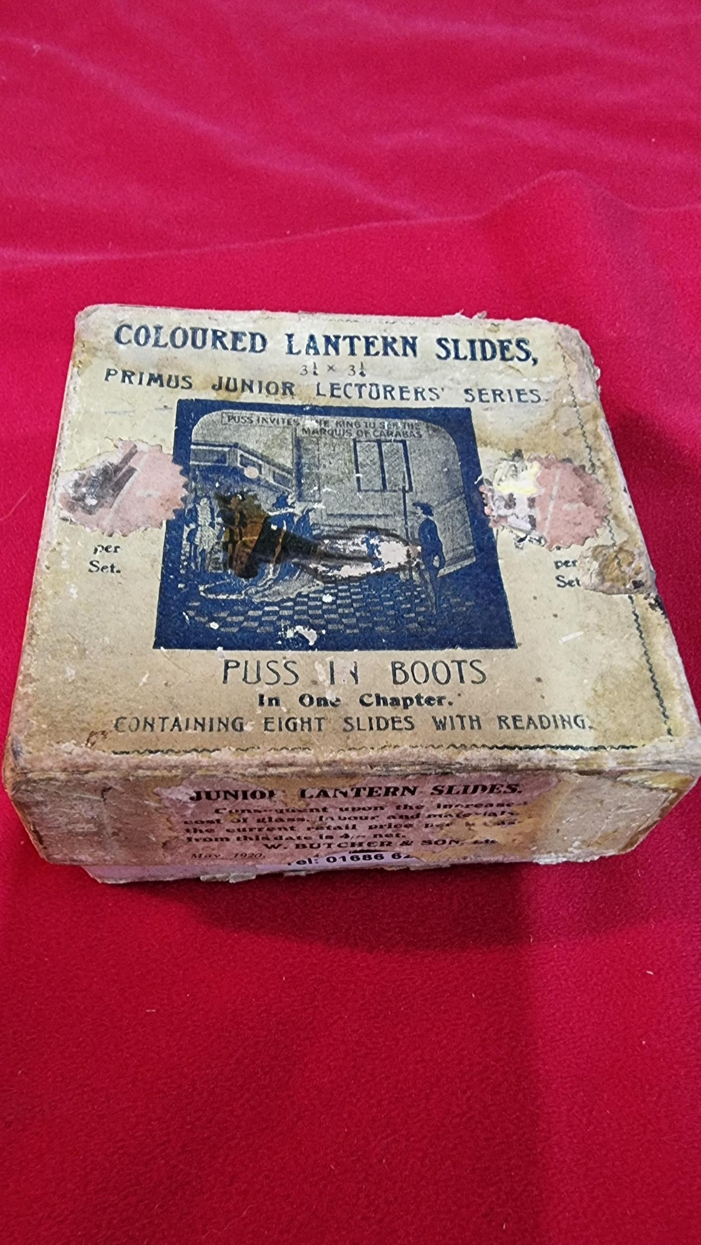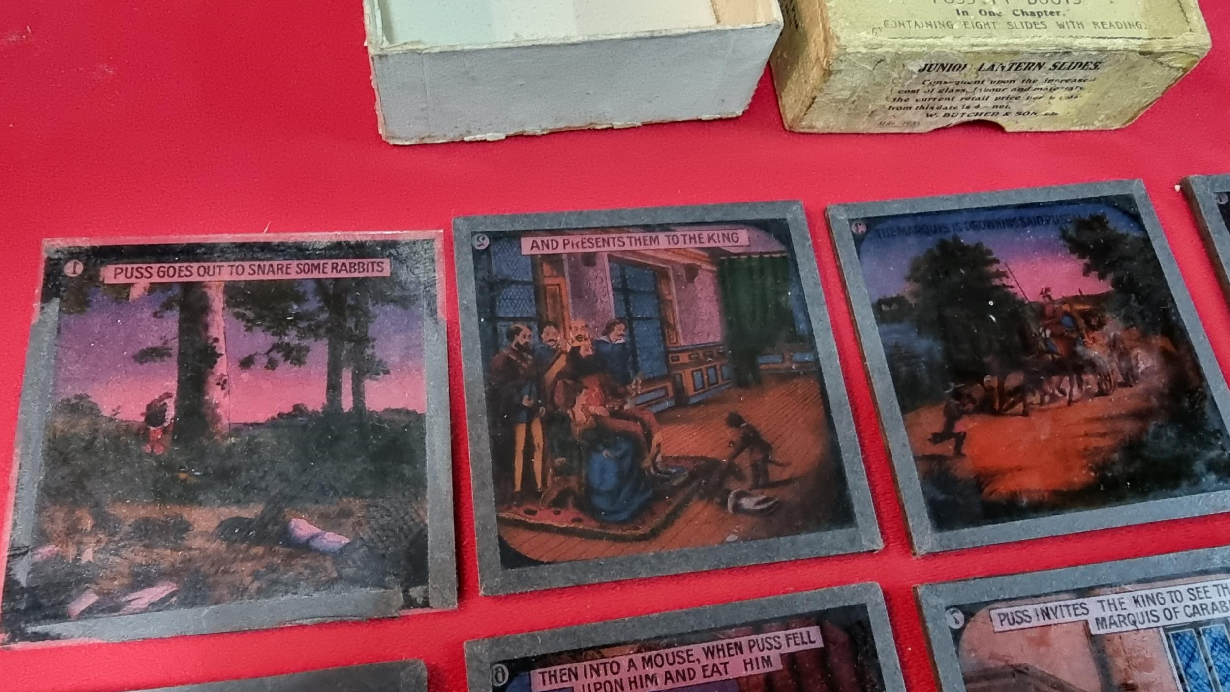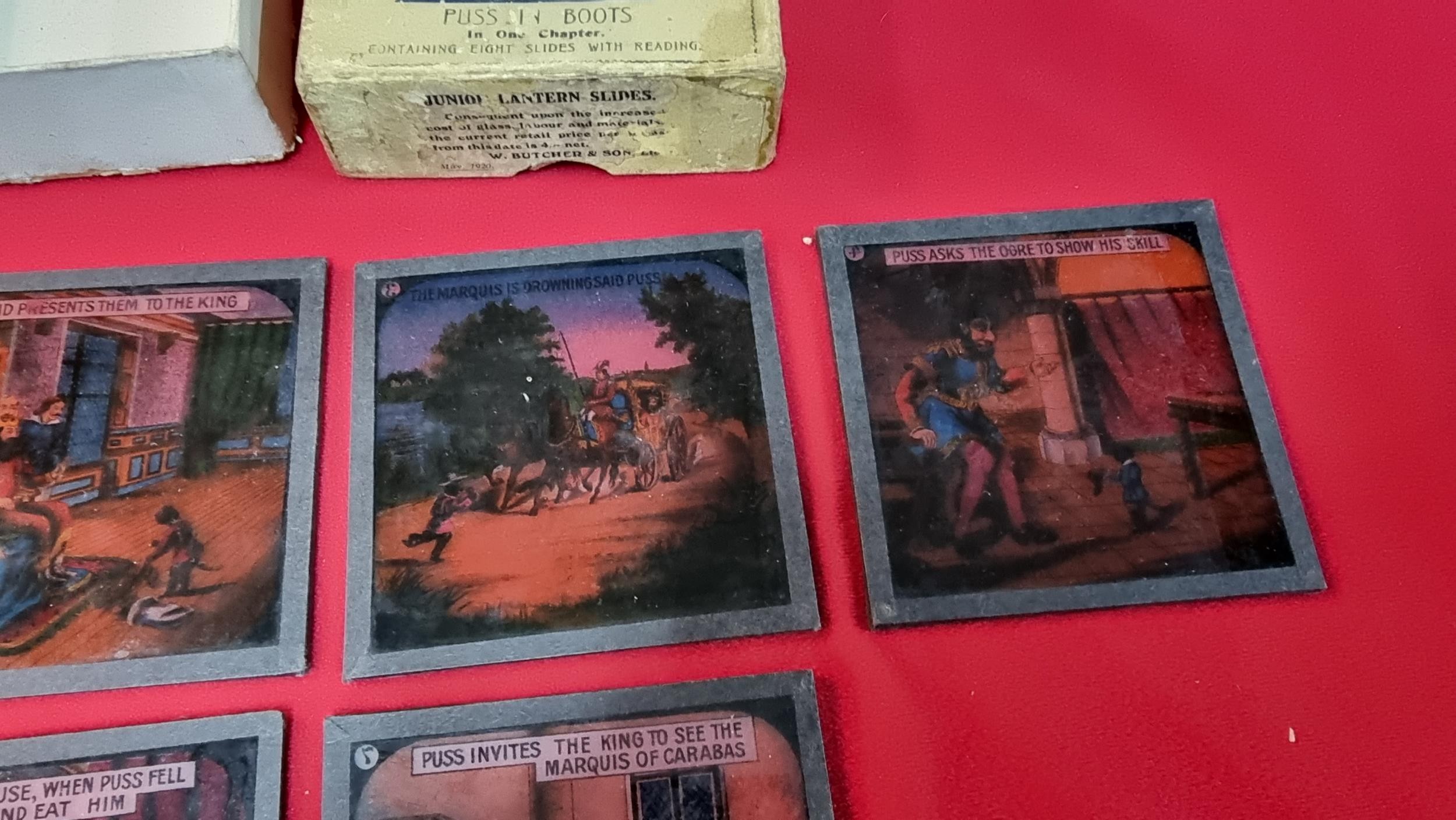 Rare boxed set of Magic Lantern glass slides of Puss In Boots in one chapter, 1 slide is missing from the end. 7x slides in total, dated May 1920.