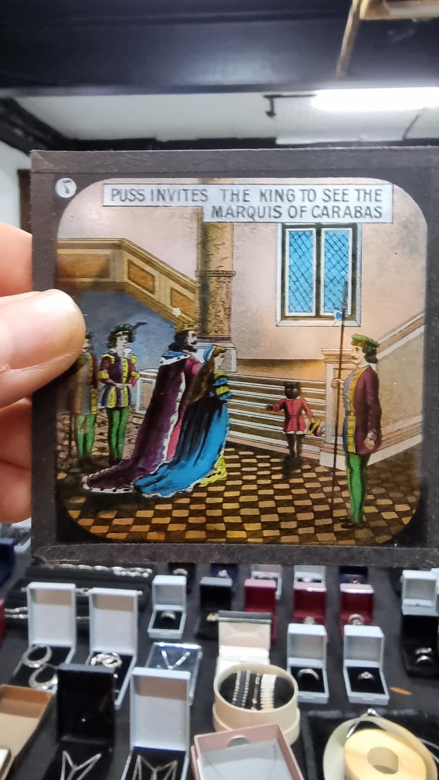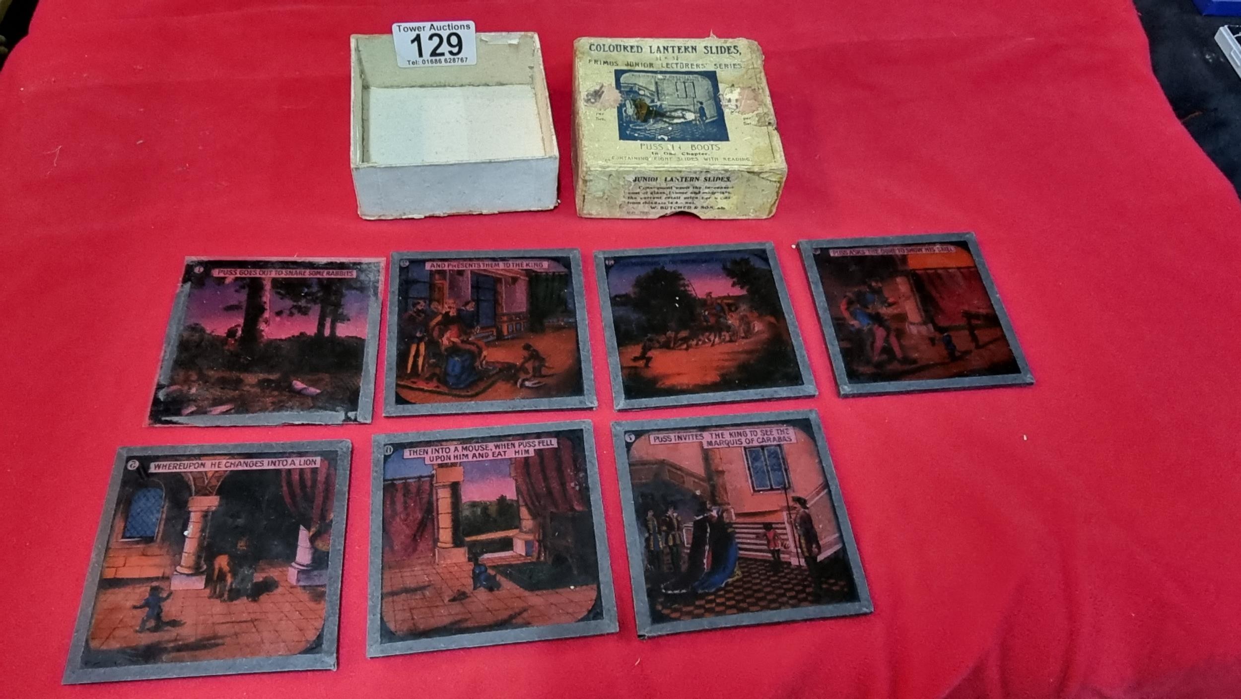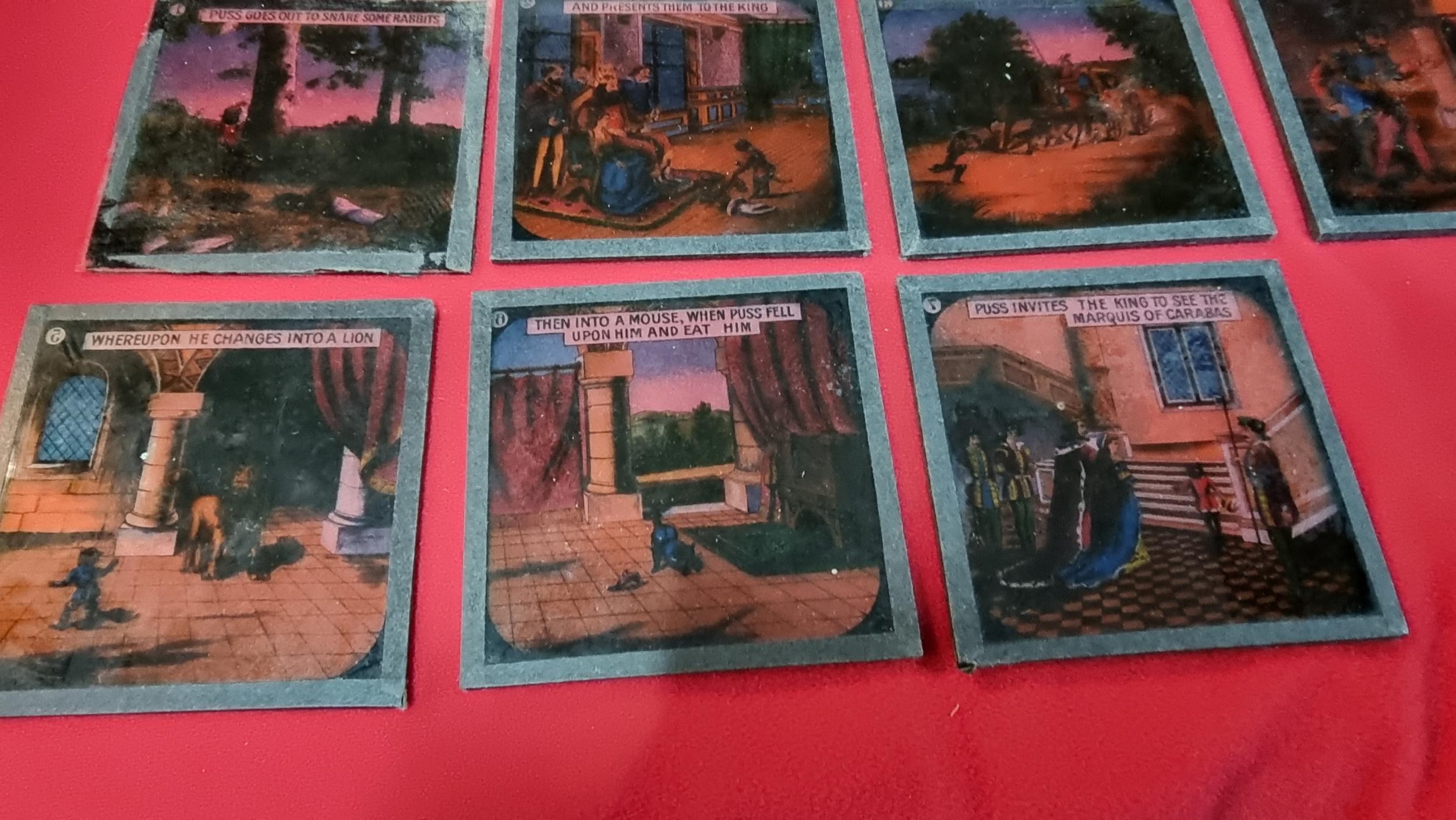 Rare boxed set of Magic Lantern glass slides of Puss In Boots in one chapter, 1 slide is missing from the end. 7x slides in total, dated May 1920.