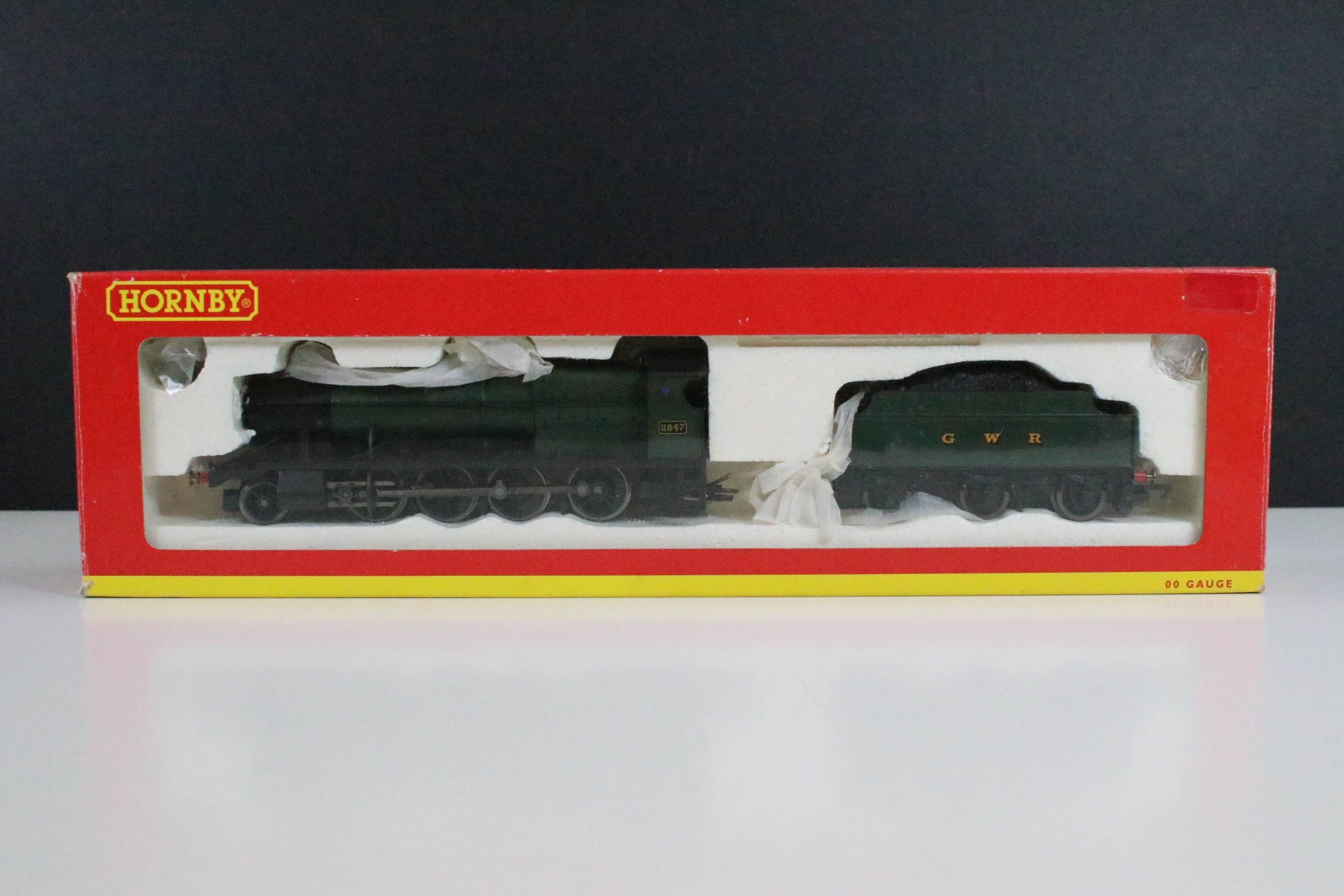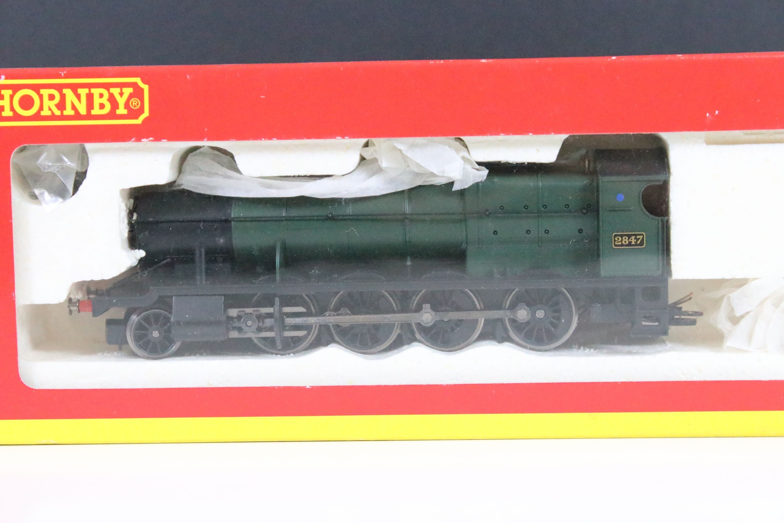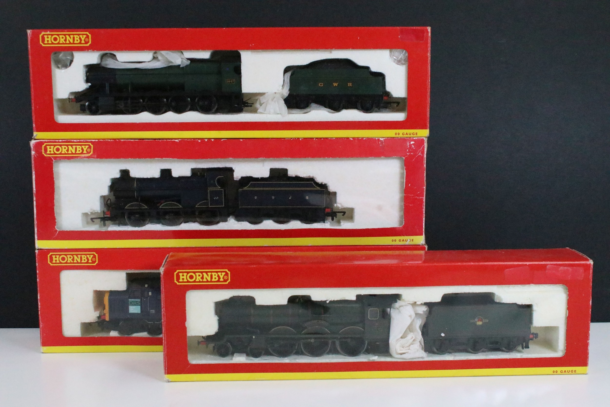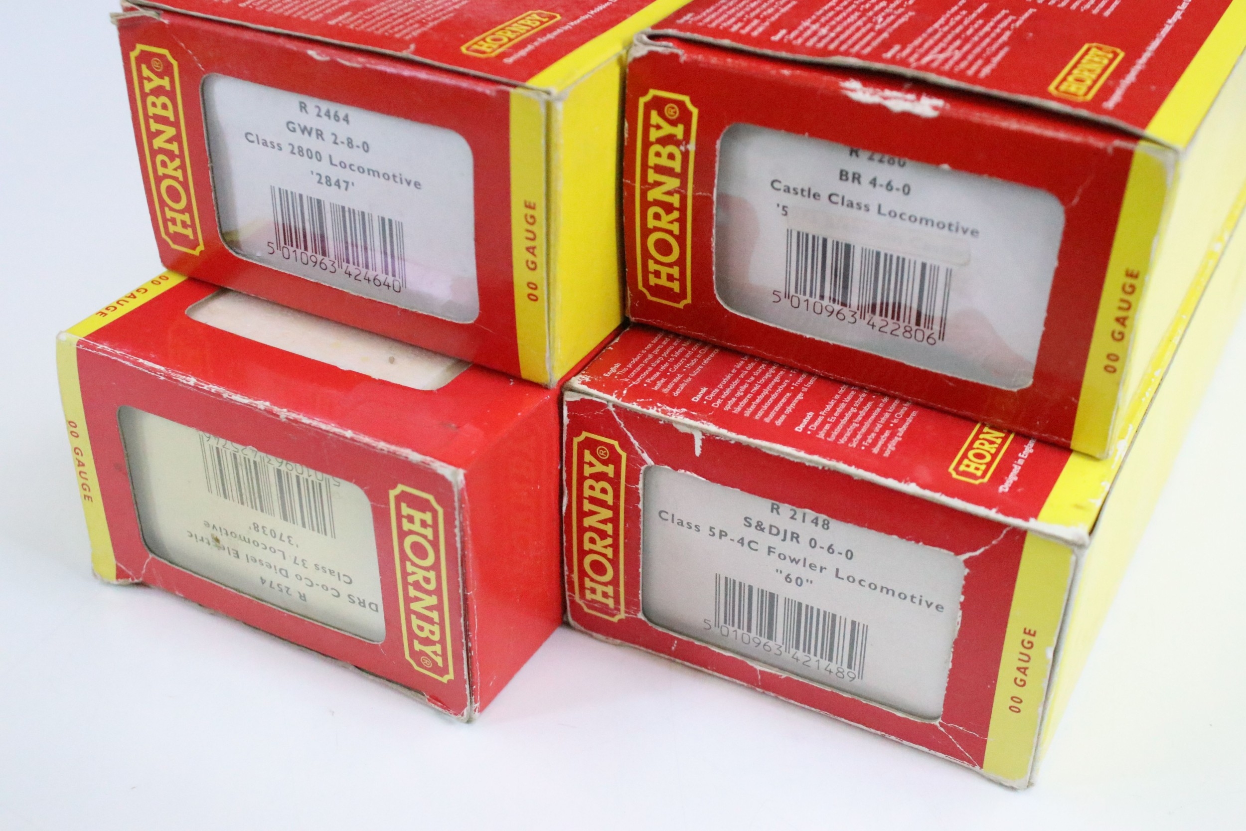 Four boxed Hornby OO gauge locomotives to include R2464 GWR 2-8-0 Class 2800 Locomotive 2847, R2280 BR 4-6-0 Castle Class Locomotive, R2148 S&DJR 0-6-0 Class 5P-4C Fowler Locomotive 60 and R2574 DRS Co-Co Diesel Electric Class 37 Locomotive 37038