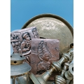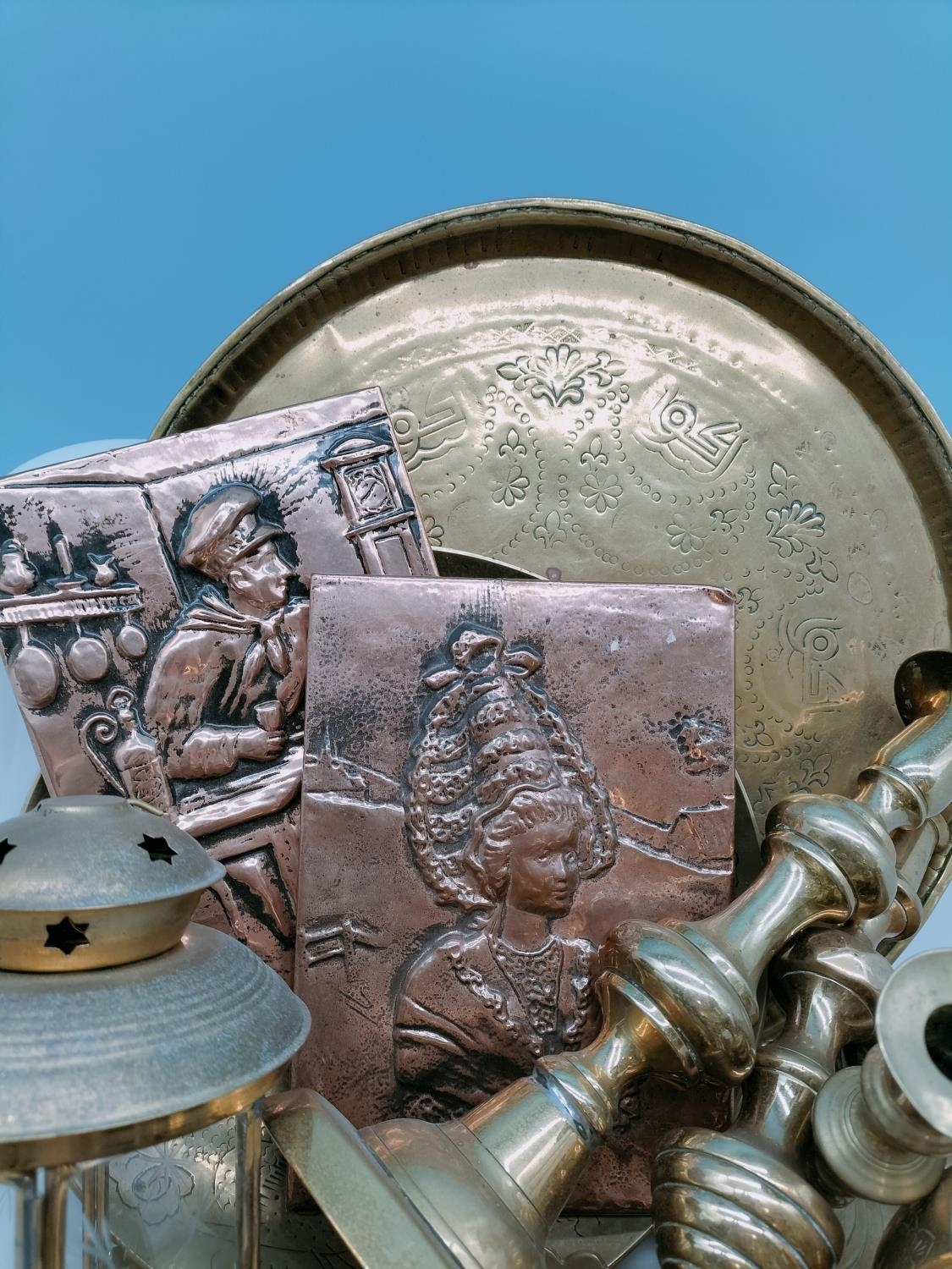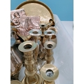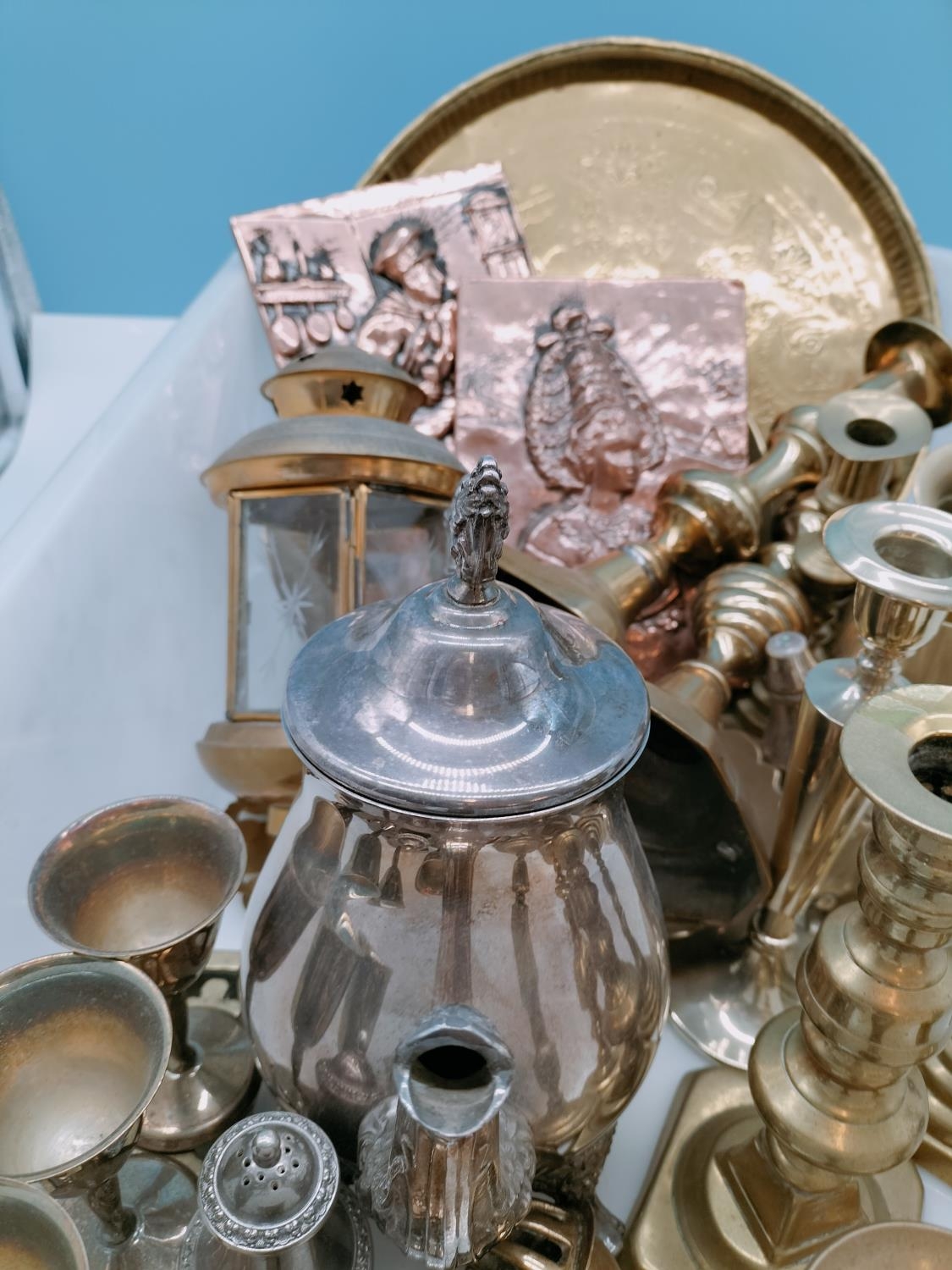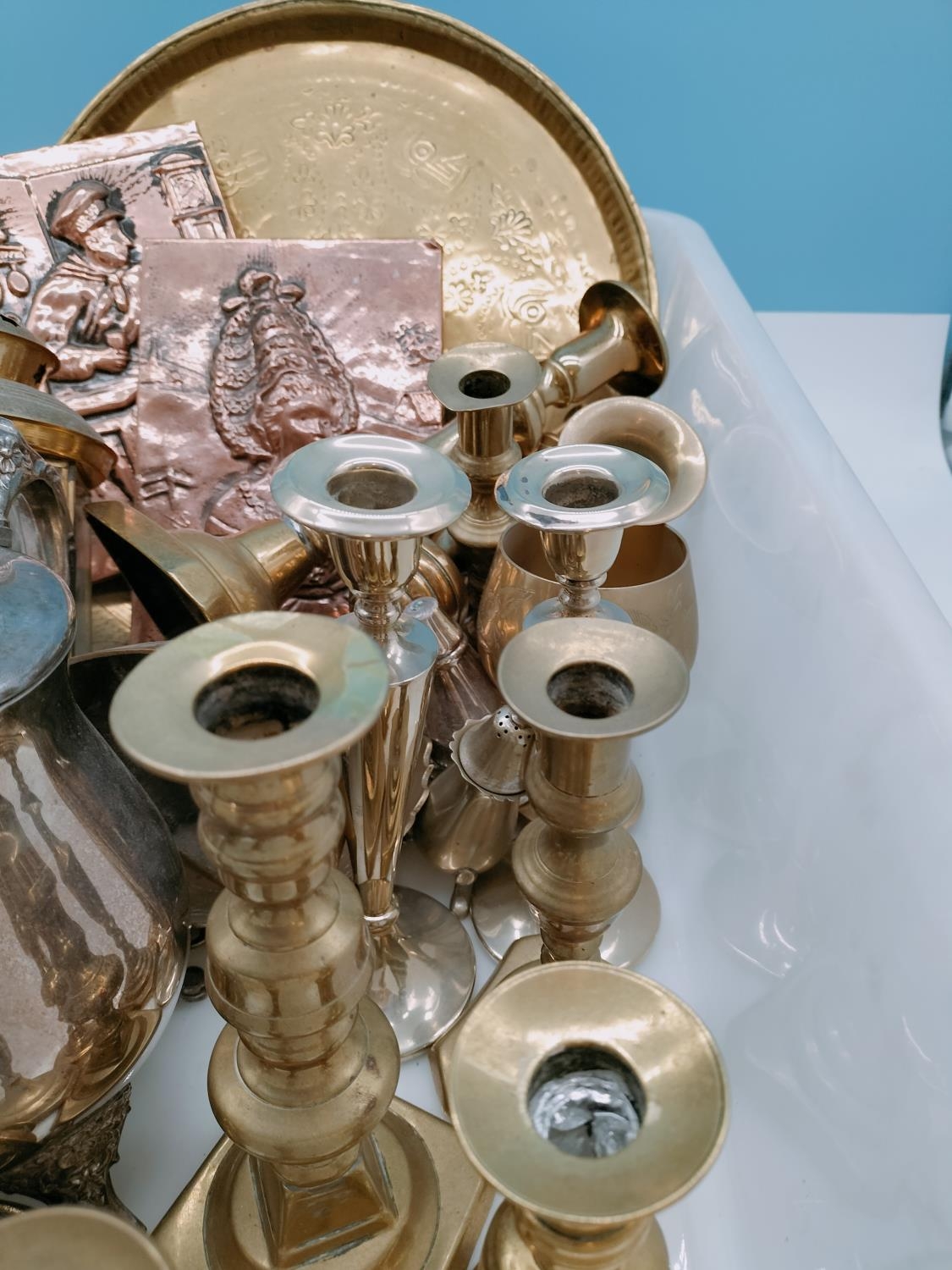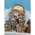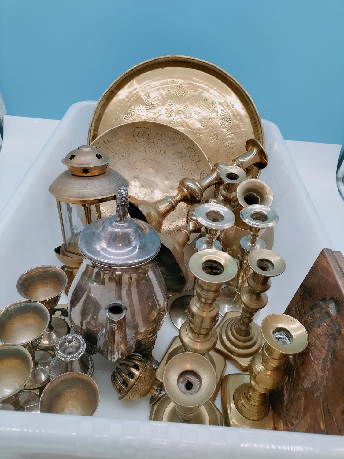Box of Mixed Brass and Silver Plate Items to include Candlesticks, Trays, Lantern, Plaques, etc.