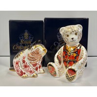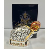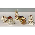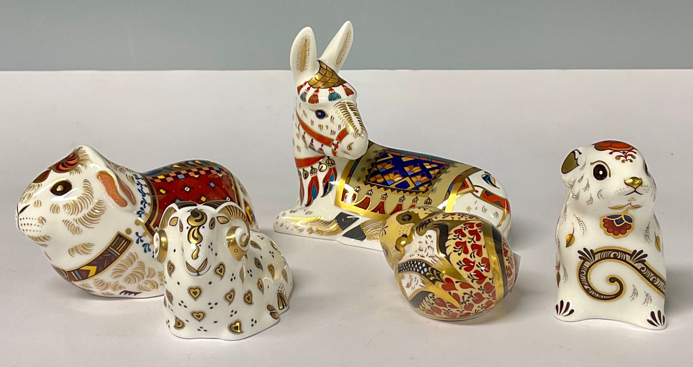 A Royal Crown Derby paperweight, Derby City Ram, silver stopper, 9cm long, printed mark; others, Guinea Pig, silver stopper, 12cm long, printed mark; Donkey, silver stopper, 13.5cm long, printed mark; Country Mouse, silver stopper, printed mark; Mouse, silver stopper, 7.5cm high, printed mark (5)