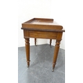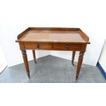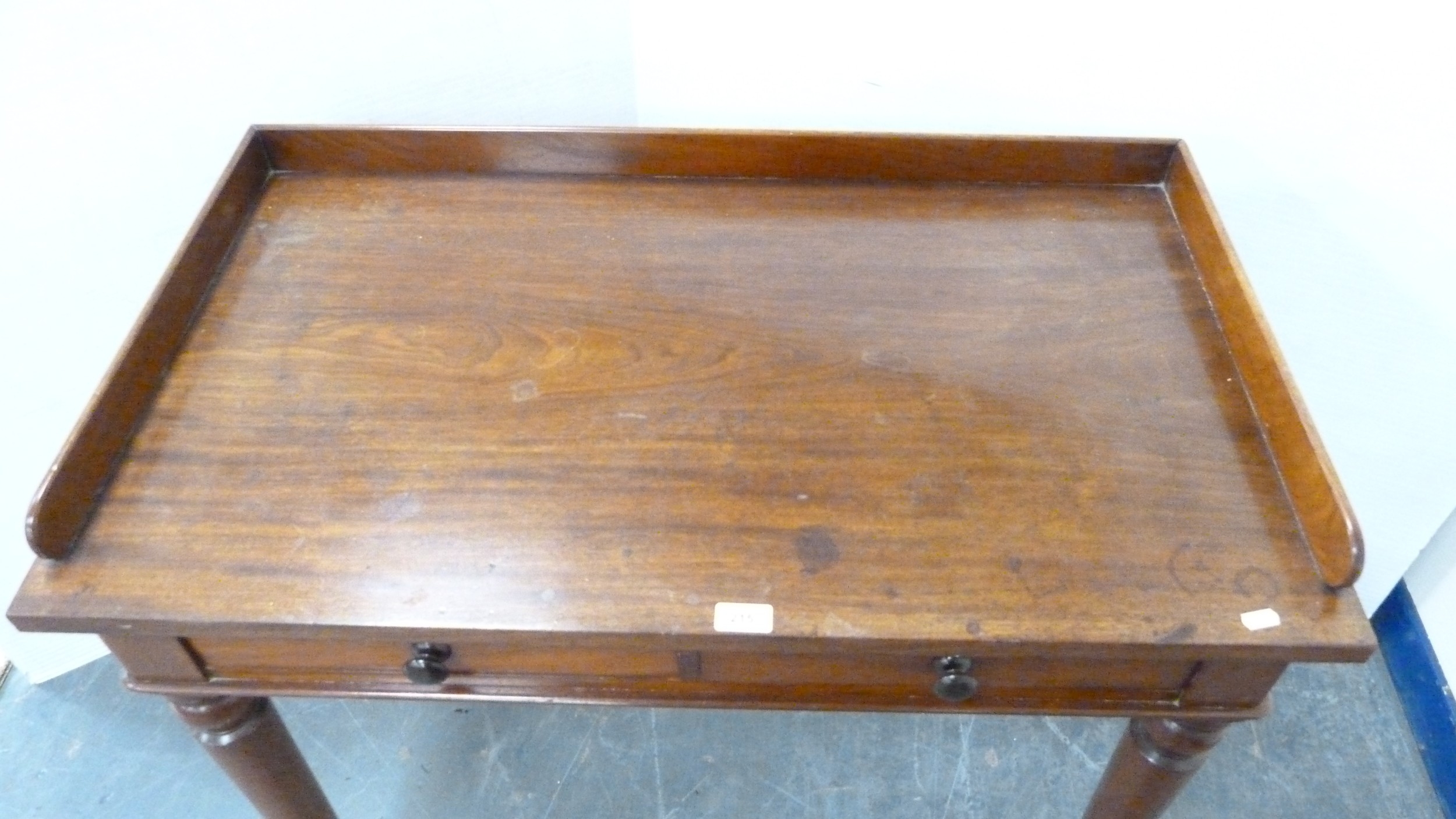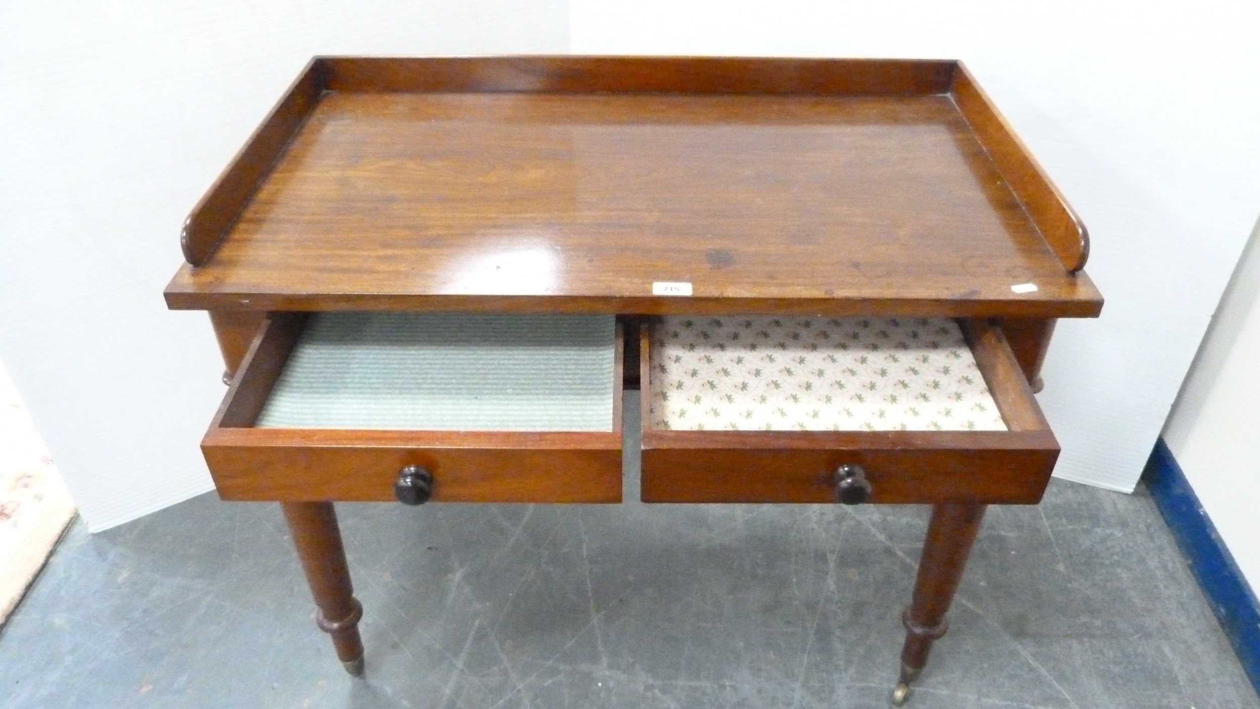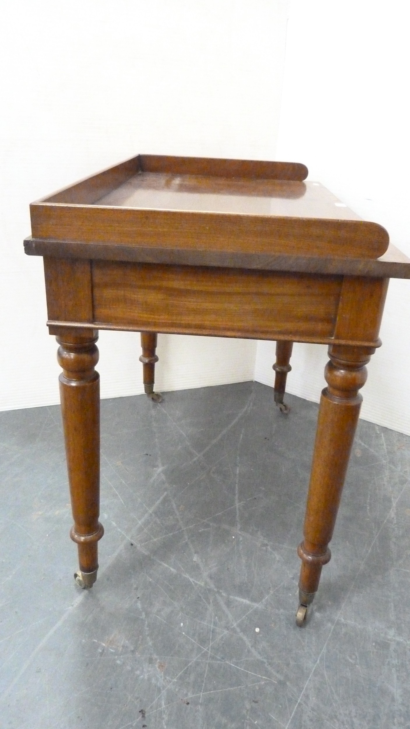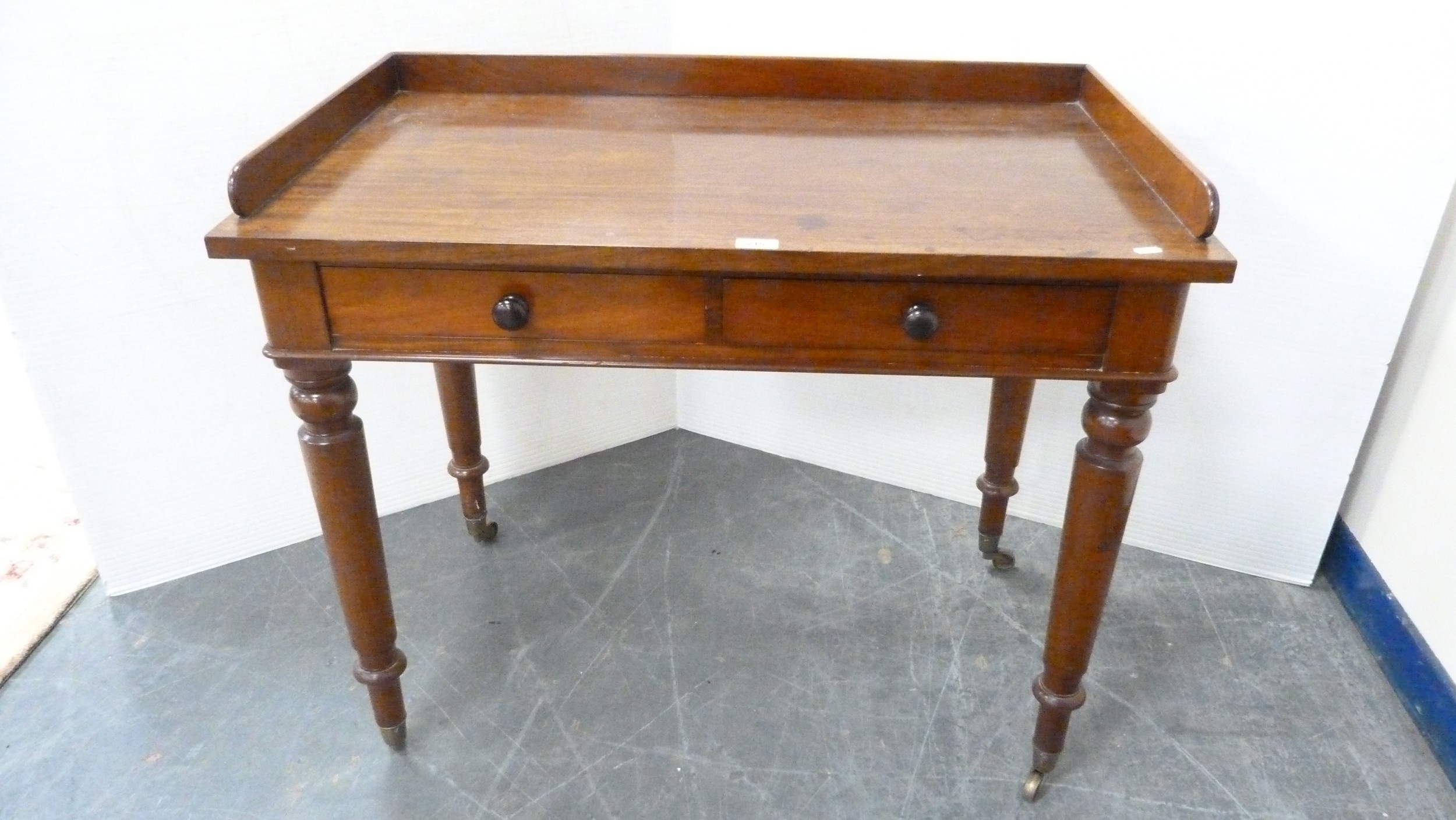 Victorian mahogany two-drawer writing desk with three-quarter gallery.