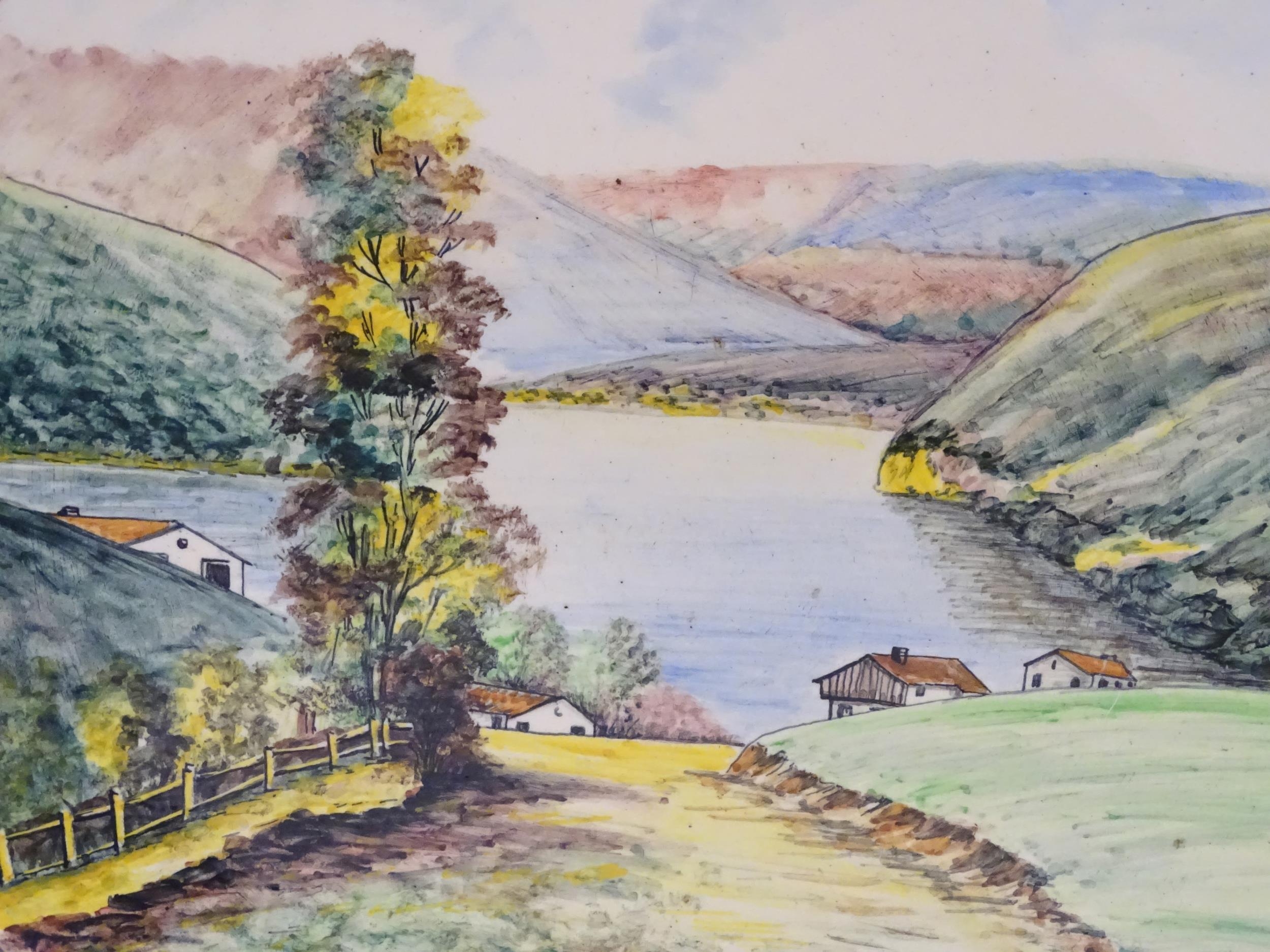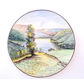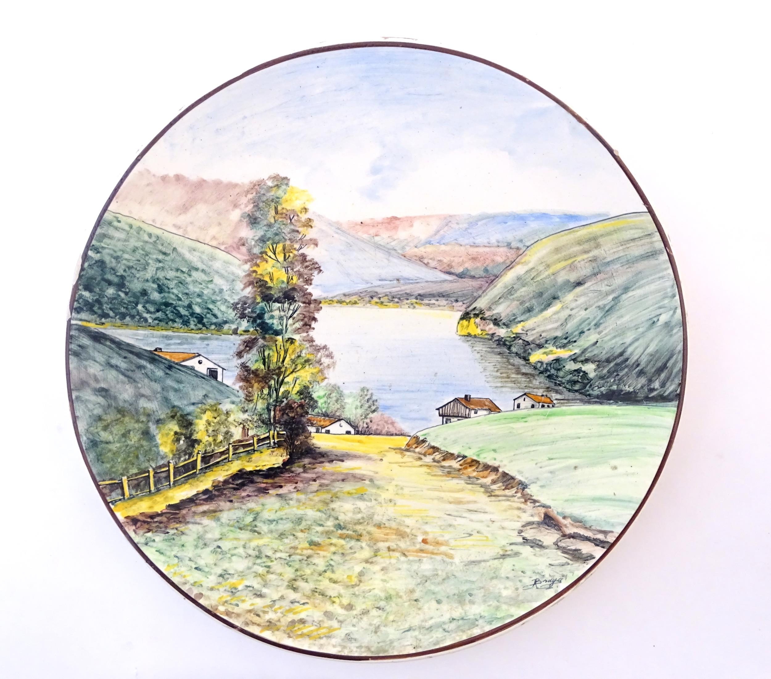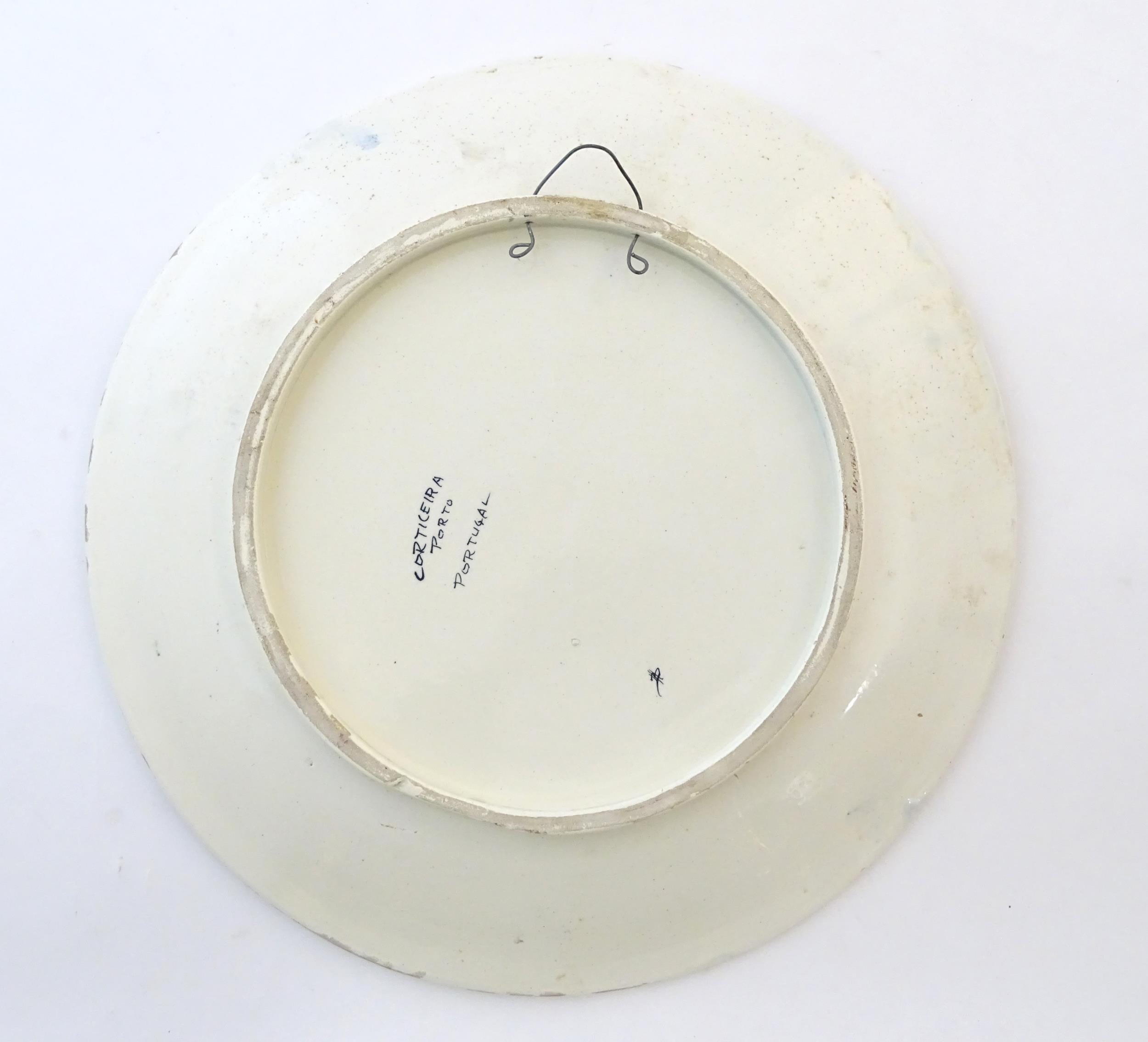 A Portuguese hand painted charger depicting a landscape scene in Corticeira, Porto, Portugal. Ascribed verso. Approx. 15 1/4" diameter