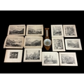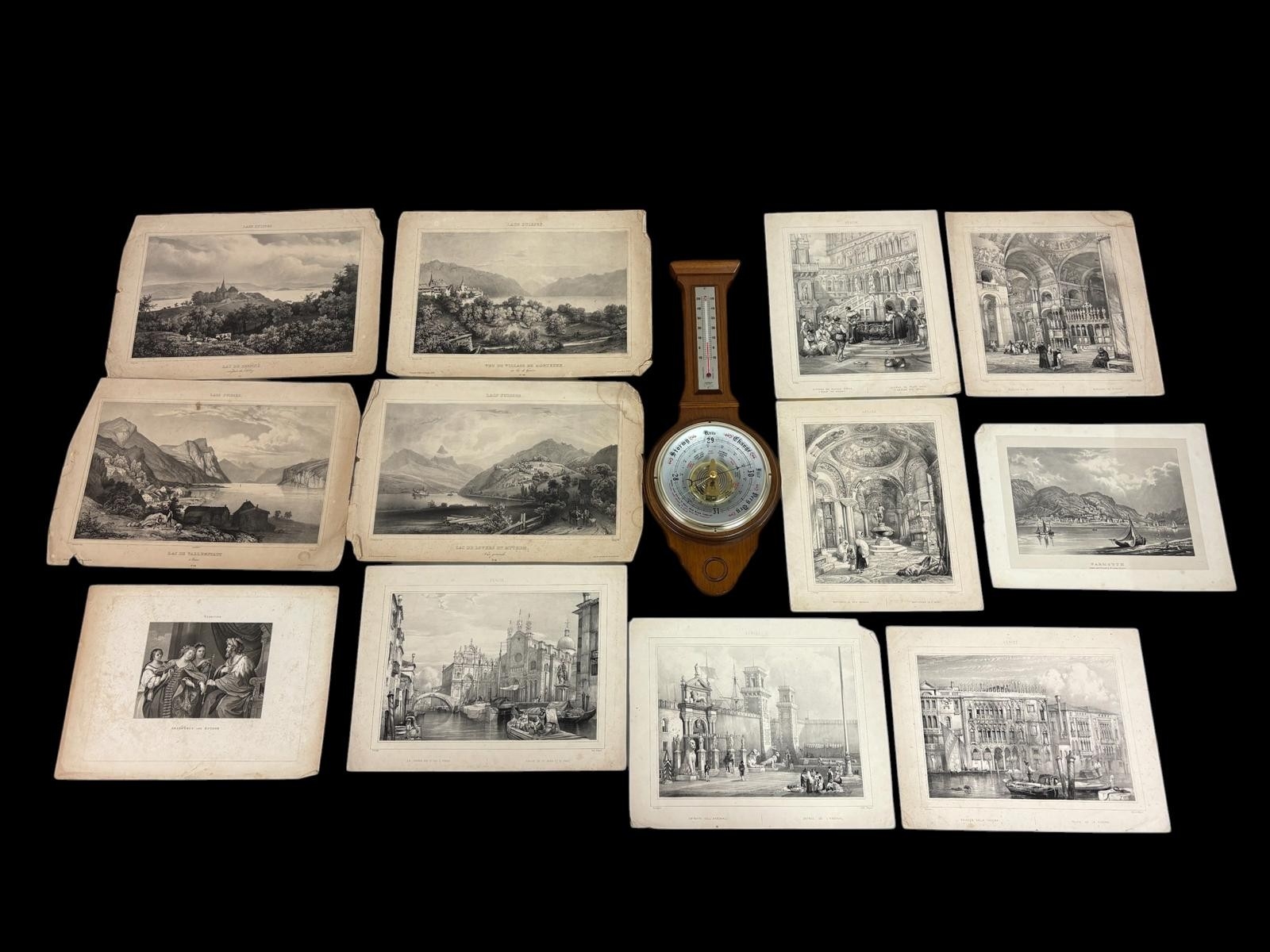 A COLLECTION OF TWELVE SCENIC LITHOGRAPHS together with a vintage timber framed banjo barometer 56cm (h)
