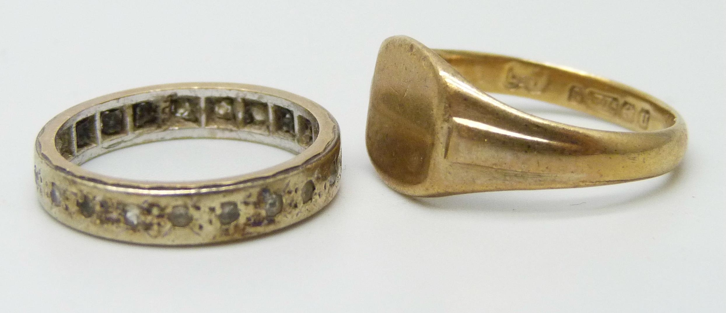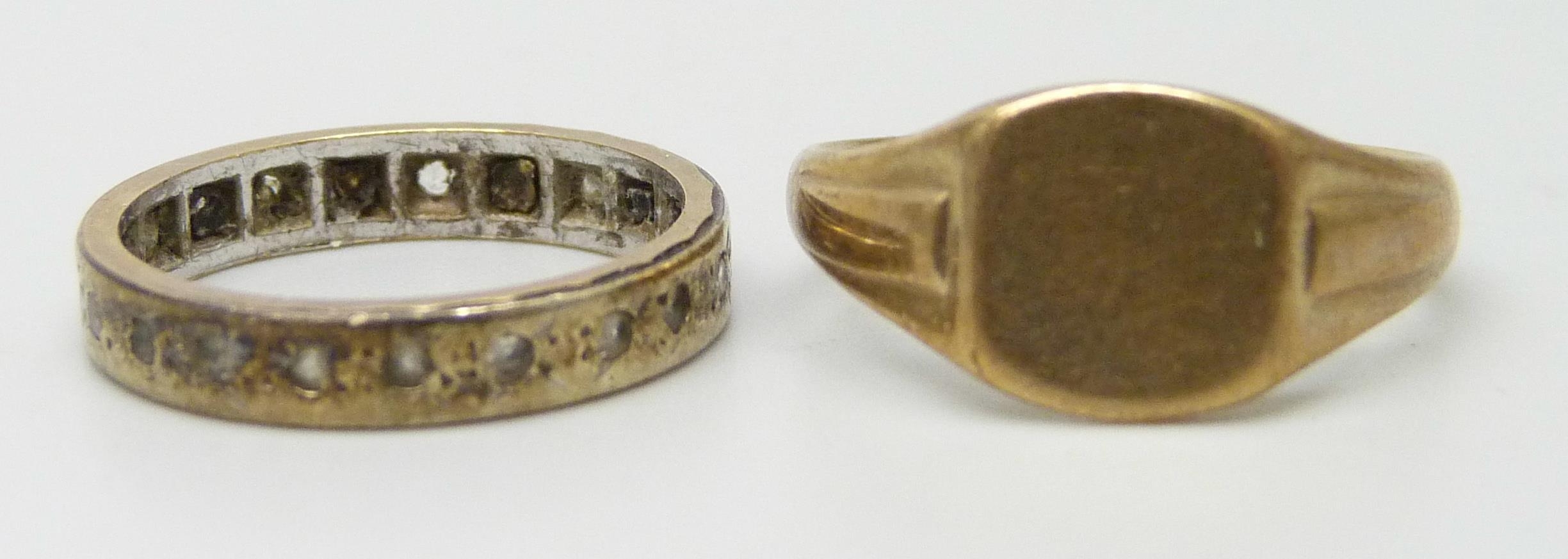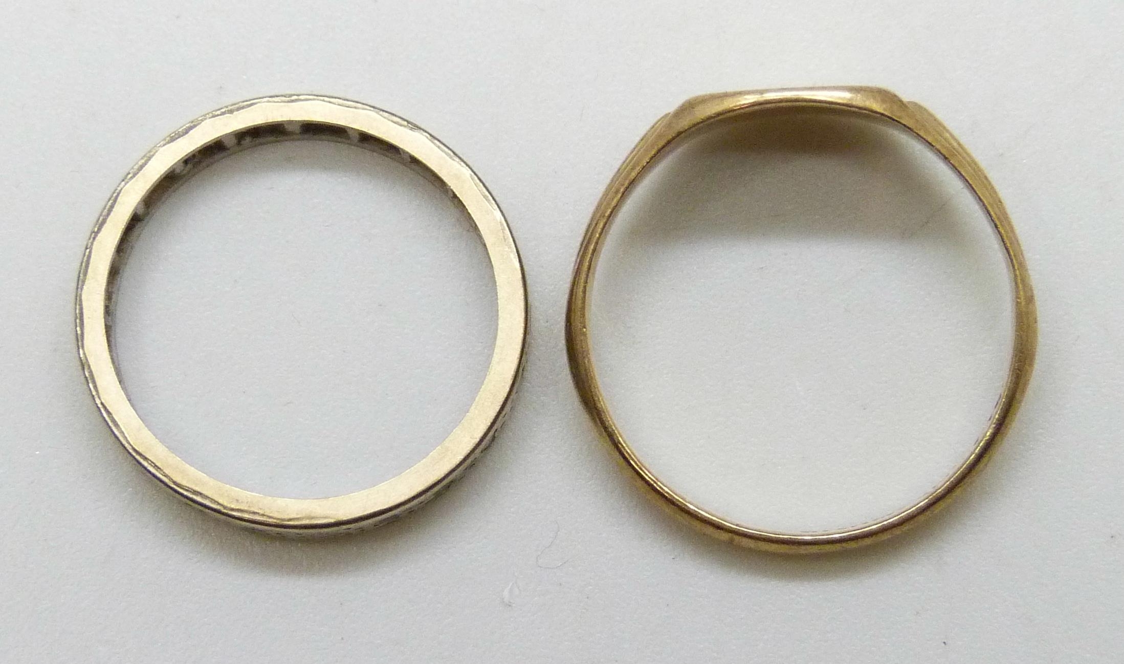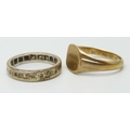 A 9ct gold signet ring, 2.1g, M, and another unmarked ring, I/J