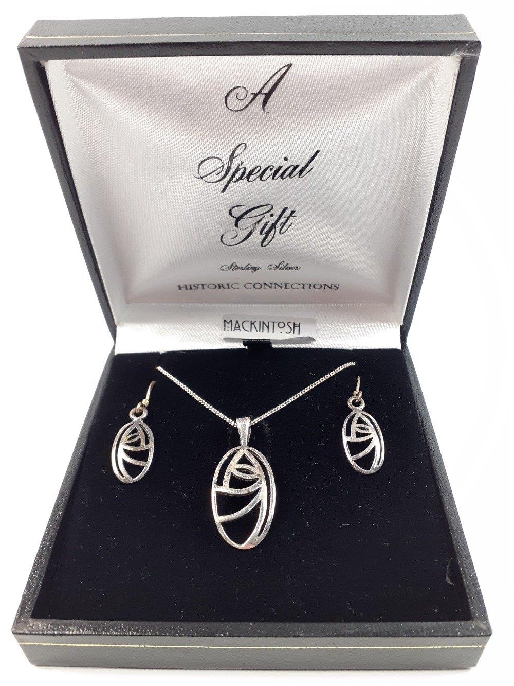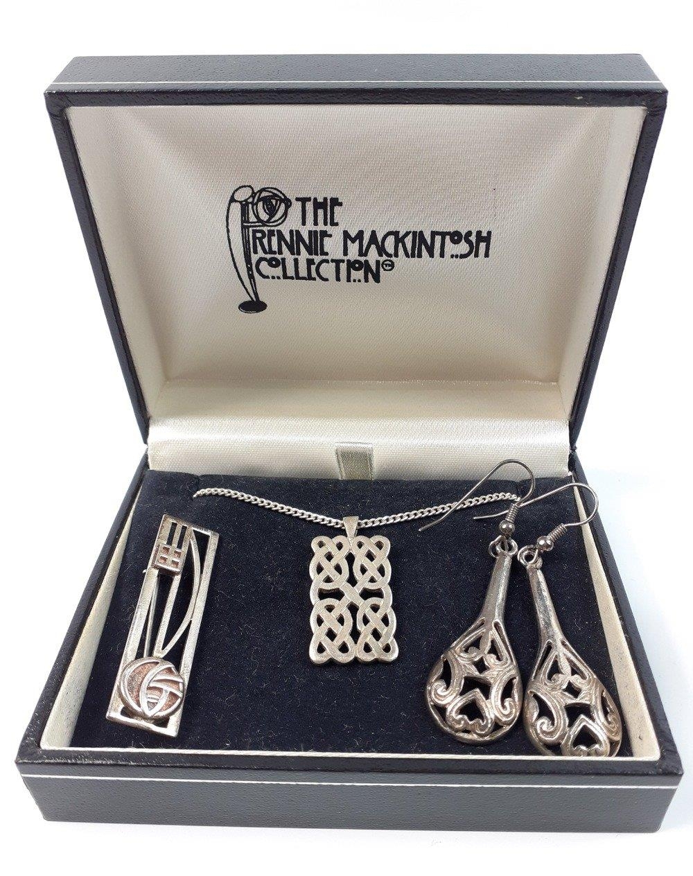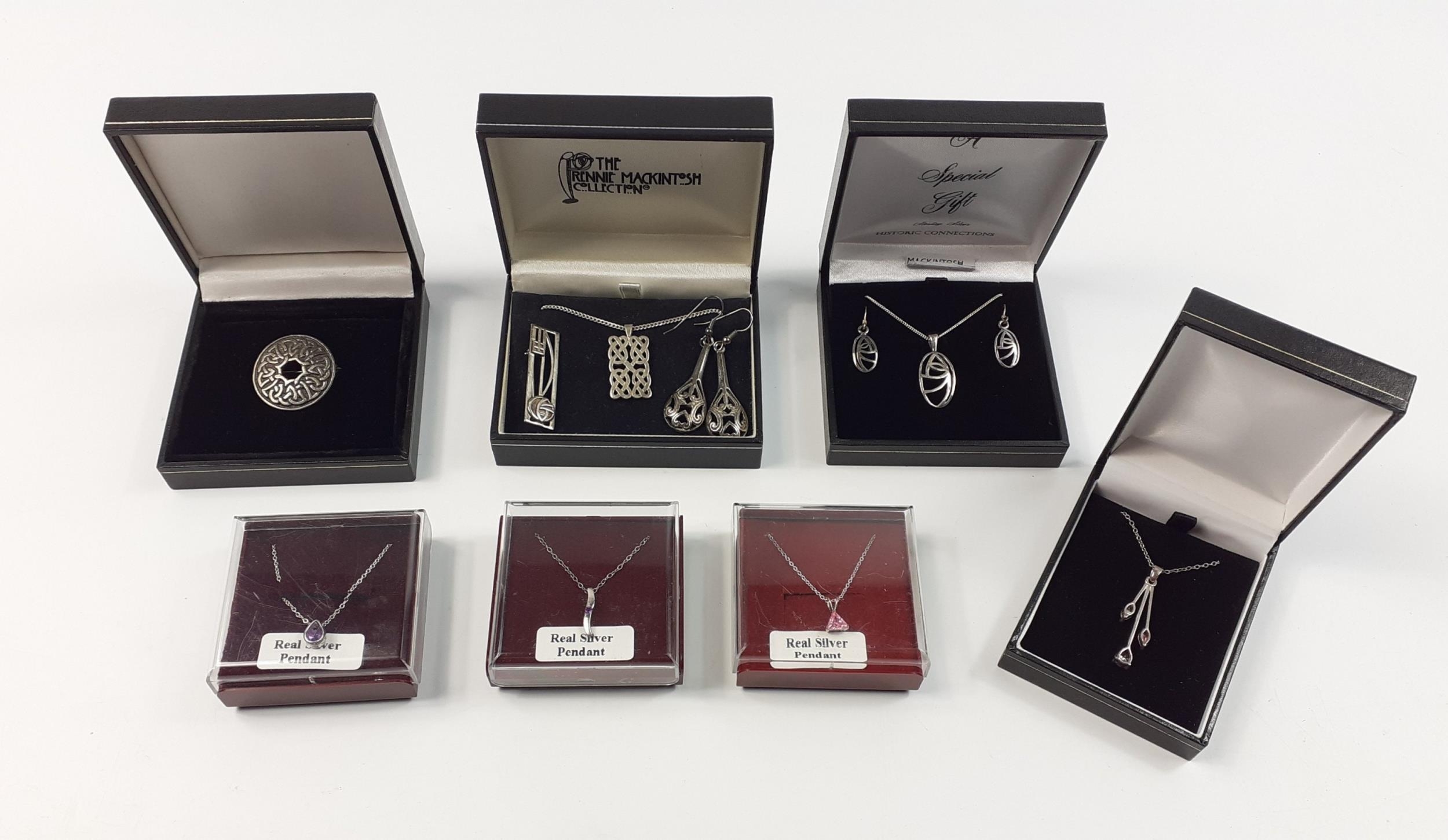 A collection of silver jewellery to include a CHARLES RENNIE MACKINTOSH necklace and earring set and others, a silver stamped IONA brooch and various necklaces