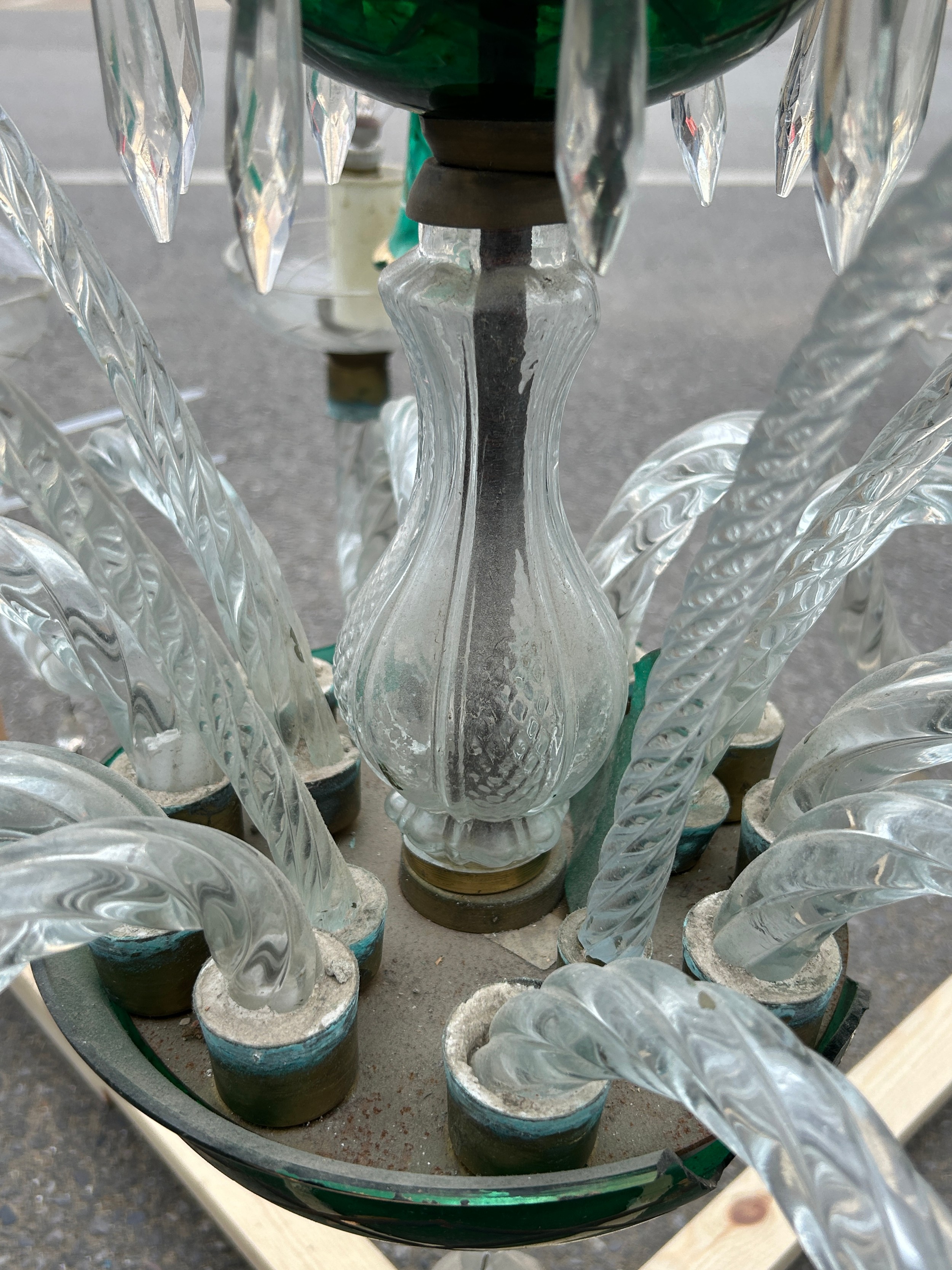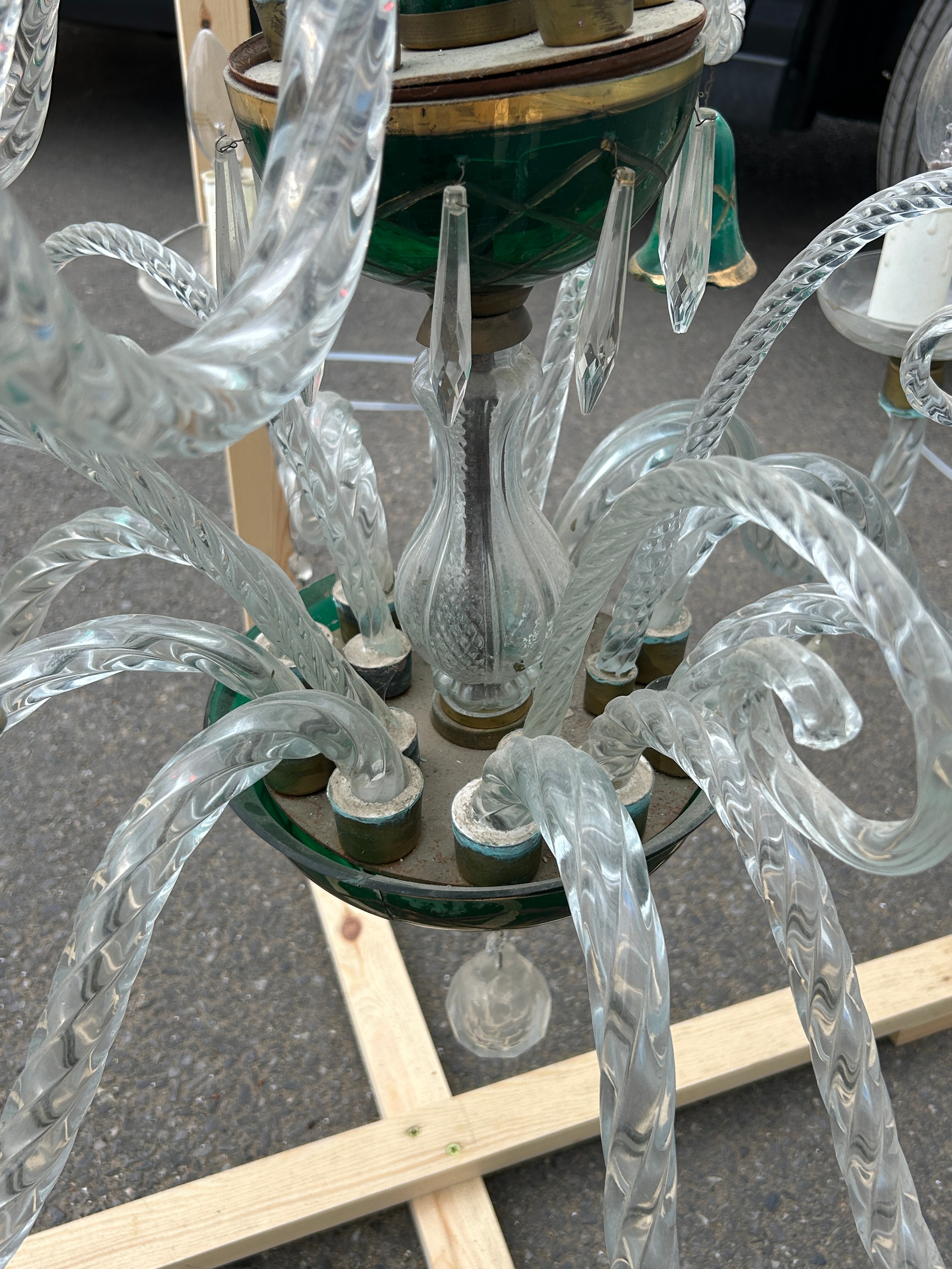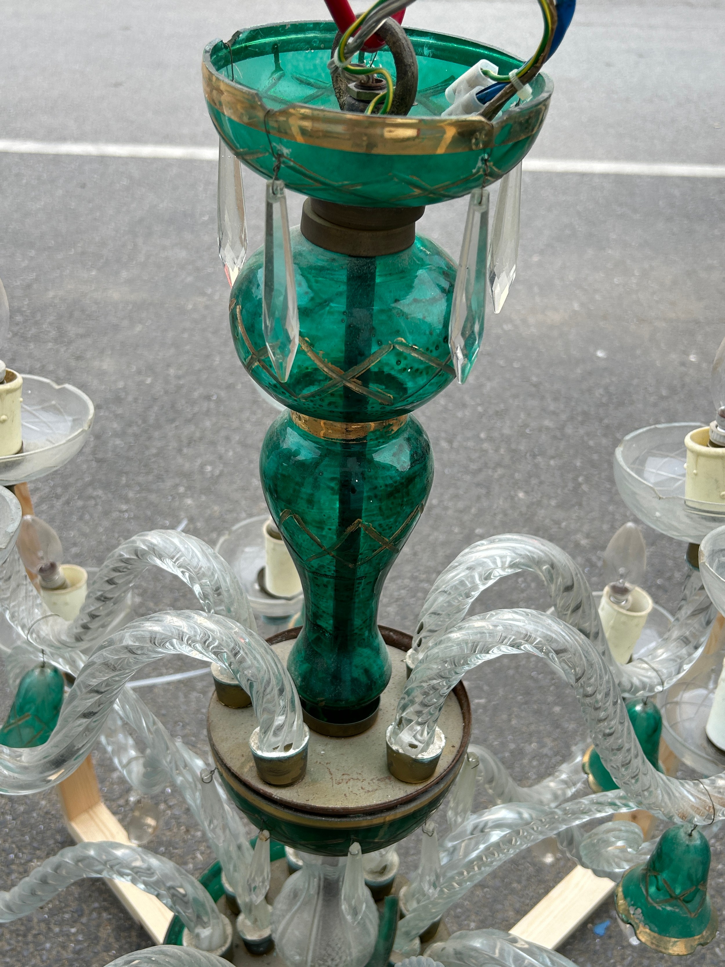 A BOHEMIAN GREEN CRYSTAL AND MURANO GLASS TWELVE ARM CHANDELIER,