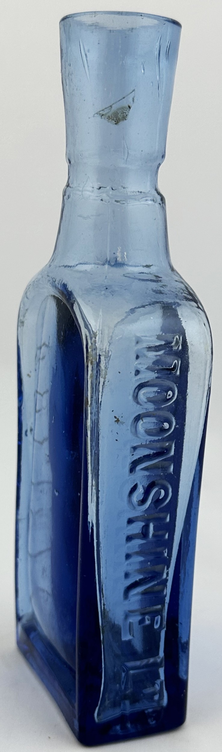CARLISLE LEATHER POLISH BOTTLE. 6.75ins tall. Embossed side panels. Moonshine. Unusual neck. Slight lip nick