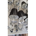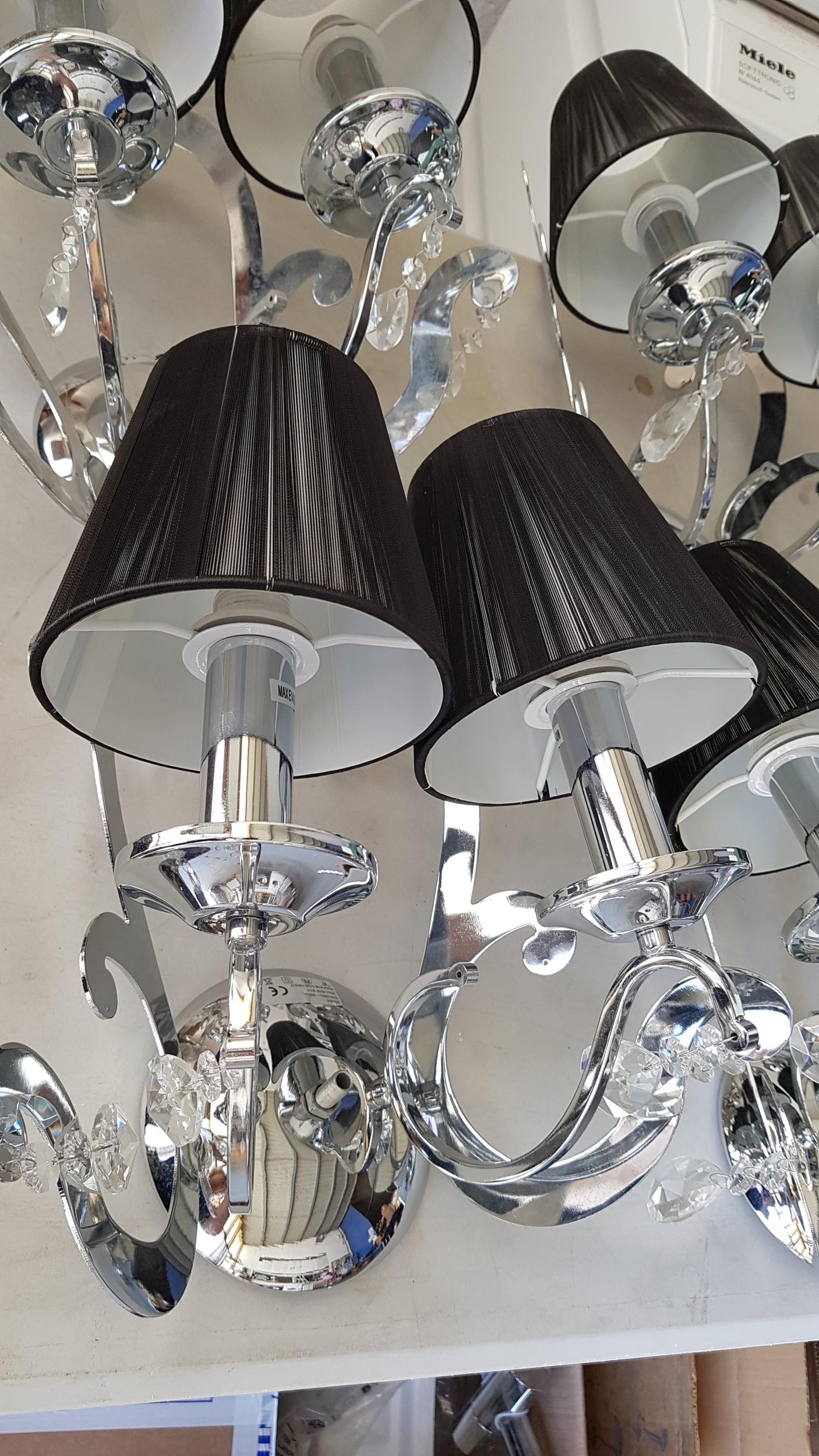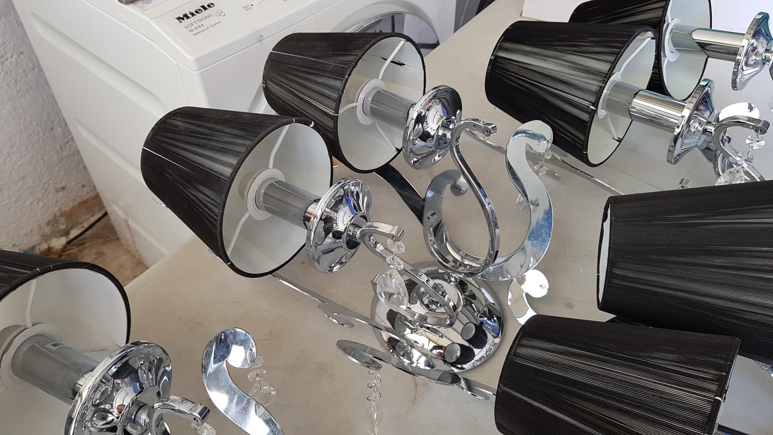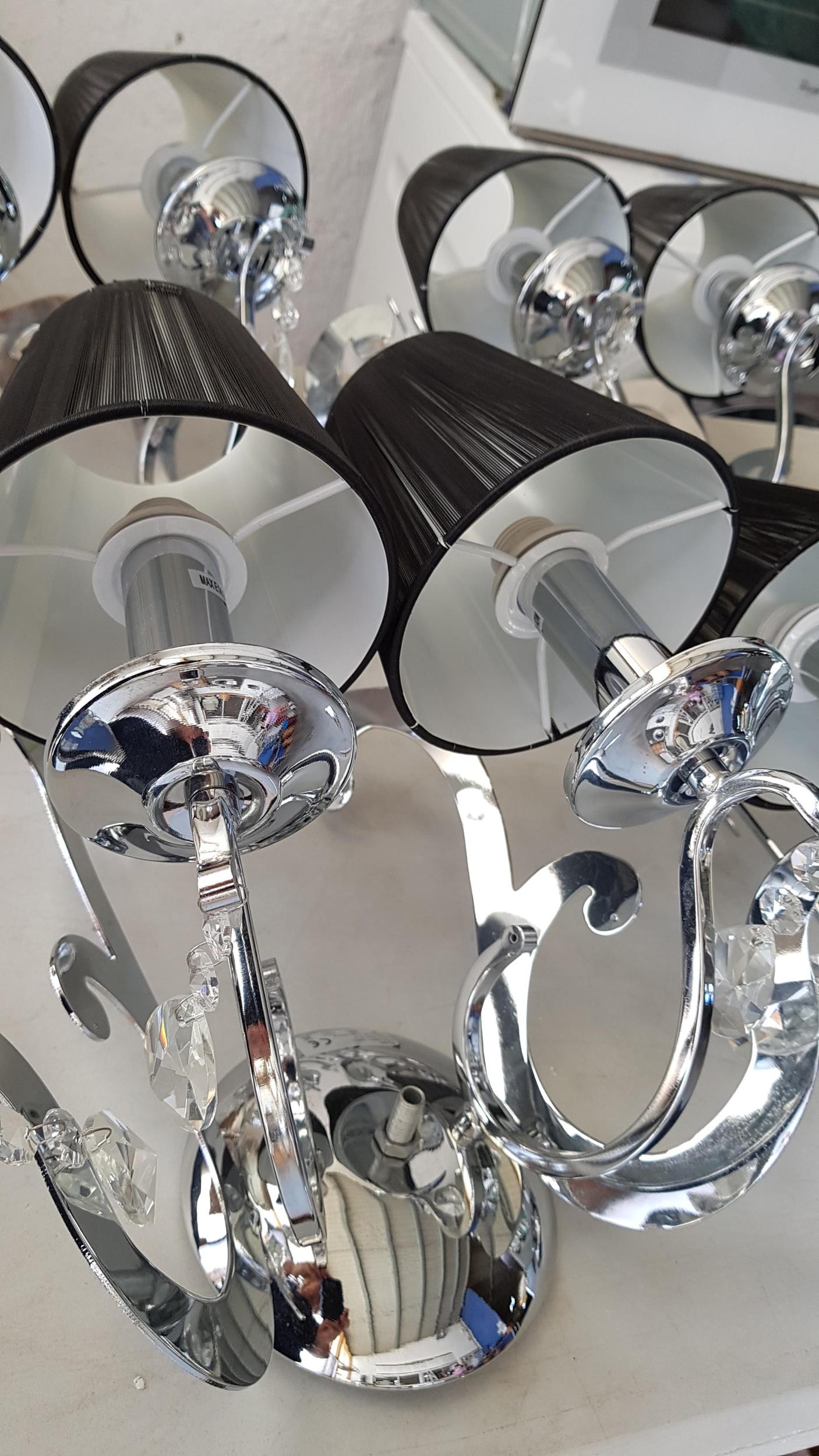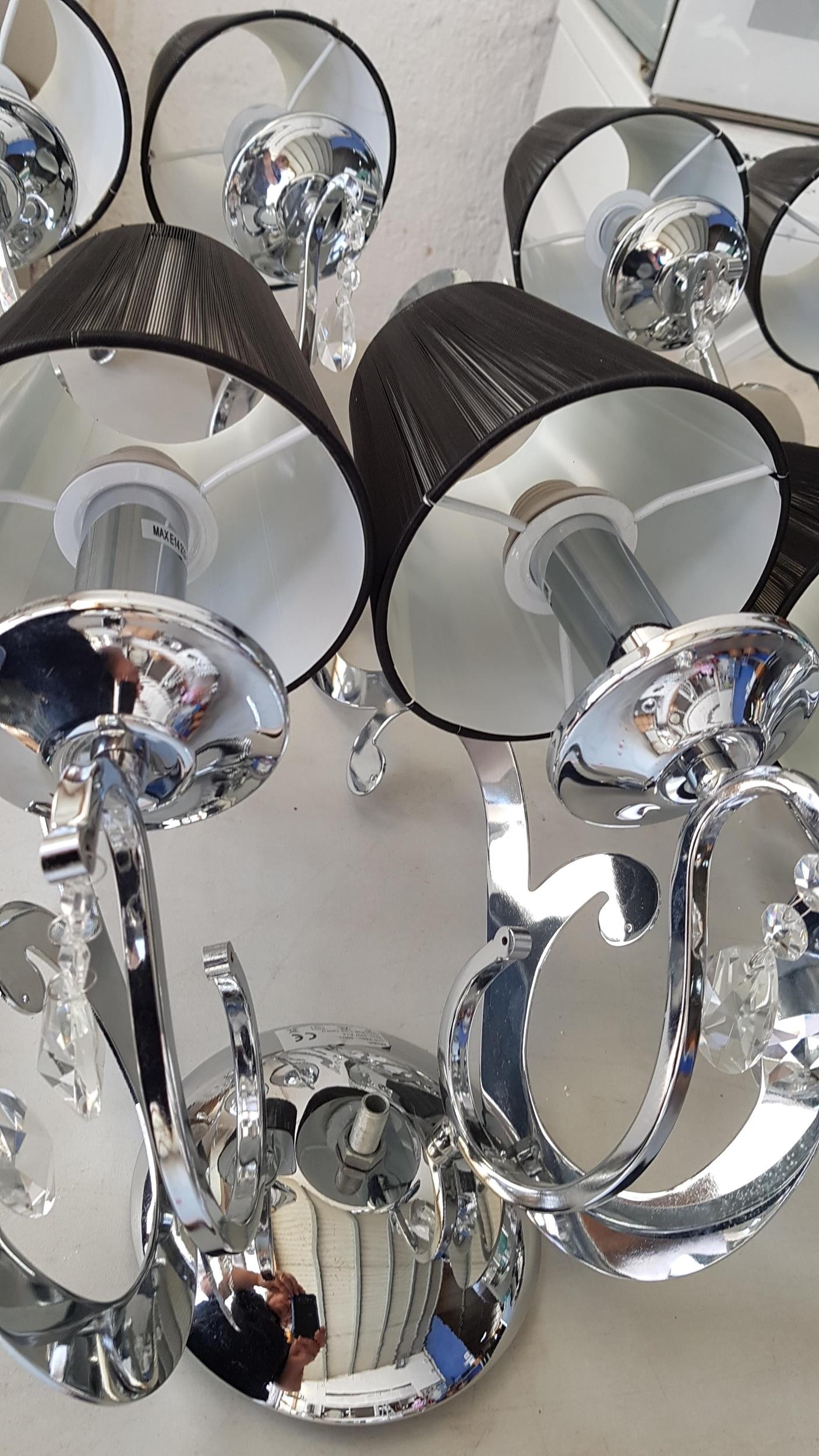 5 x 2- Arms Kumina Decor Modern Chrome / Black Wall Lights and Black Lampshades Decorated with Crystals (Some Missing), (Un-Tested, A/F)