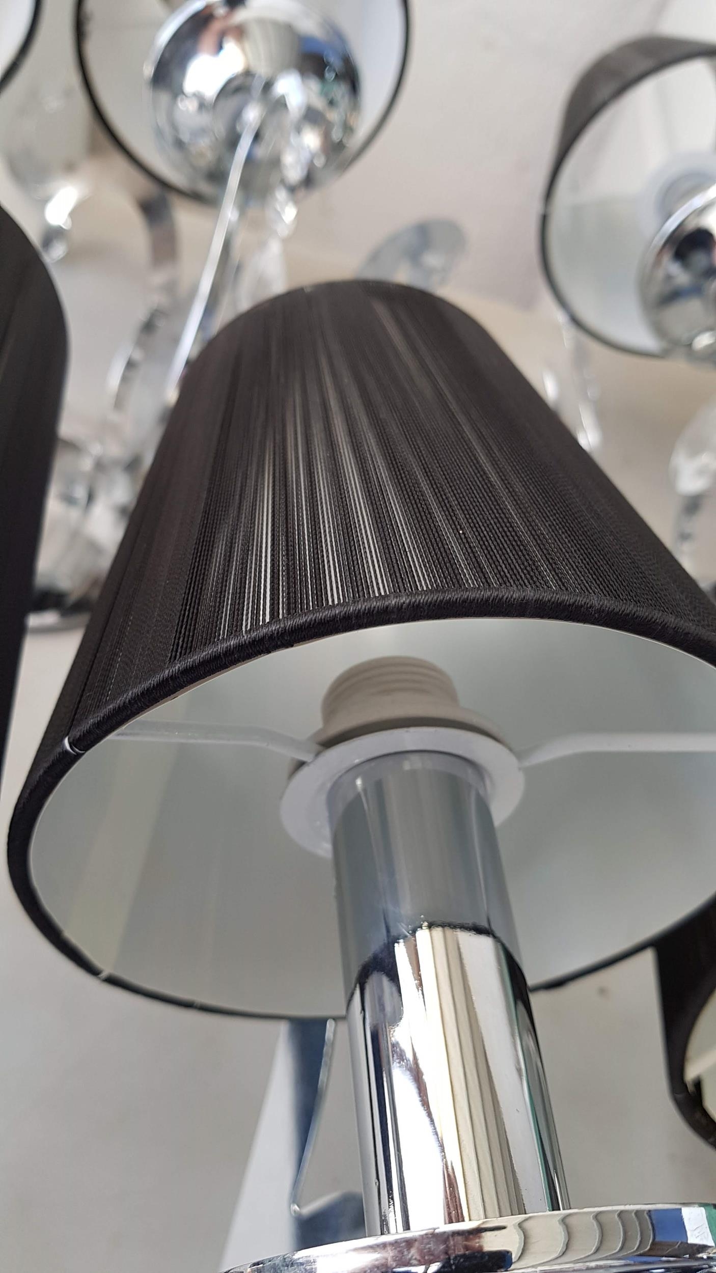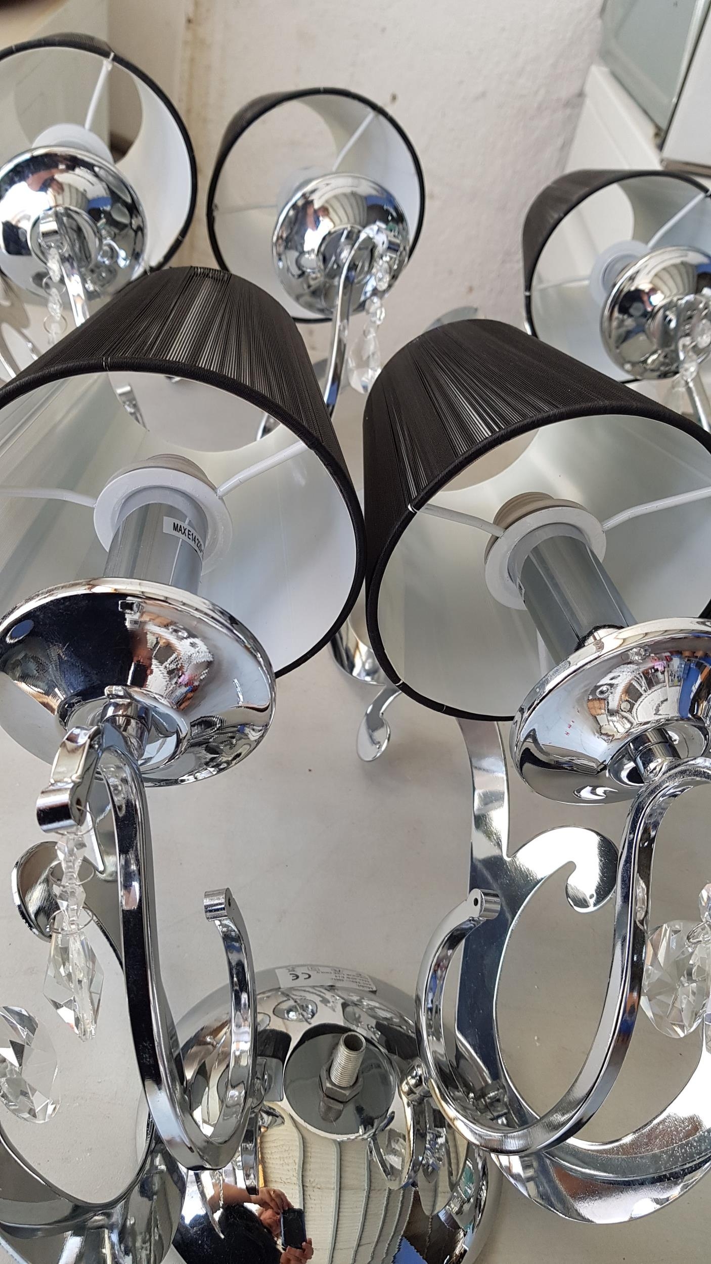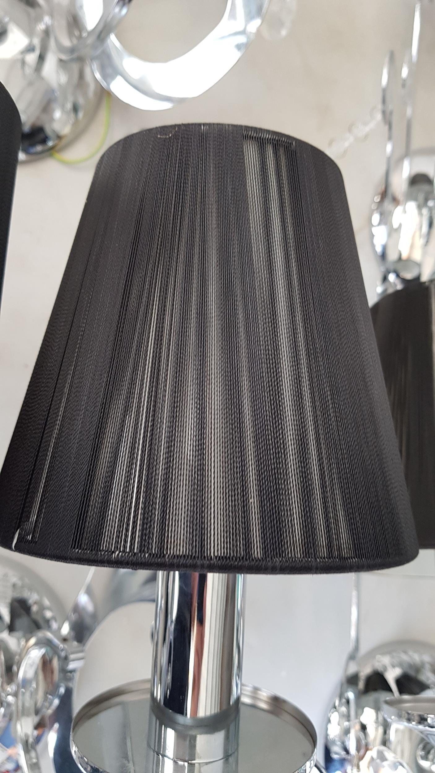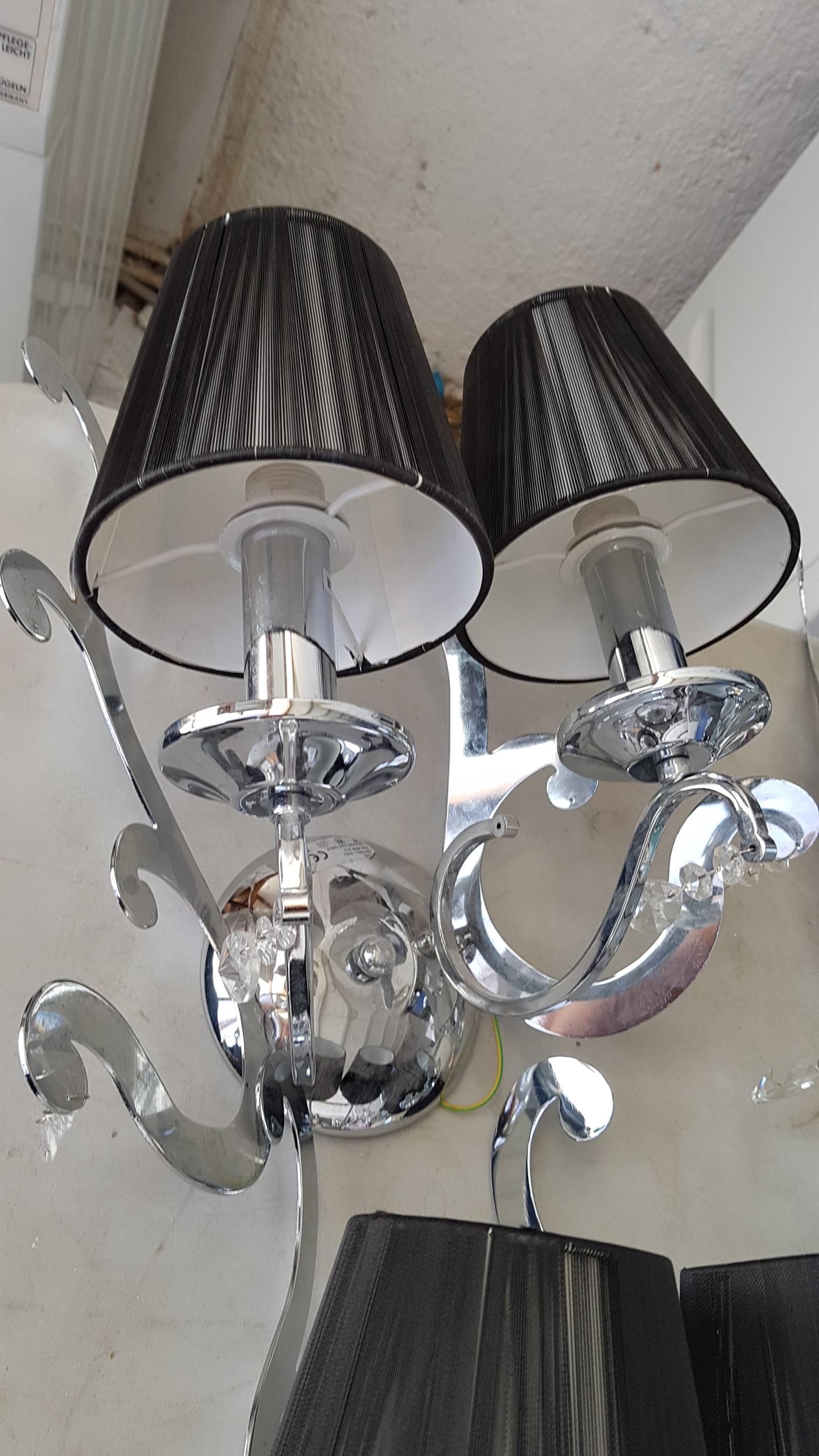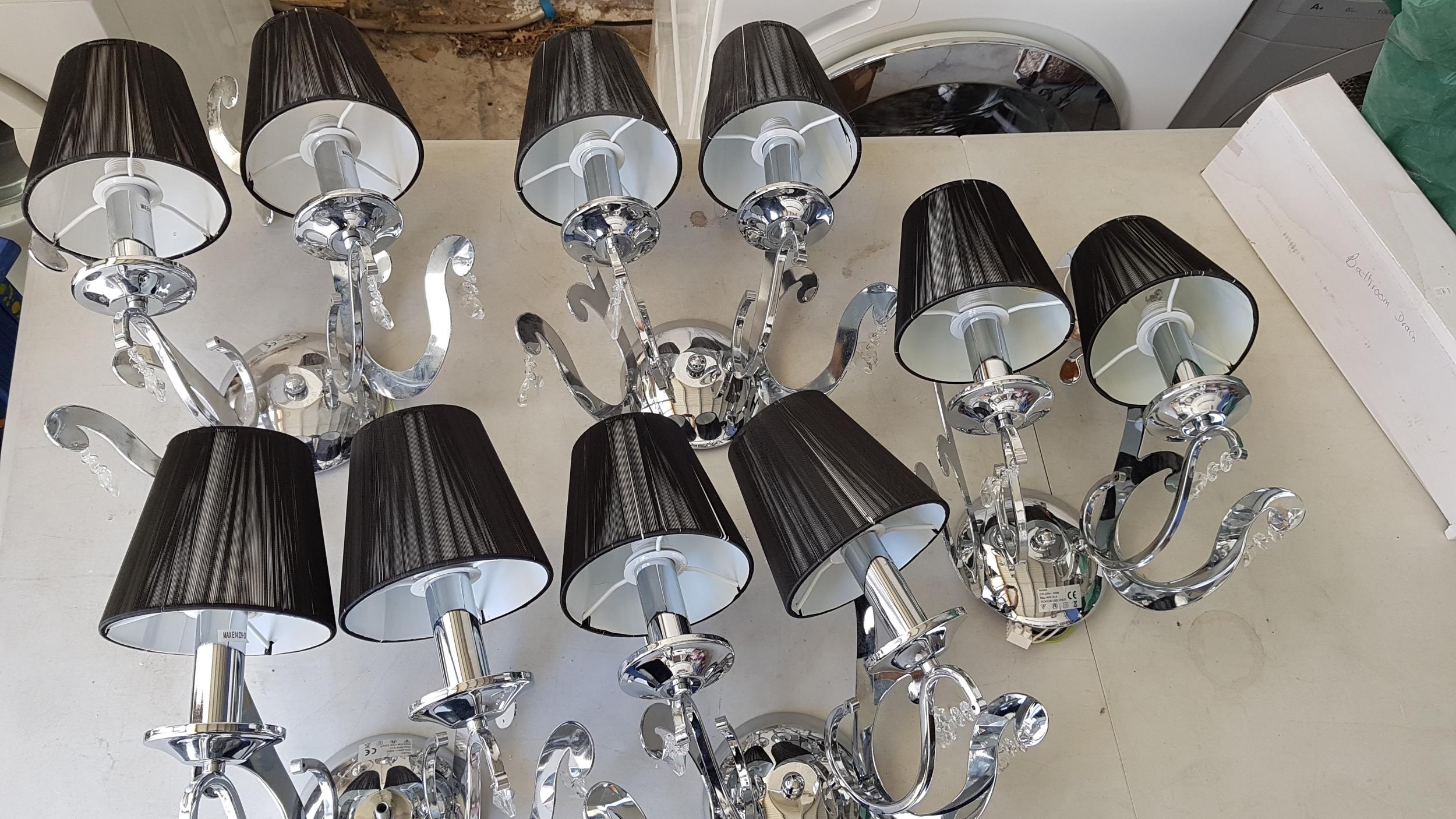 5 x 2- Arms Kumina Decor Modern Chrome / Black Wall Lights and Black Lampshades Decorated with Crystals (Some Missing), (Un-Tested, A/F)