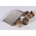 Art Deco style silver cigarette case by Joseph Gloster Ltd Birmingham 1942, a pair of square silver napkin rings by Robert Pringle & Sons, Birmingham 1933 and two other silver napkin rings, 368g gross