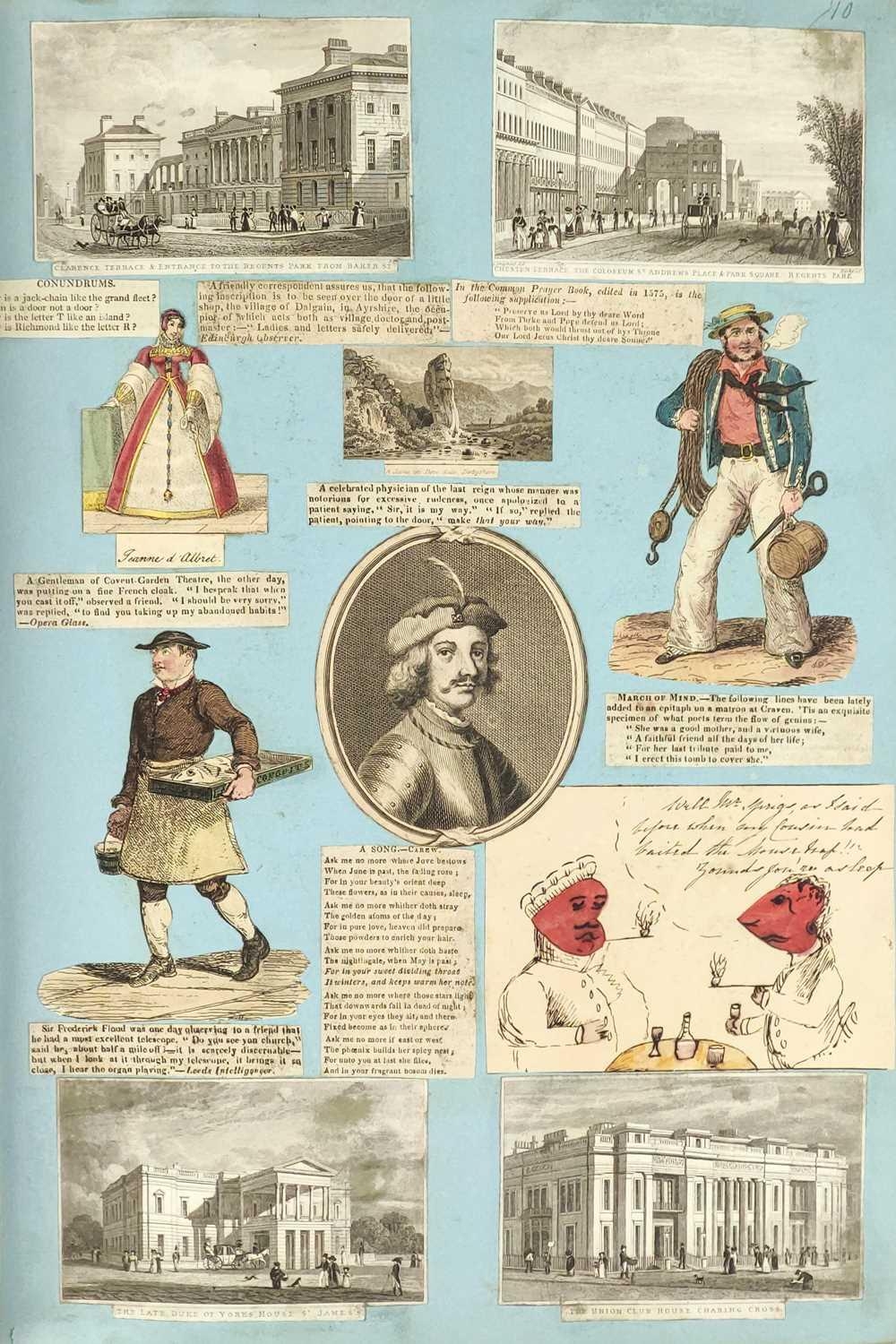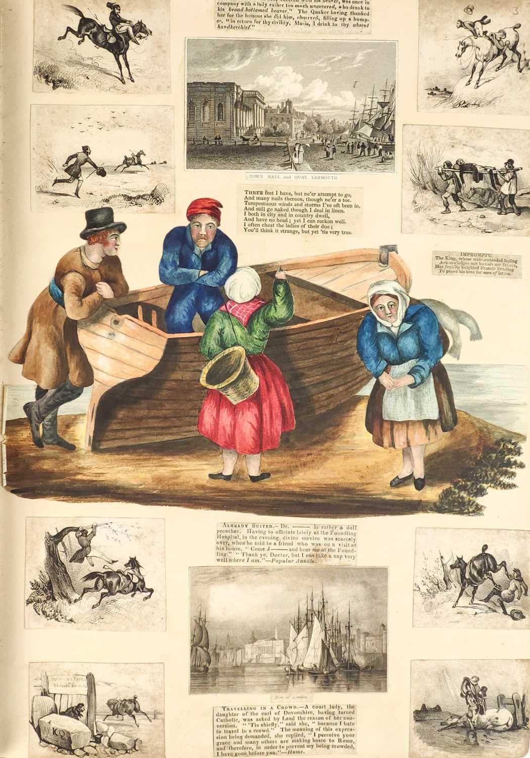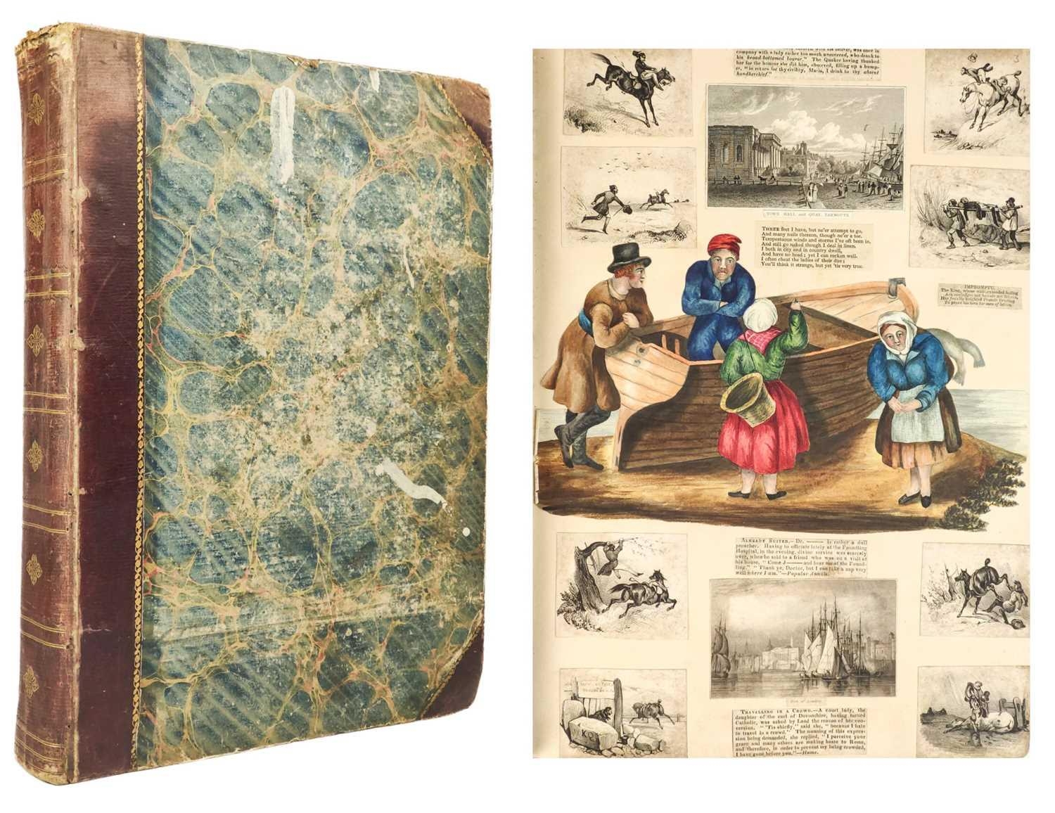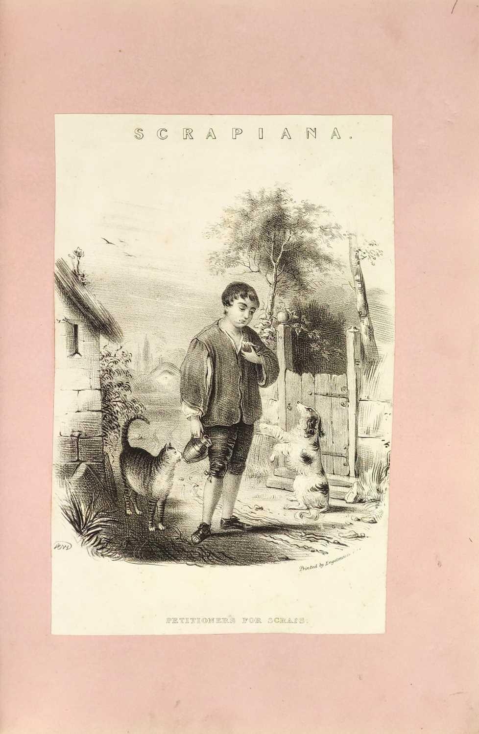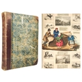 A Victorian Scrap Album Contemporary half maroon leather with marbled boards, over a hundred pages profuse in engravings, cuttings, chromo scraps, greetings cards, original artwork; showing portraits, cityscapes, boxing, cricket, domestic scenes, topography etc, ink owner signature to front pastedown, a great collection in a fine condition, [c.1896].