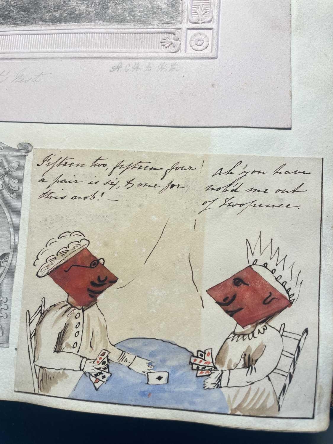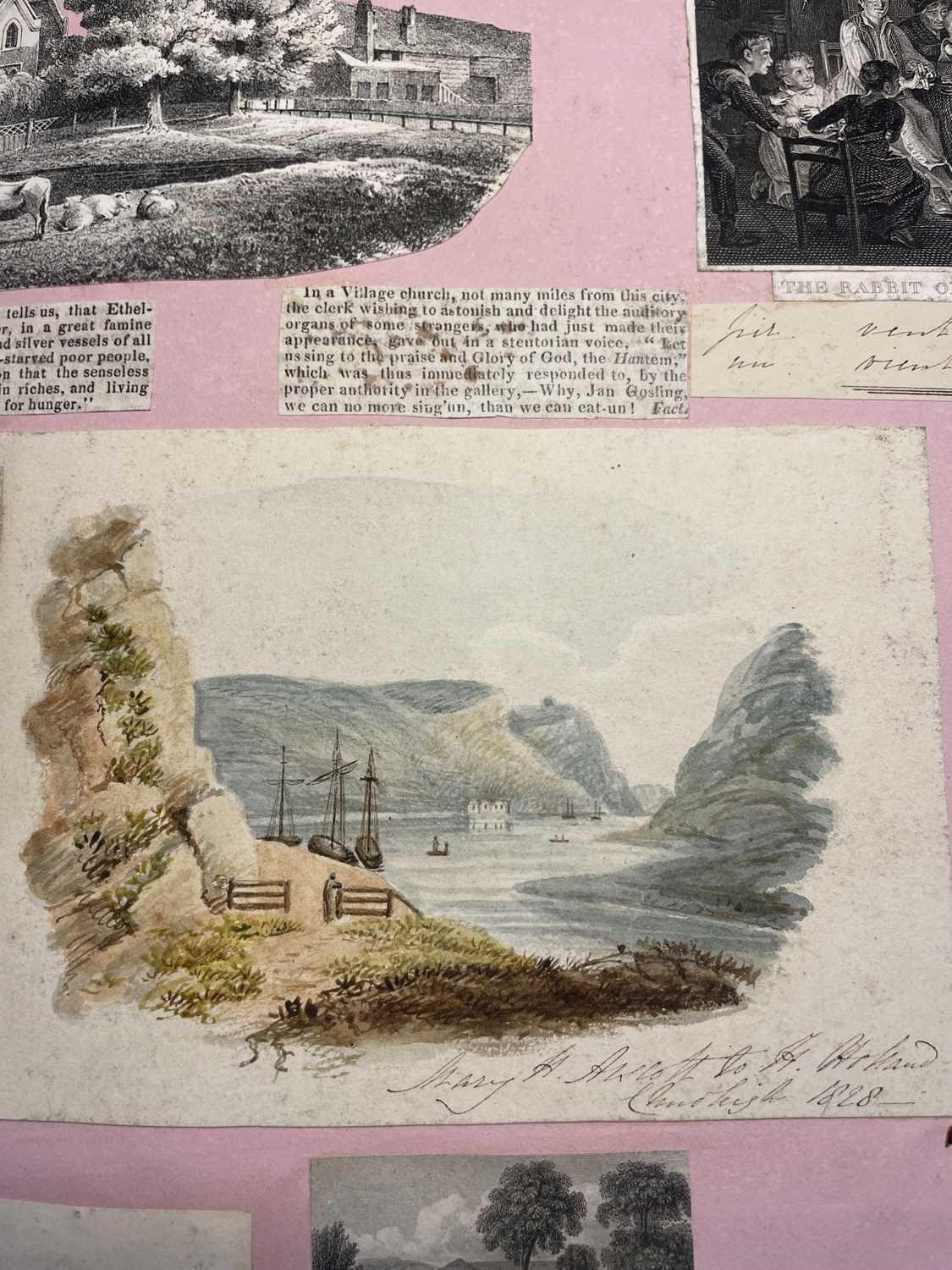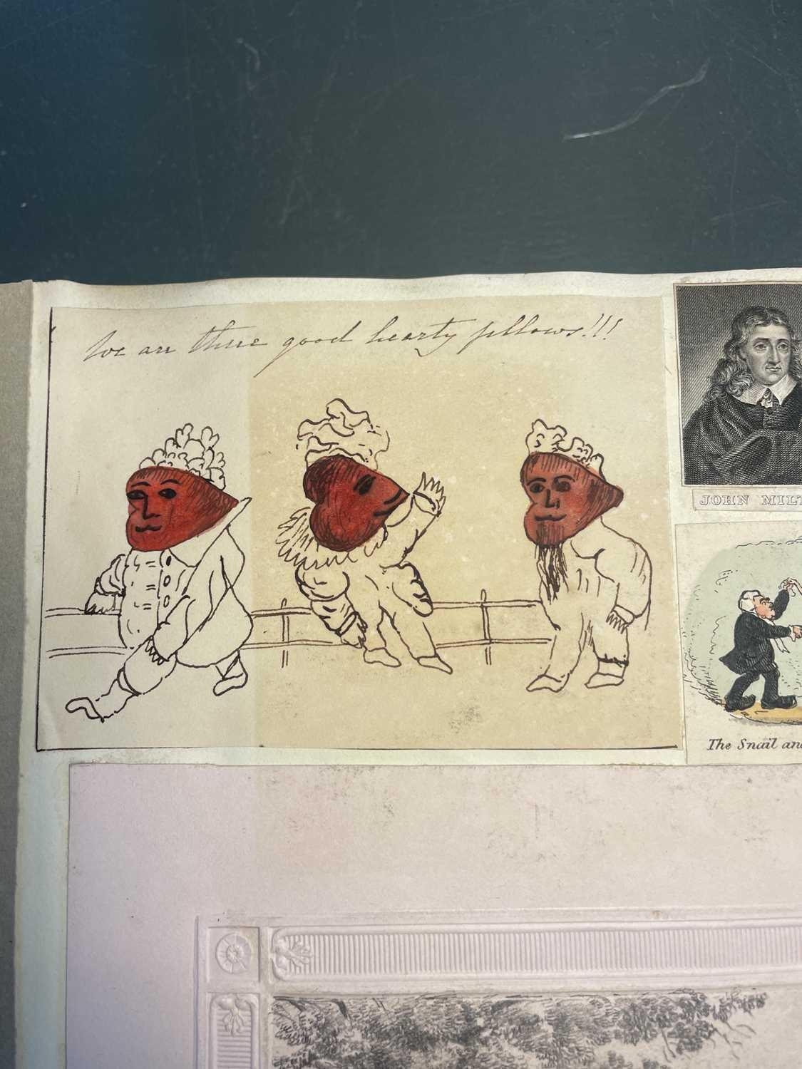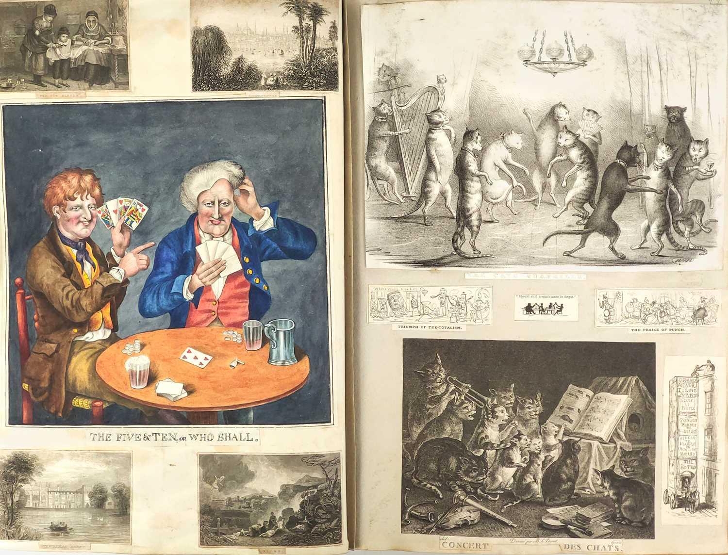 A Victorian Scrap Album Contemporary half maroon leather with marbled boards, over a hundred pages profuse in engravings, cuttings, chromo scraps, greetings cards, original artwork; showing portraits, cityscapes, boxing, cricket, domestic scenes, topography etc, ink owner signature to front pastedown, a great collection in a fine condition, [c.1896].