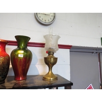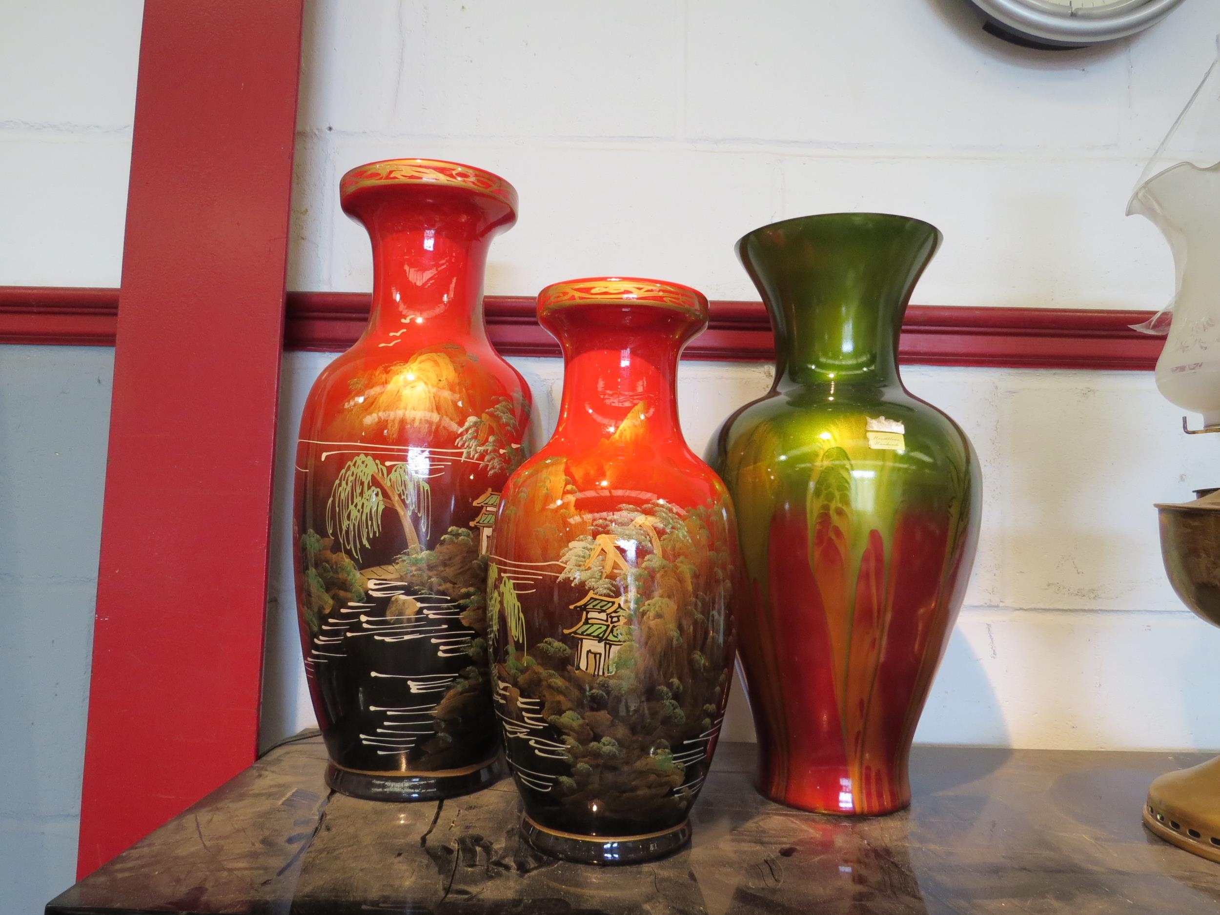 A graduated pair of Oriental vases overpainted in red and a similar glass example (3)