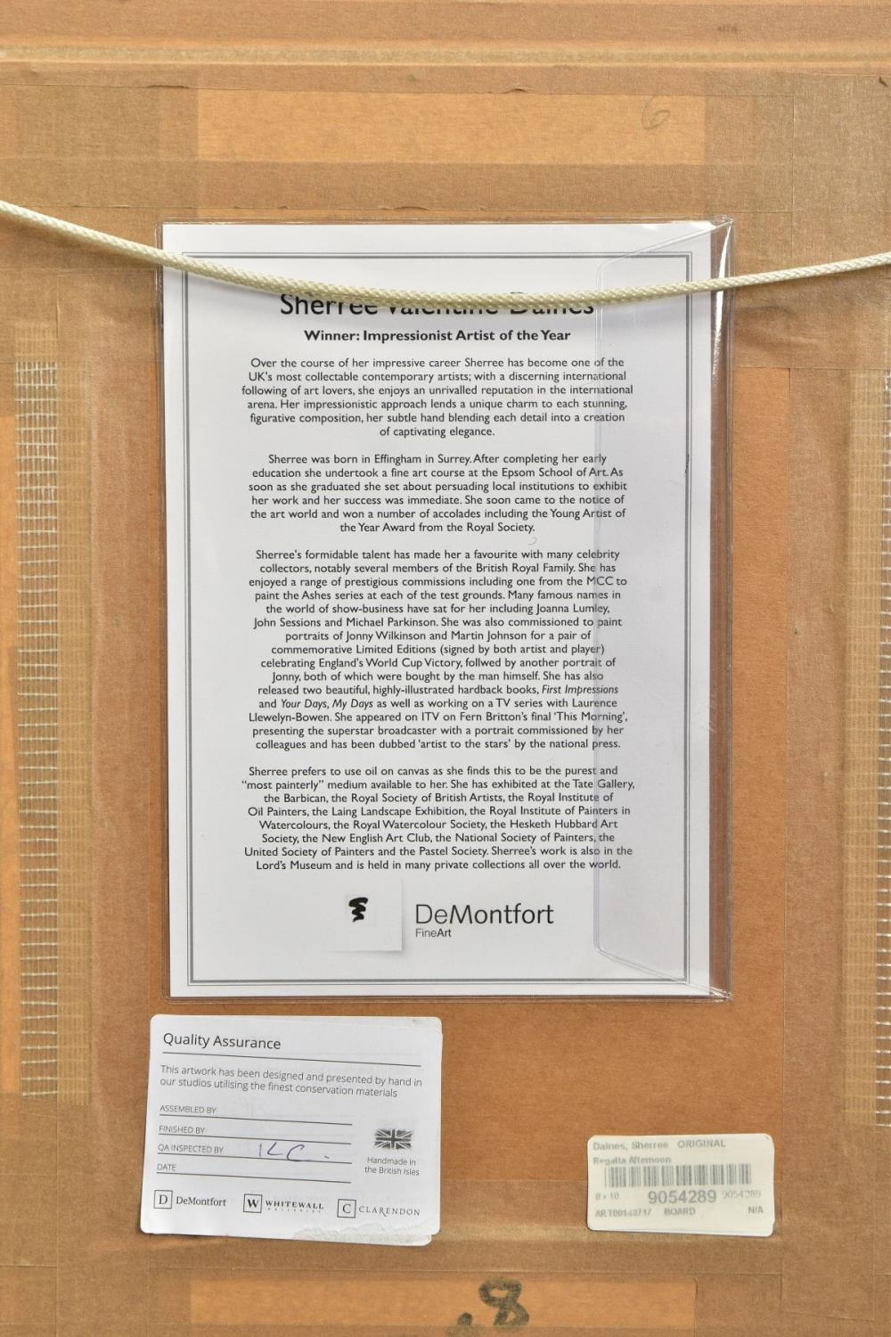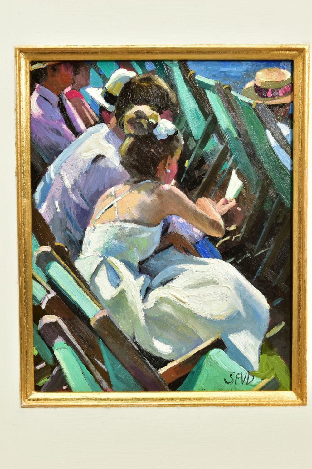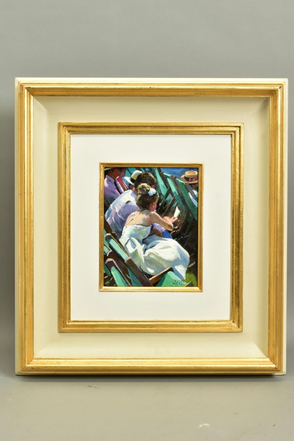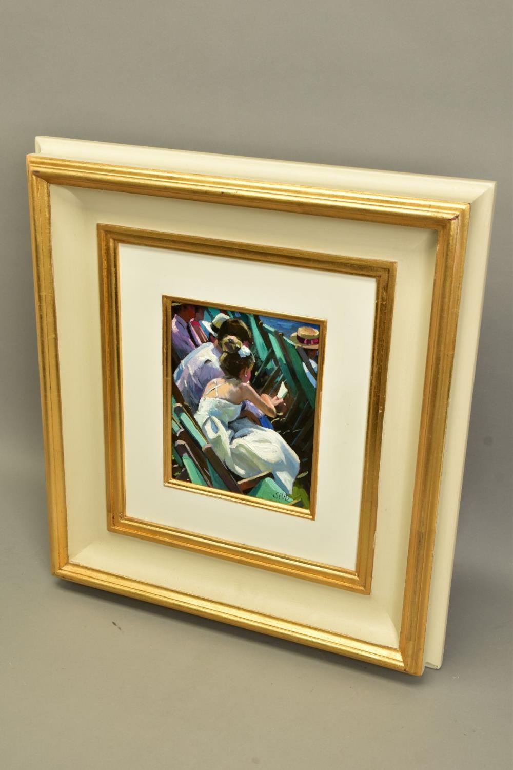 SHERREE VALENTINE DAINES (BRITISH 1959) 'REGATTA AFTERNOON', figures sitting in deckchairs beside the Thames, initialled bottom right, oil on board, approximate sizes - image 24cm x 19cm frame 60cm x 55cm, condition: The painting is in good condition, some overpainting and dirty marks to the frame (artist resale rights apply)