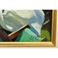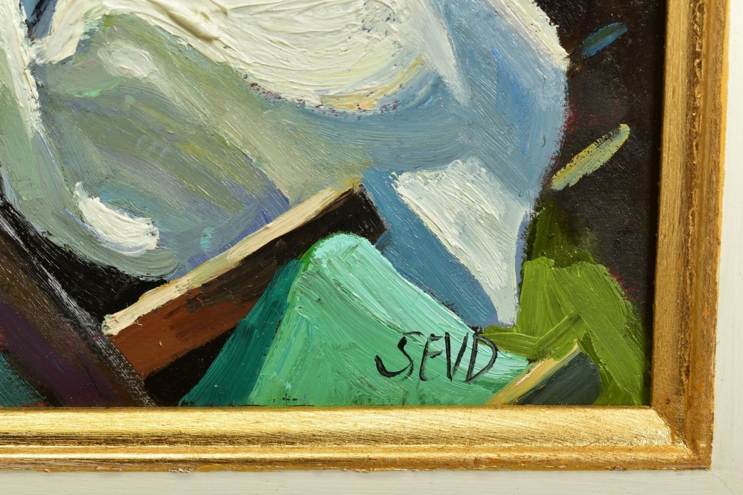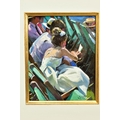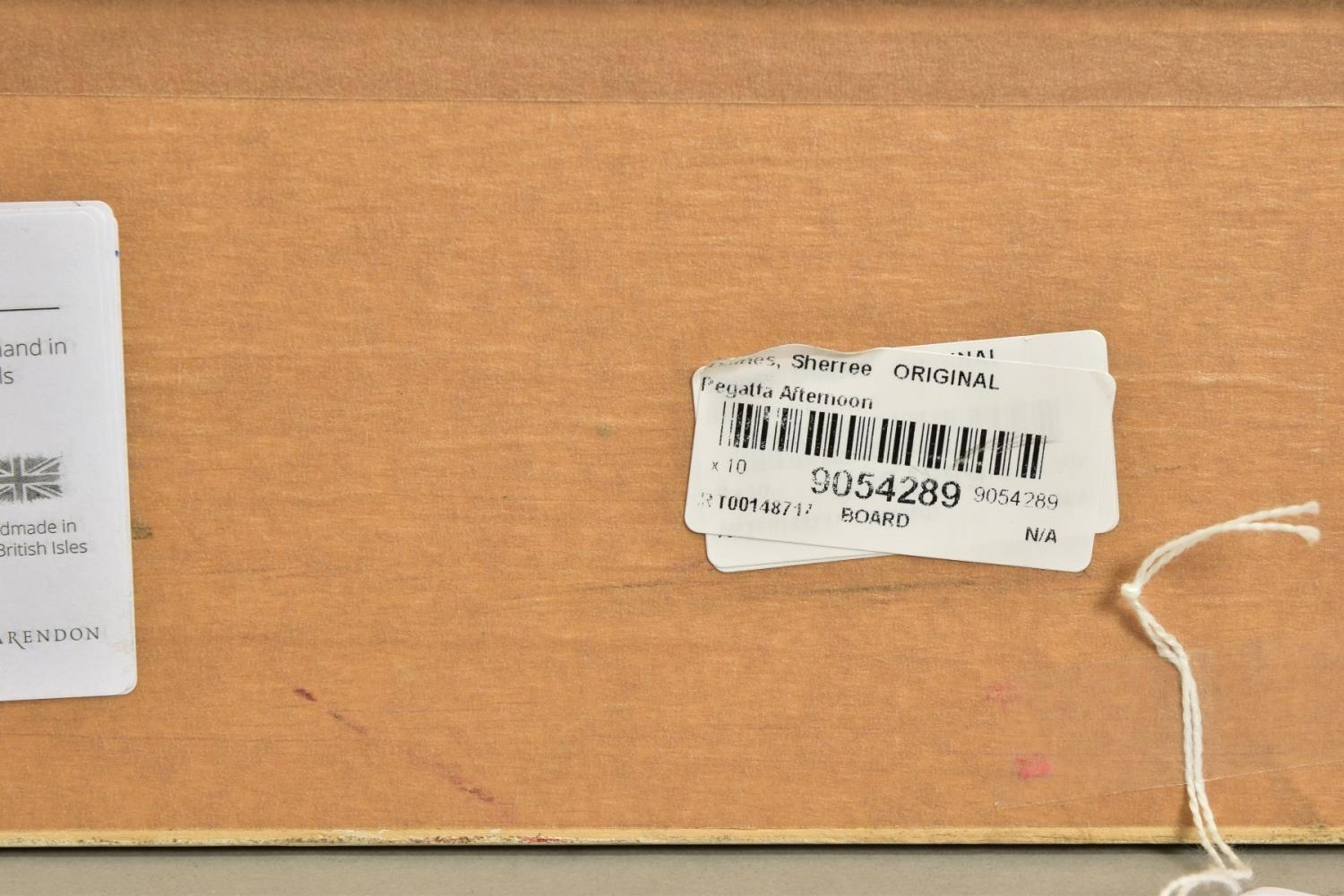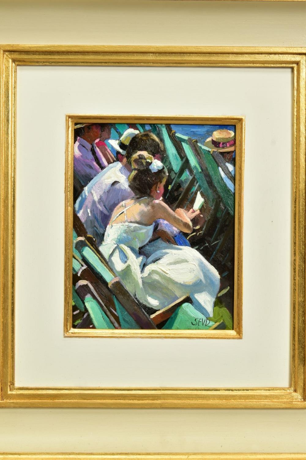 SHERREE VALENTINE DAINES (BRITISH 1959) 'REGATTA AFTERNOON', figures sitting in deckchairs beside the Thames, initialled bottom right, oil on board, approximate sizes - image 24cm x 19cm frame 60cm x 55cm, condition: The painting is in good condition, some overpainting and dirty marks to the frame (artist resale rights apply)