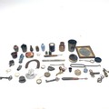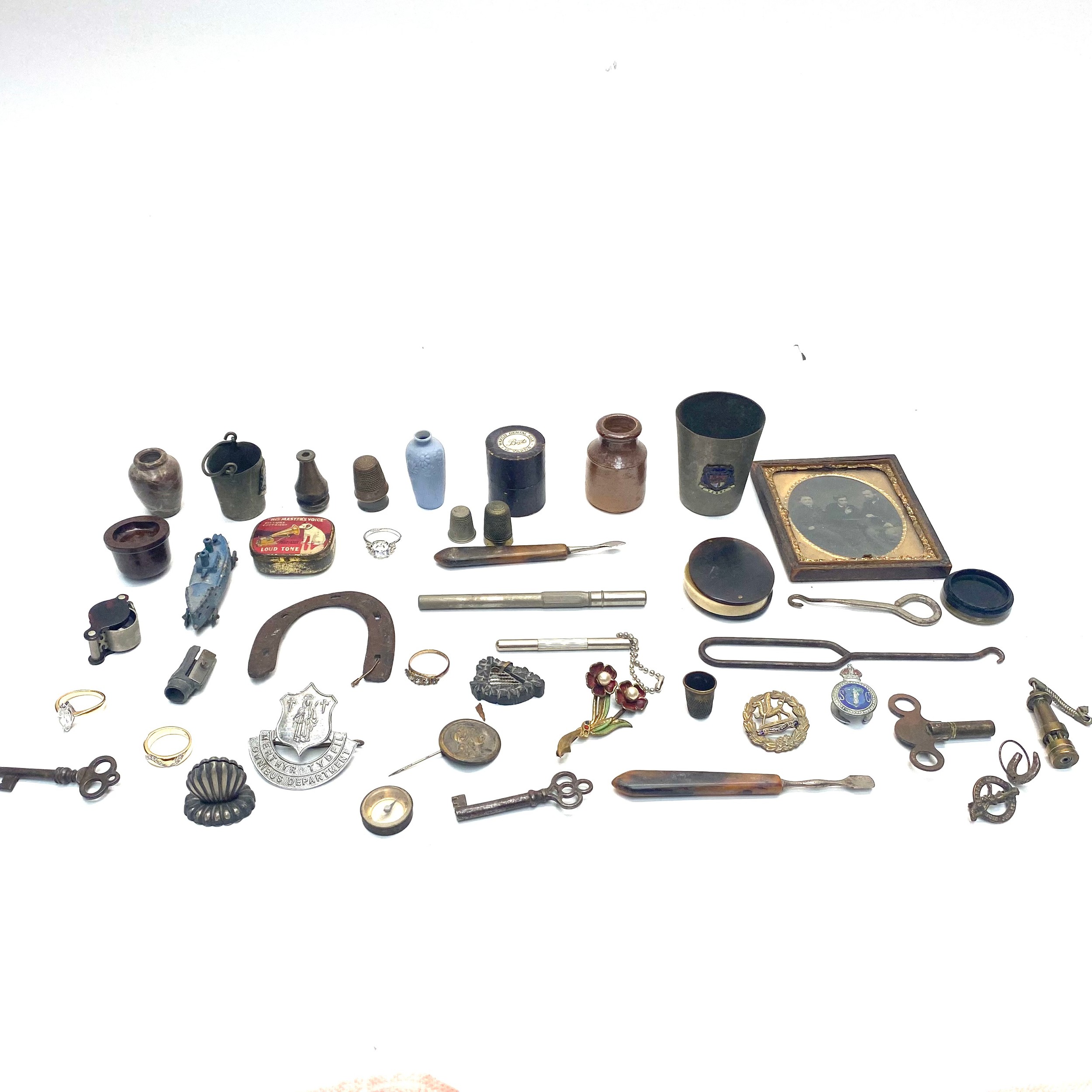 Mixed collectibles including Bakelite and Merthyr Tydfil badges.