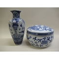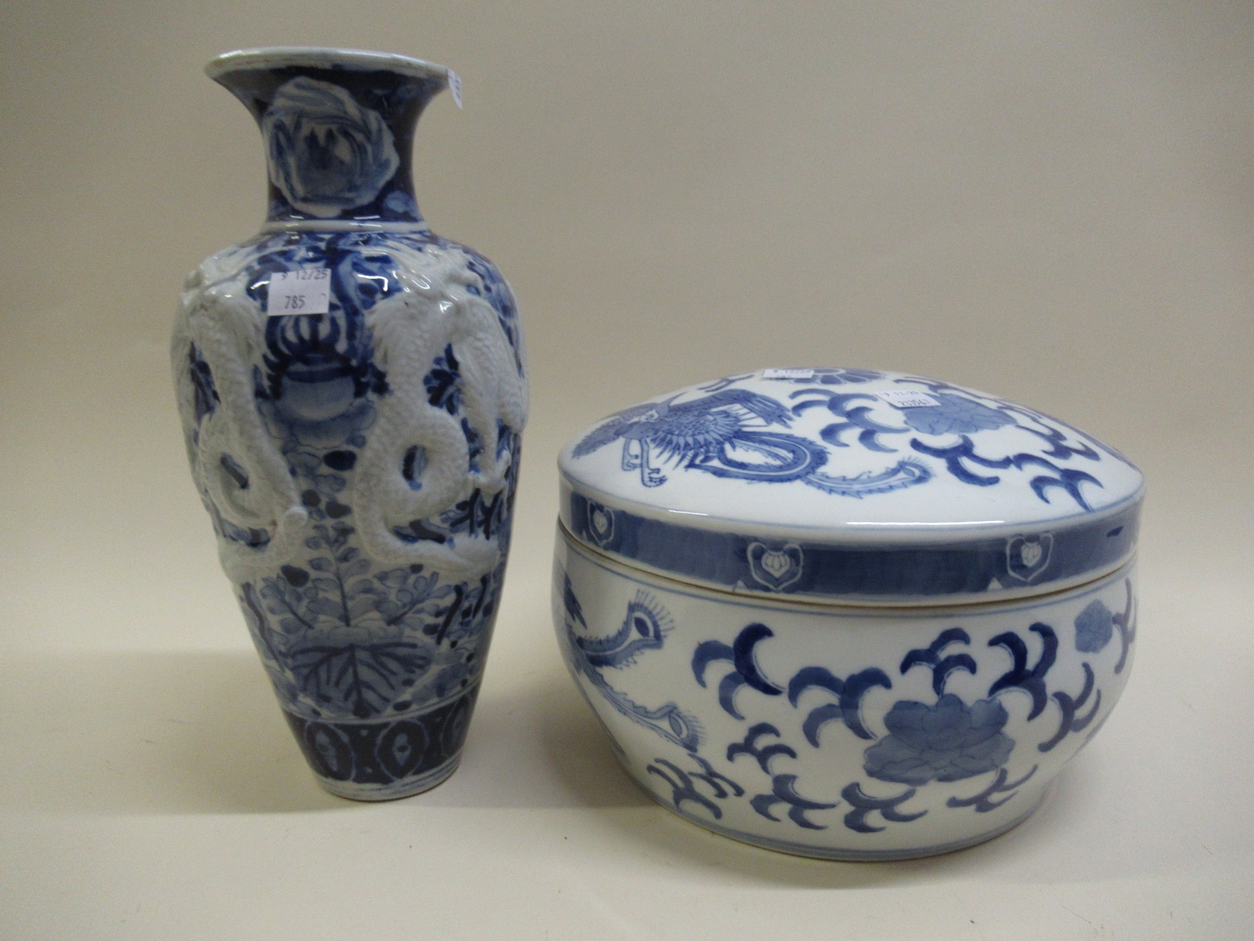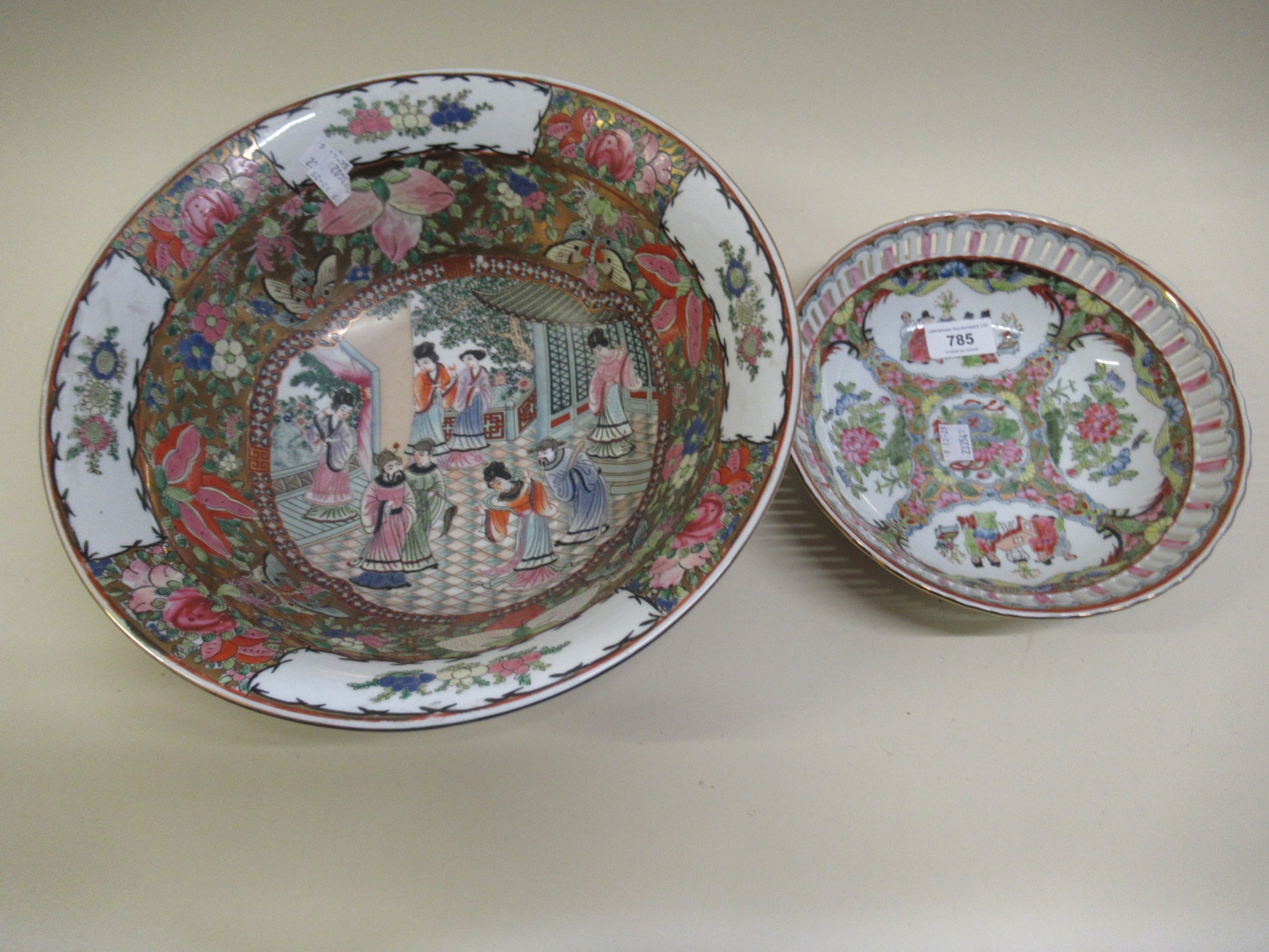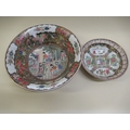 20th Century Chinese figure and floral decorated bowl, 33cm diameter, together with a smaller bowl with pierced edge and a circular blue and white pottery tureen with cover and a blue and white dragon decorated vase