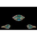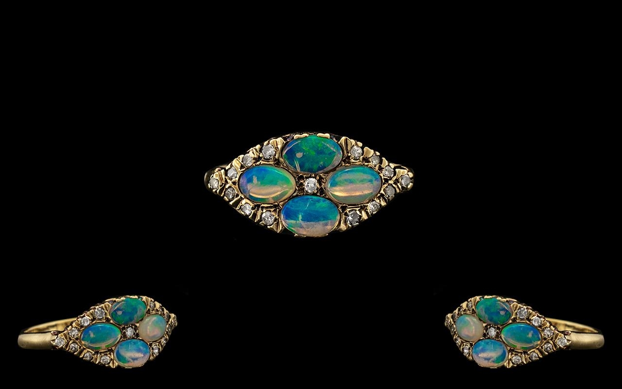 Ladies 9ct Gold Attractive Diamond and Opal Set Dress Ring of Pleasing Design. Fully Hallmarked London 1979. The Cabochon Cut Opals of Excellent Colour. Ring Size V - Large Size. All Aspects of Condition Are Excellent, Including Shank and Setting.