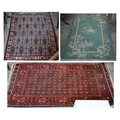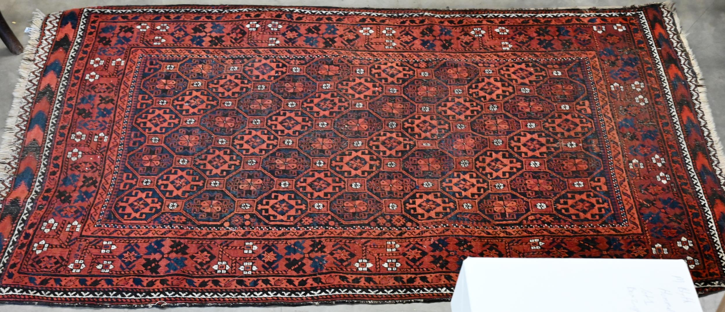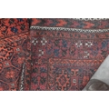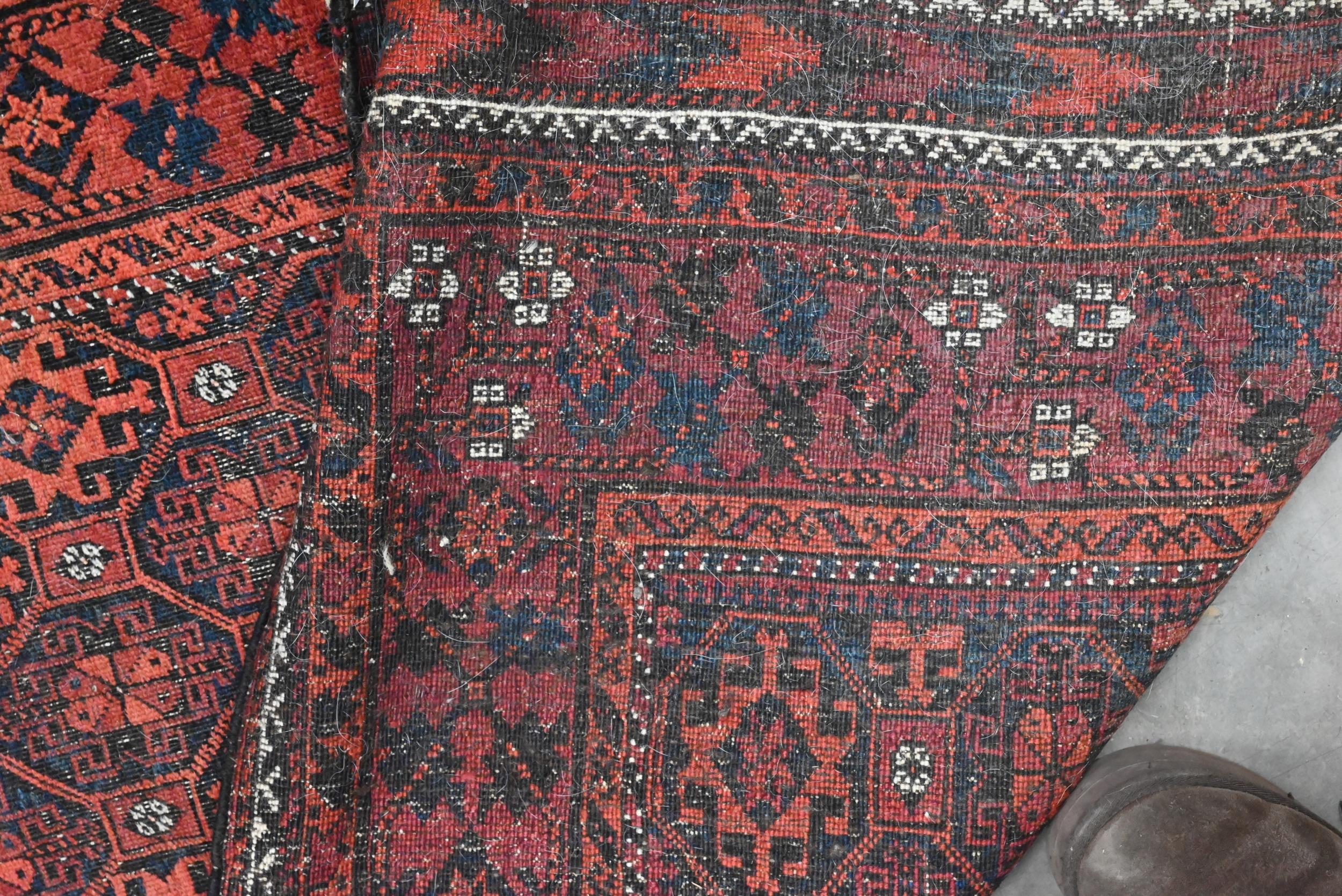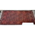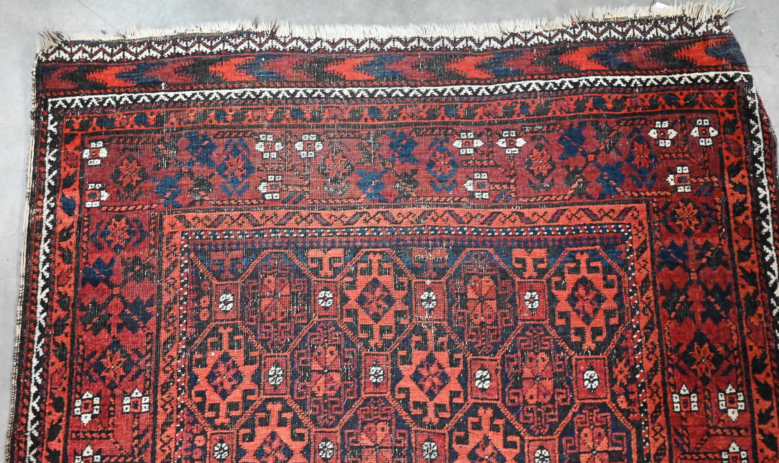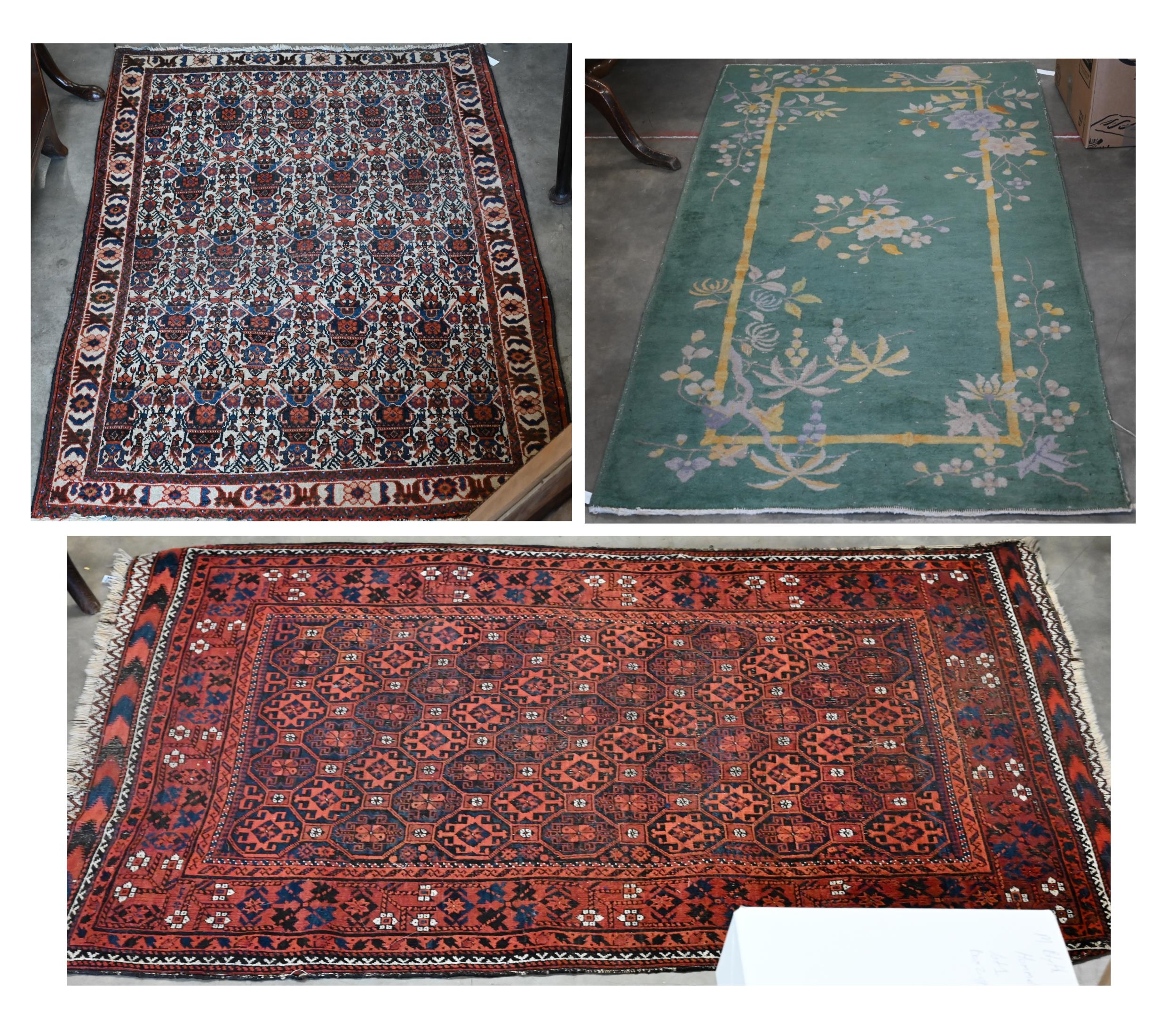 A vintage Persian Balouch rug with tessalating octagonal motif on red ground, 176 x 96 cm to/w a Persian Abedeh beige ground floral rug, 148 x 104 cm and another floral green wool rug (3)