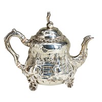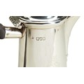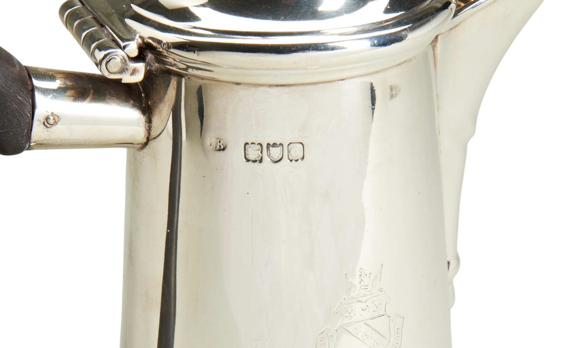 A large hot water/milk jug in George I style engraved with a coat of arms, crest and motto